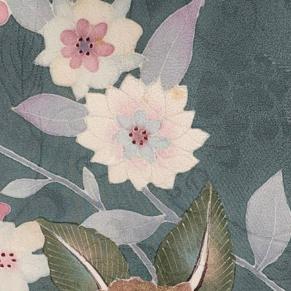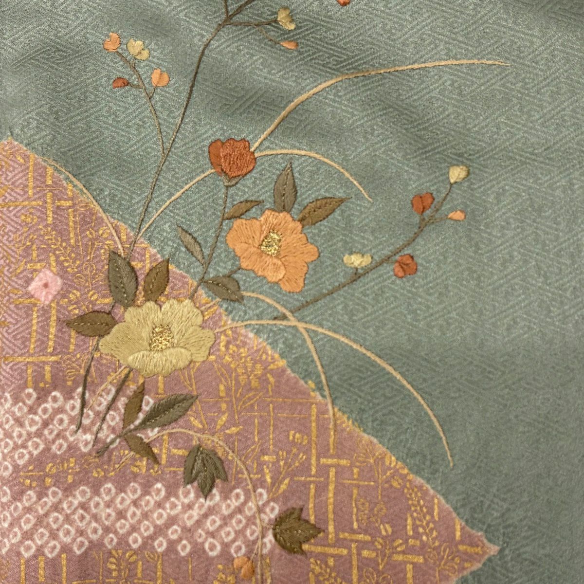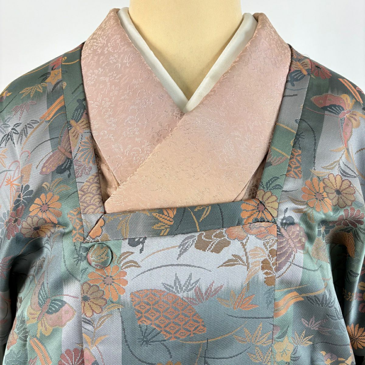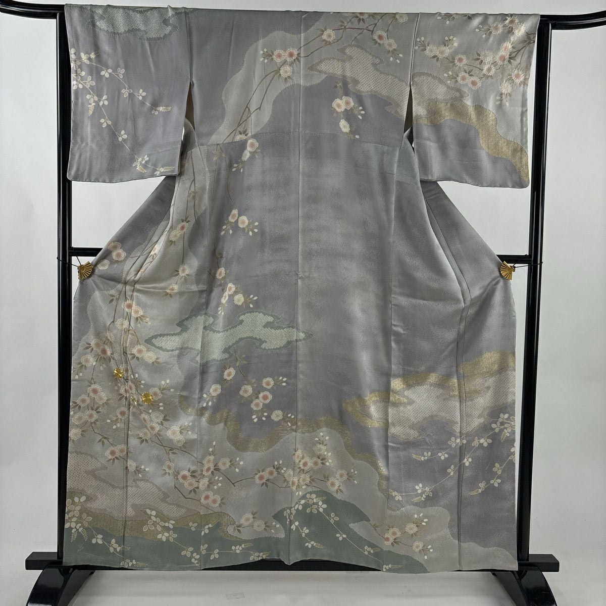 50%OFF 訪問着 身丈158.5cm 裄丈65cm M 袷 草花 地紋 金彩 灰緑 正絹 秀品 一つ紋 K50
