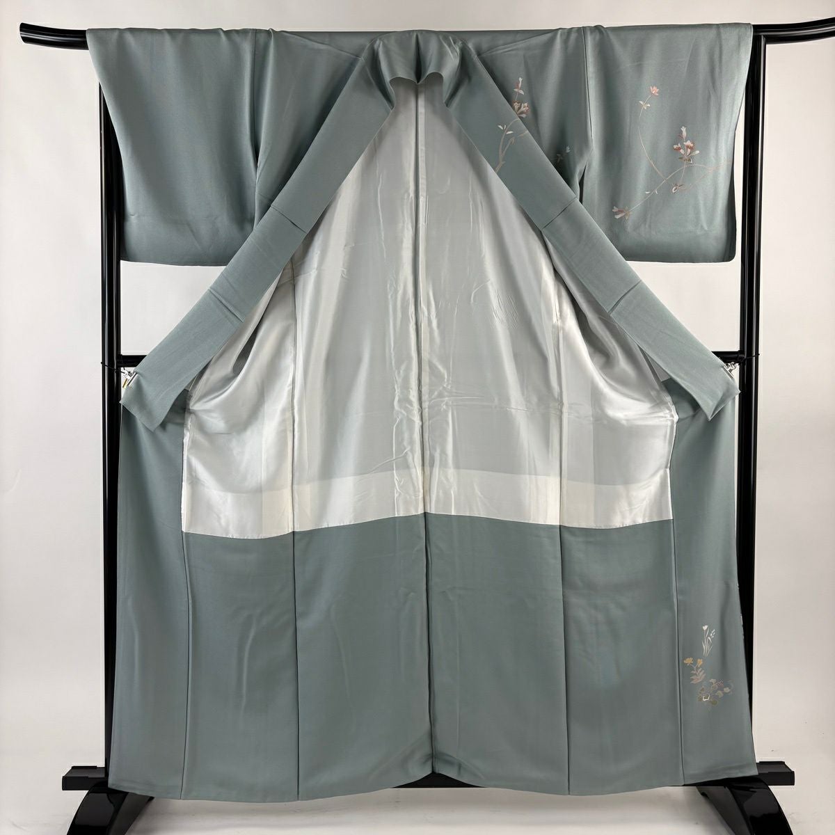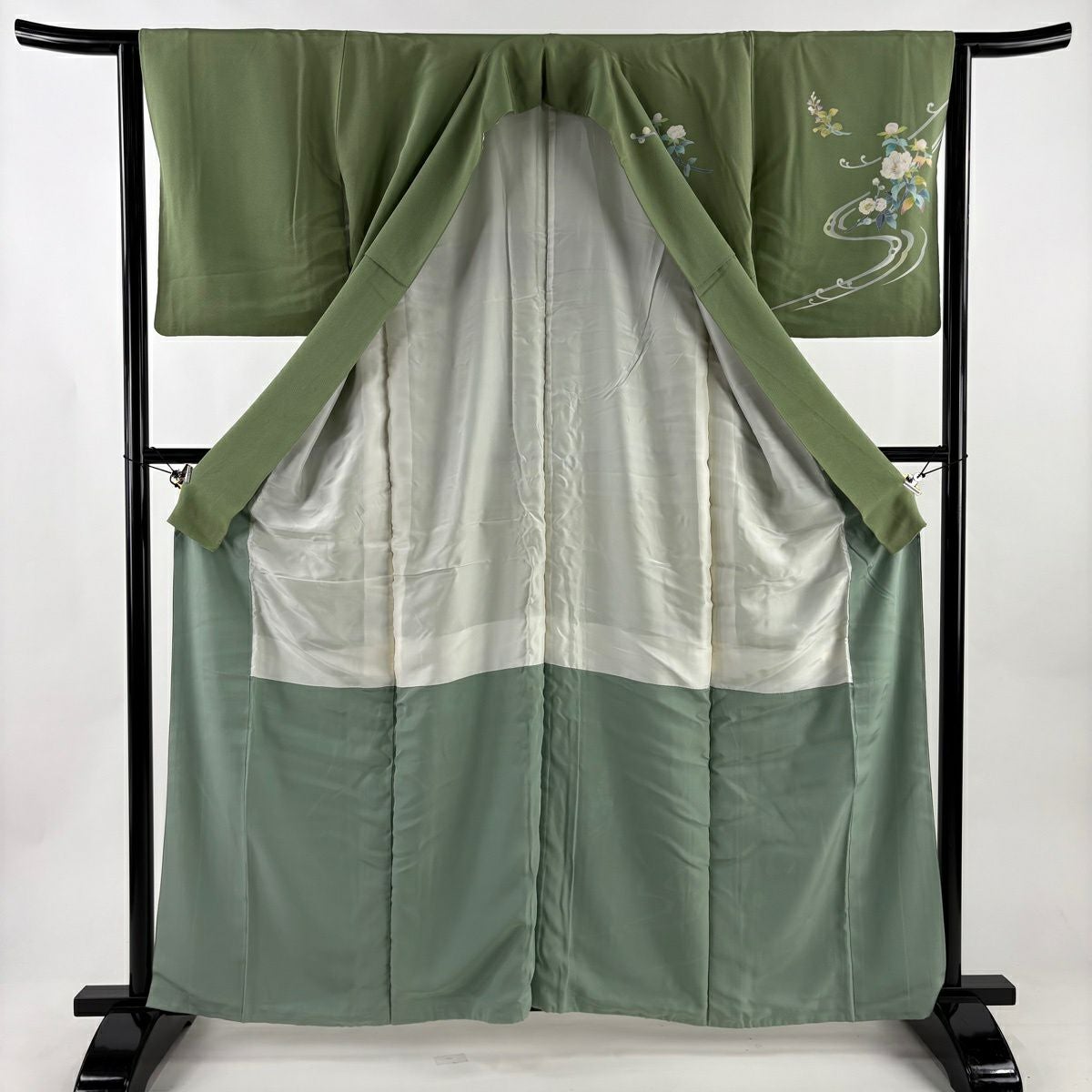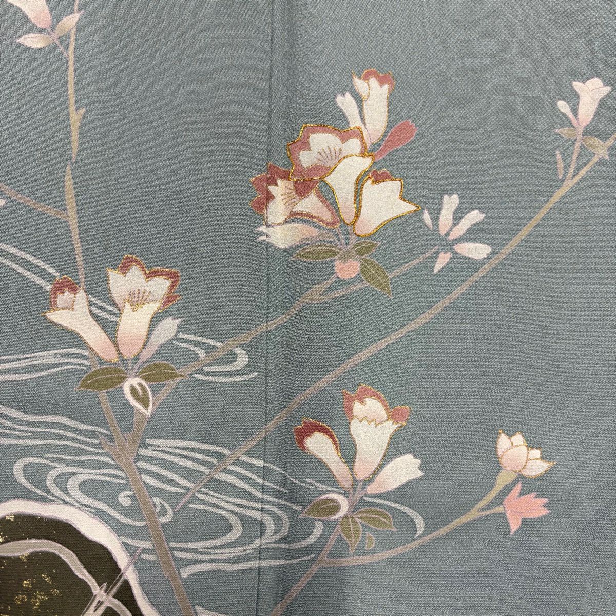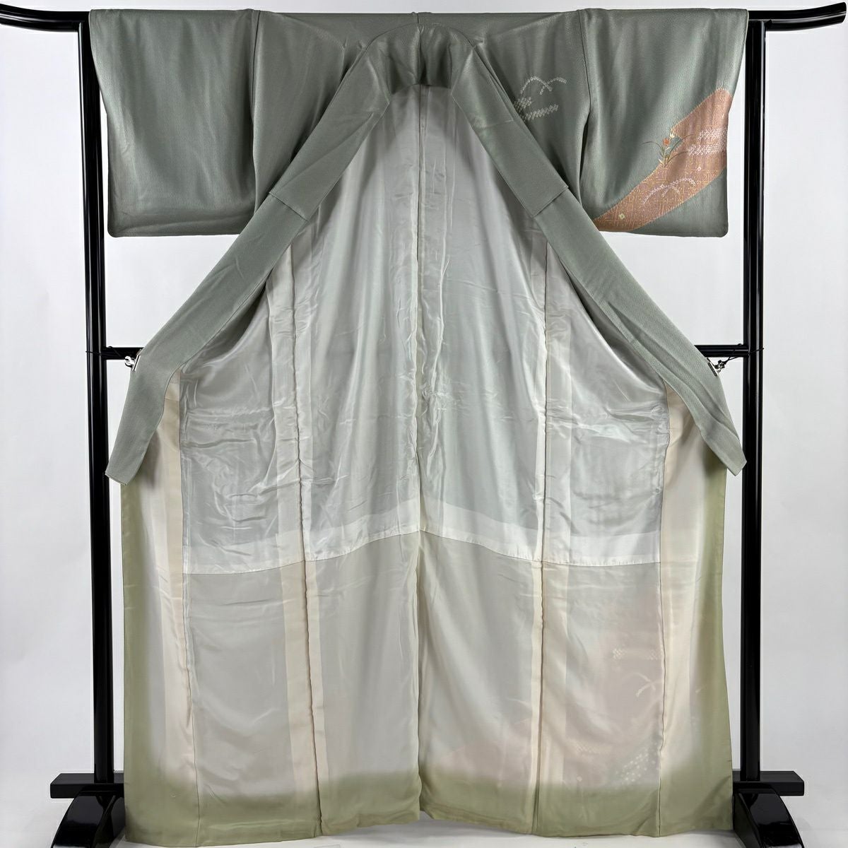 50%OFF 訪問着 身丈159.5cm 裄丈65cm M 袷 草花 流水 刺繍 ぼかし 灰緑 正絹 秀品 K50