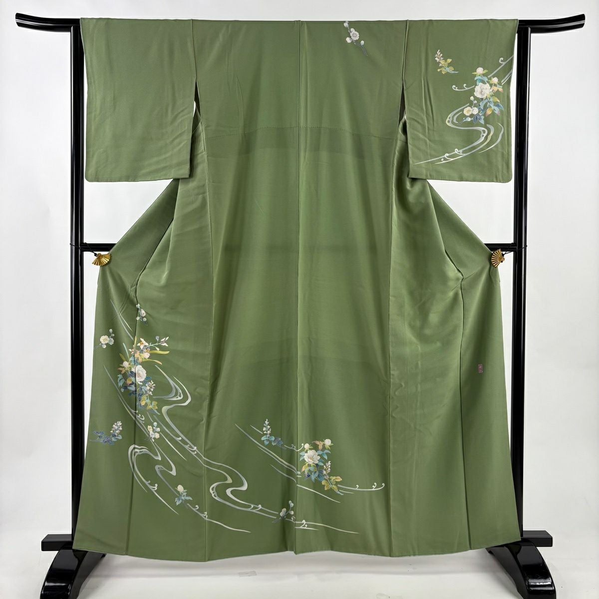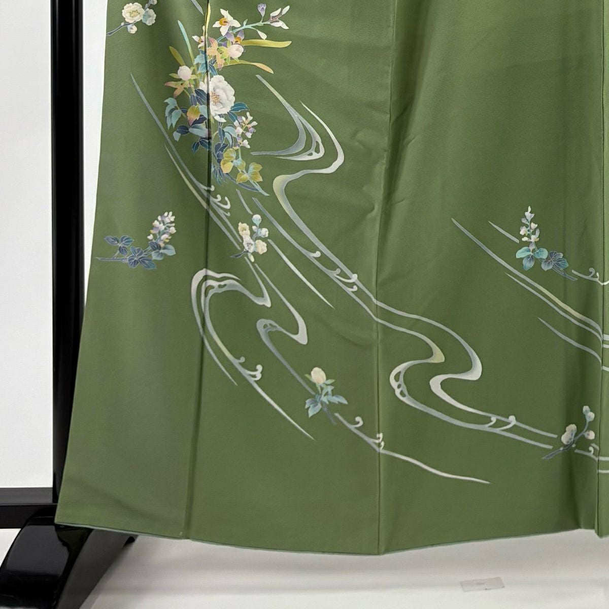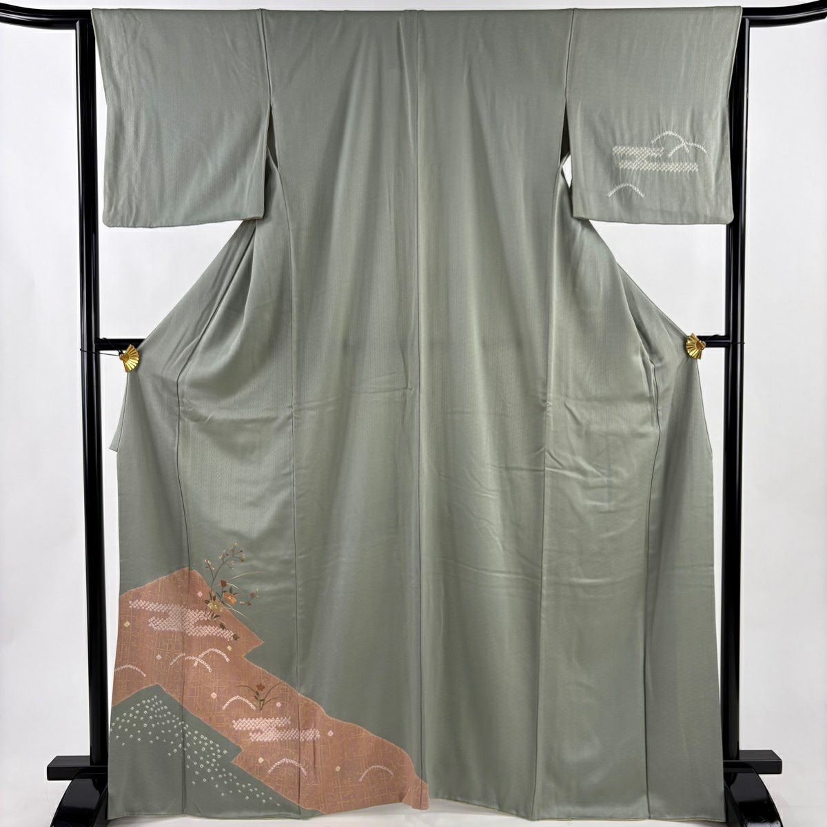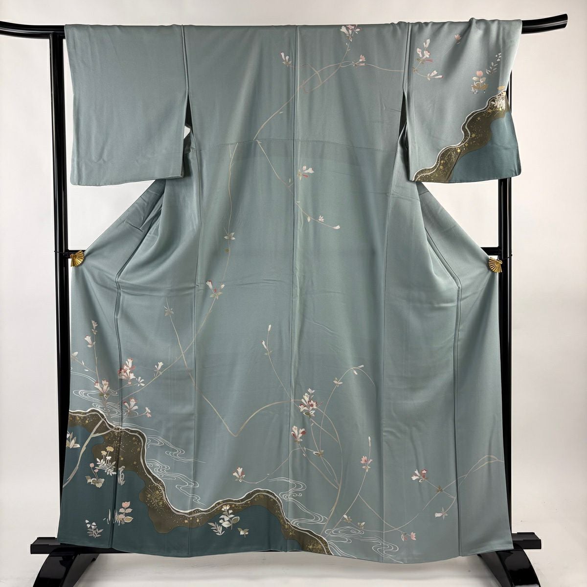 50%OFF 訪問着 身丈159.5cm 裄丈65cm M 袷 草花 流水 刺繍 ぼかし 灰緑 正絹 秀品 K50