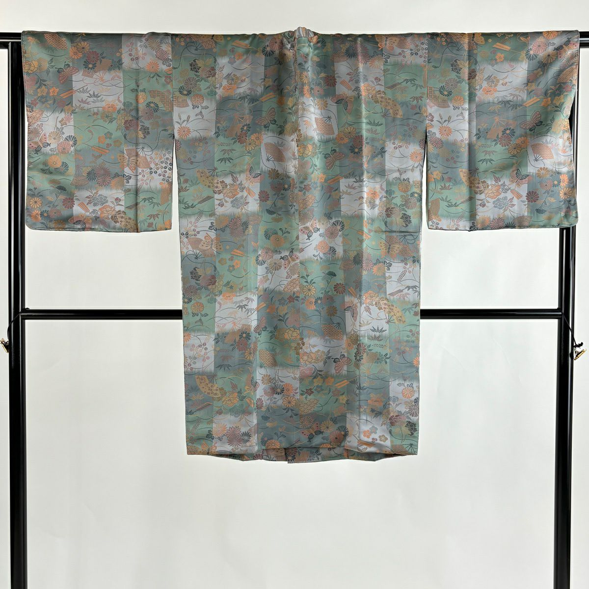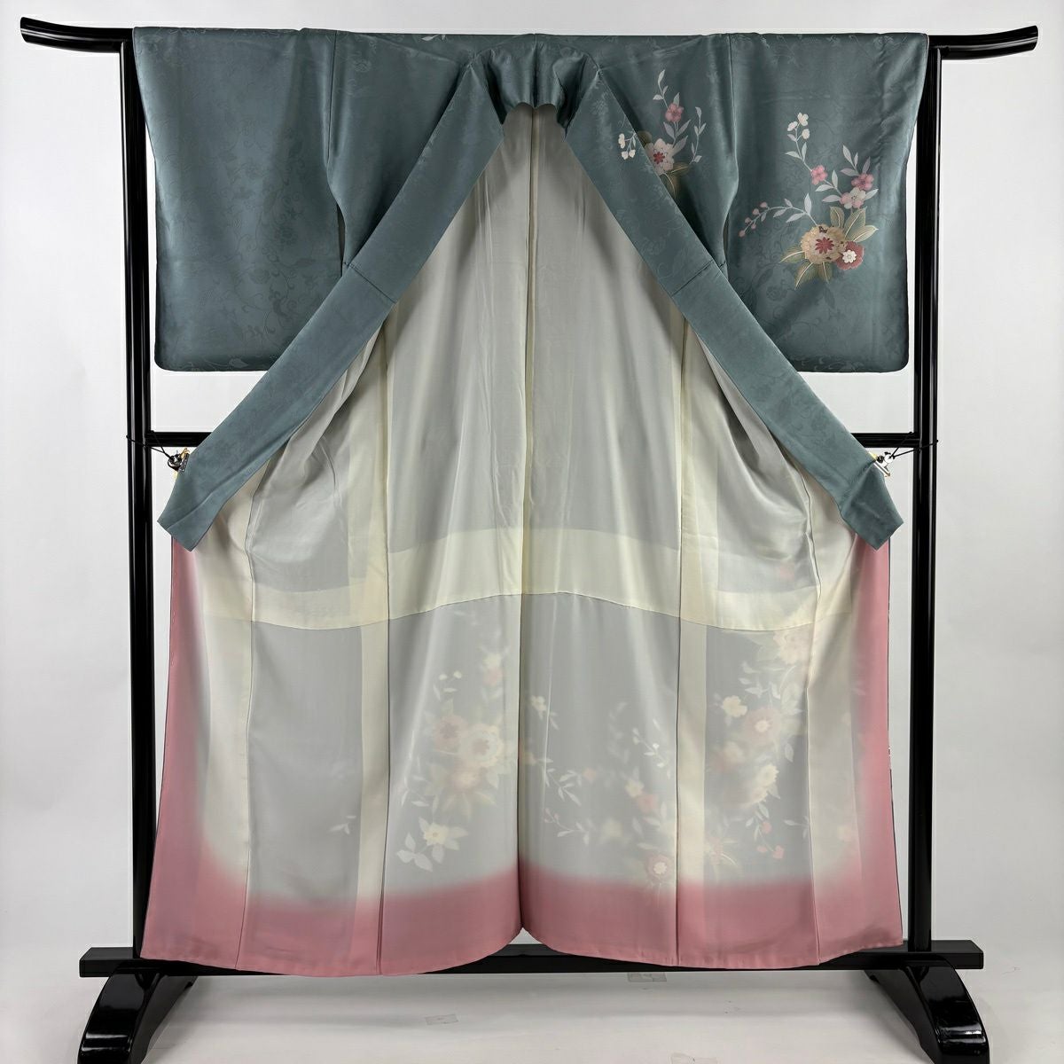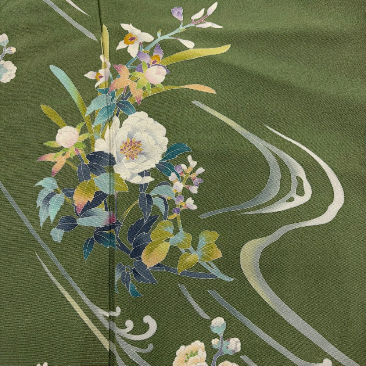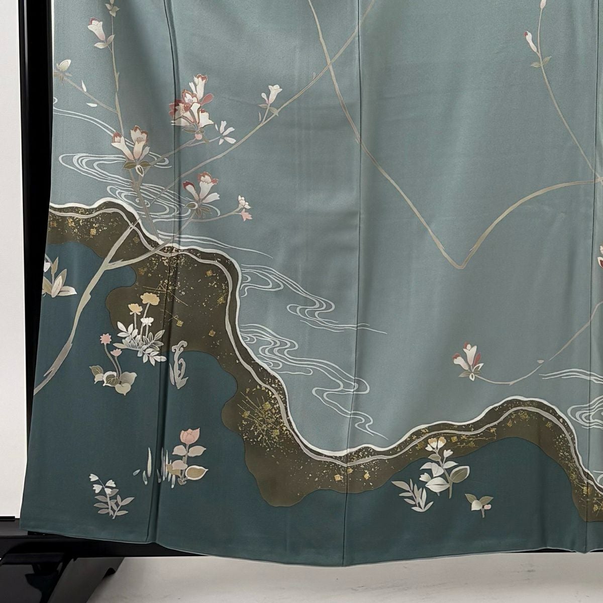 50%OFF 訪問着 身丈159.5cm 裄丈65cm M 袷 草花 流水 刺繍 ぼかし 灰緑 正絹 秀品 K50