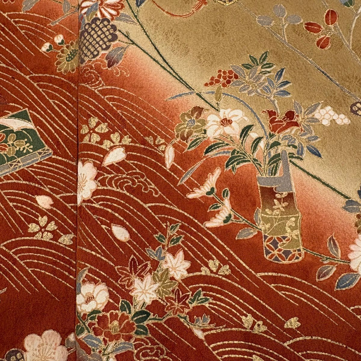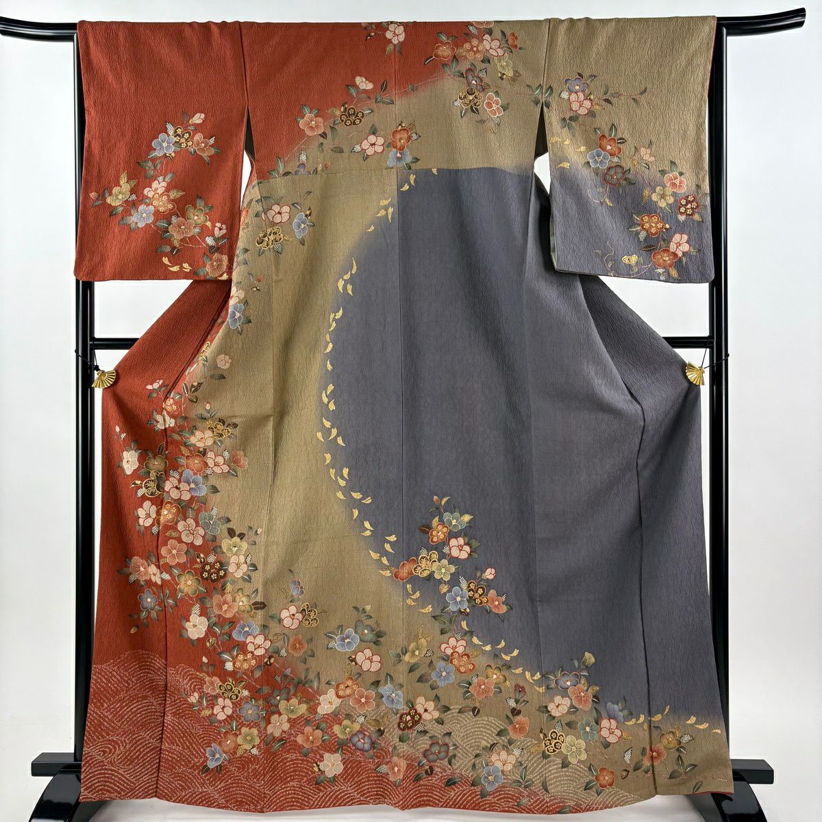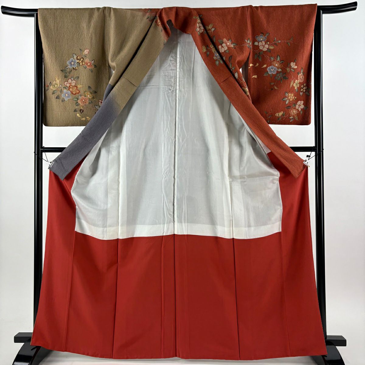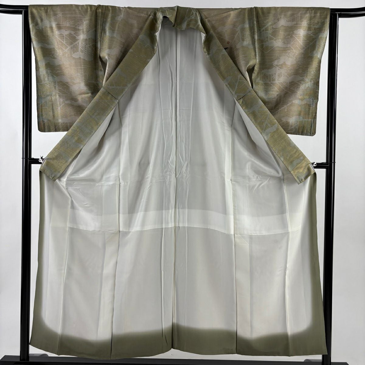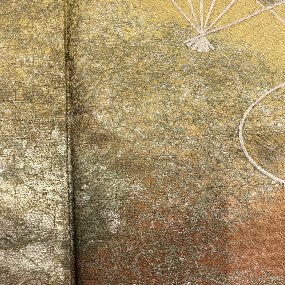 50%OFF 振袖 身丈163cm 裄丈66cm M 袷 花唐草 鶴 金彩 染め分け 茶緑色 正絹 秀品 K50
