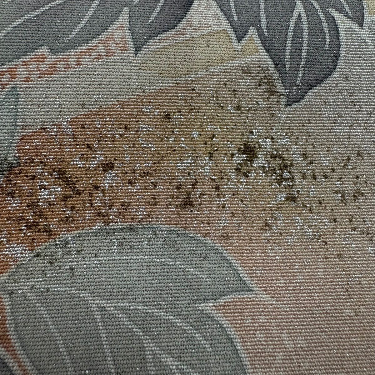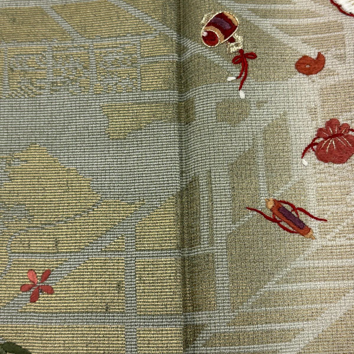 50%OFF 【美品】 袋帯 秀品 服部織物 落款あり 花鳥 波 金銀糸 箔 ベージュ 六通 正絹 K50
