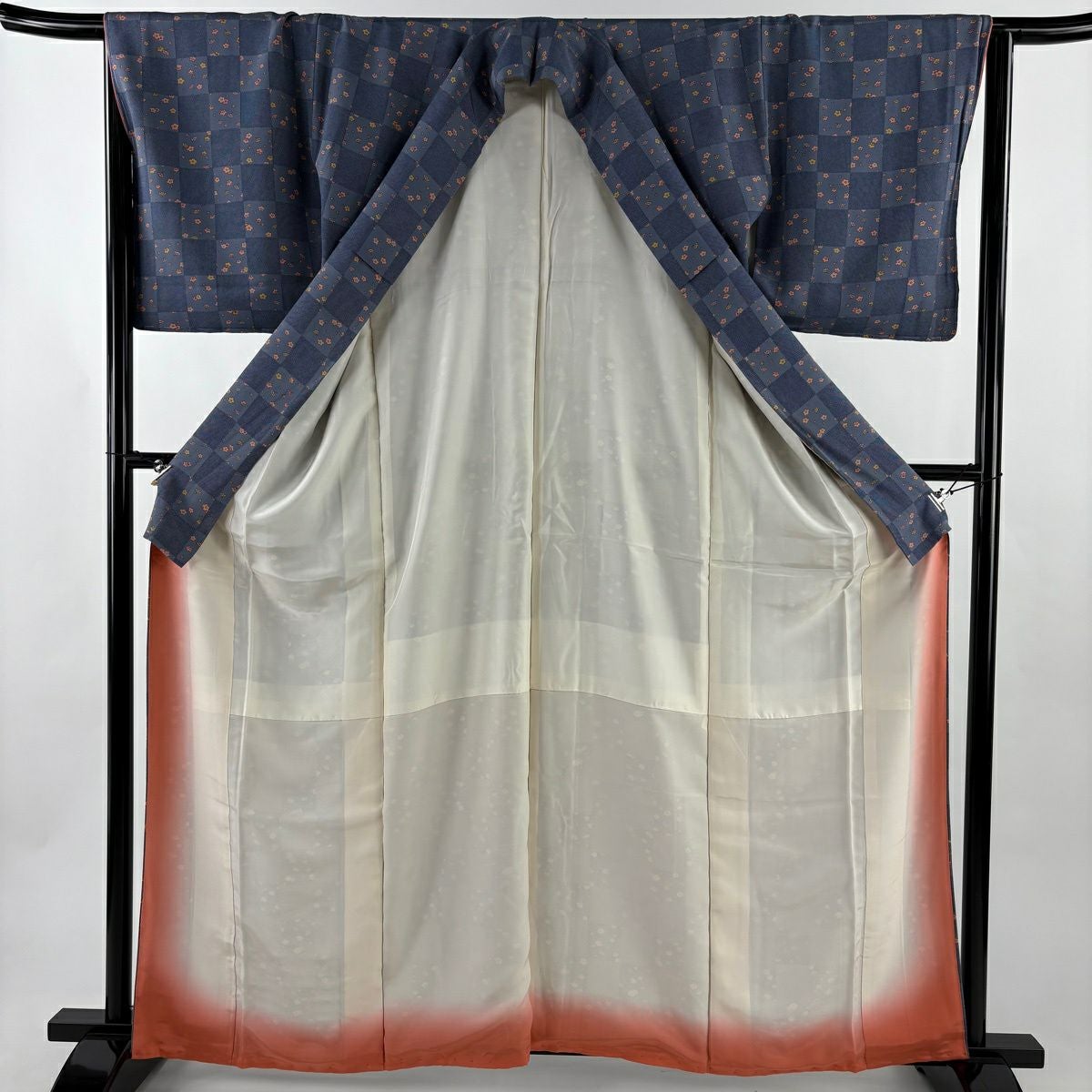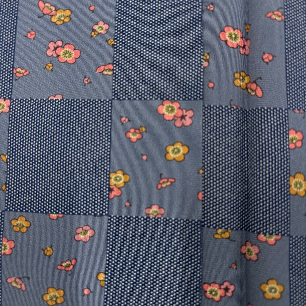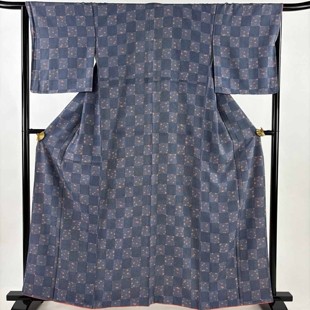 50%OFF 【美品】 小紋 身丈163cm 裄丈65.5cm M 袷 市松模様 梅 青灰色 正絹 秀品 K50