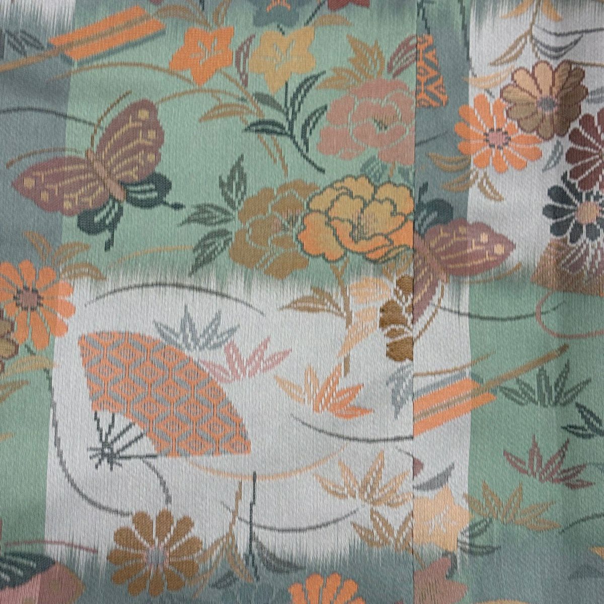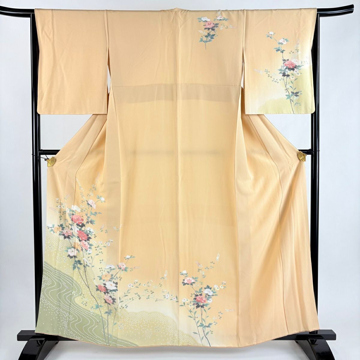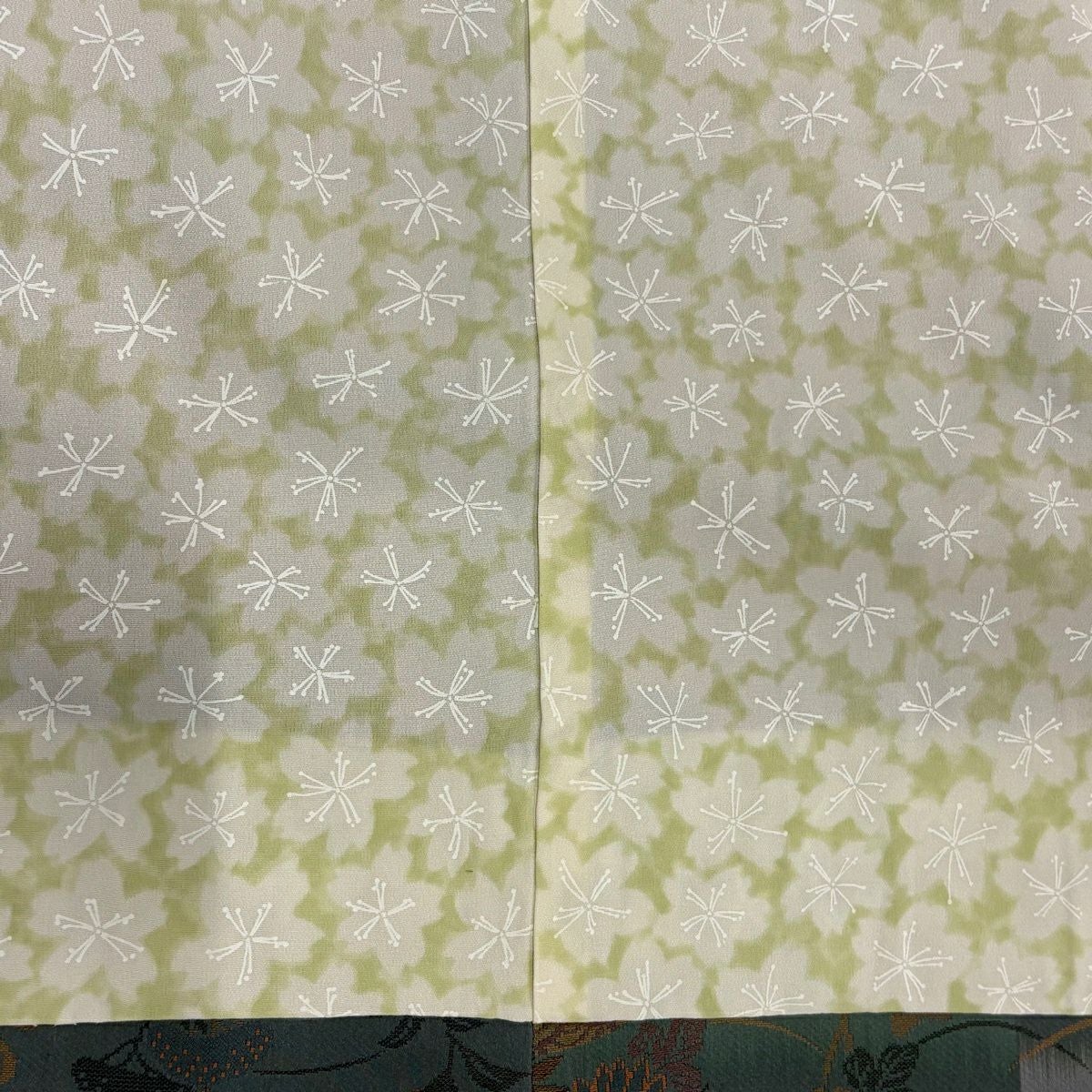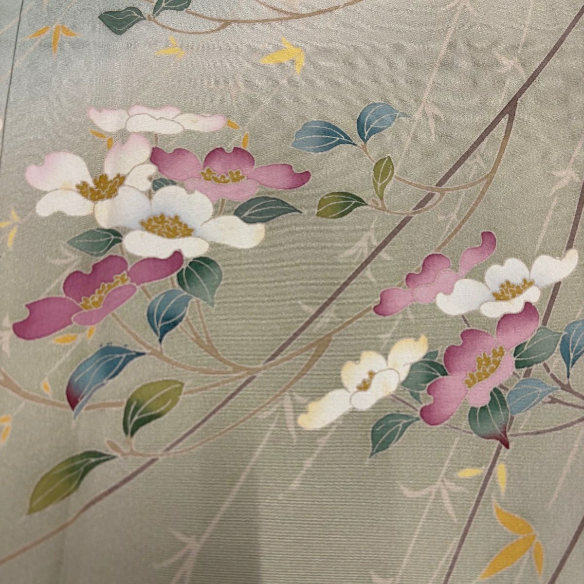 50%OFF 訪問着 身丈166cm 裄丈67cm M 袷 椿 草花 染め分け ぼかし 薄緑 正絹 秀品 K50