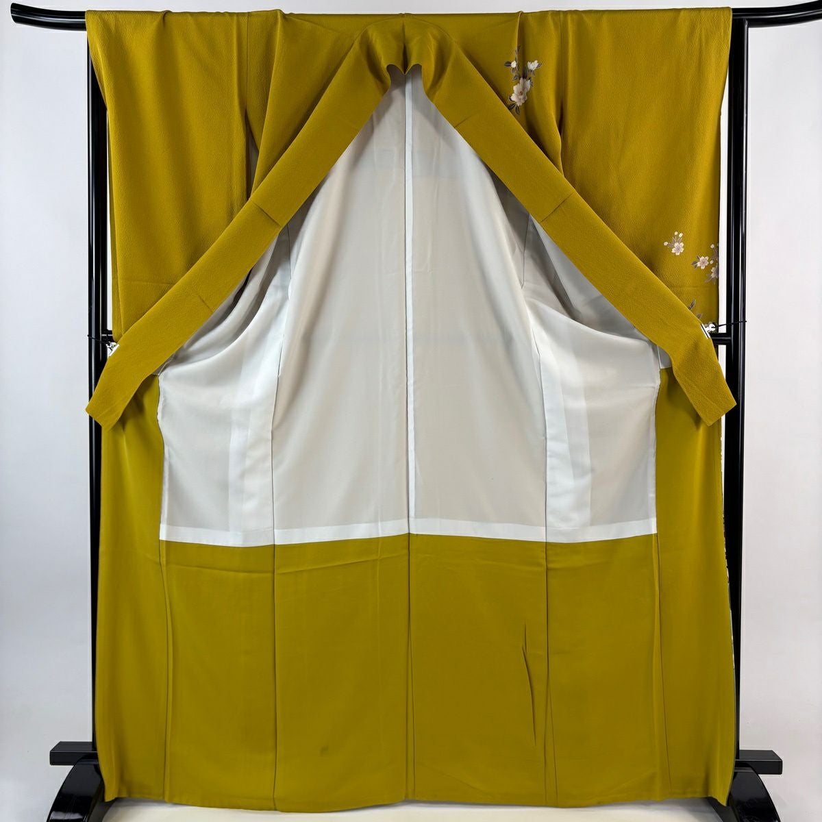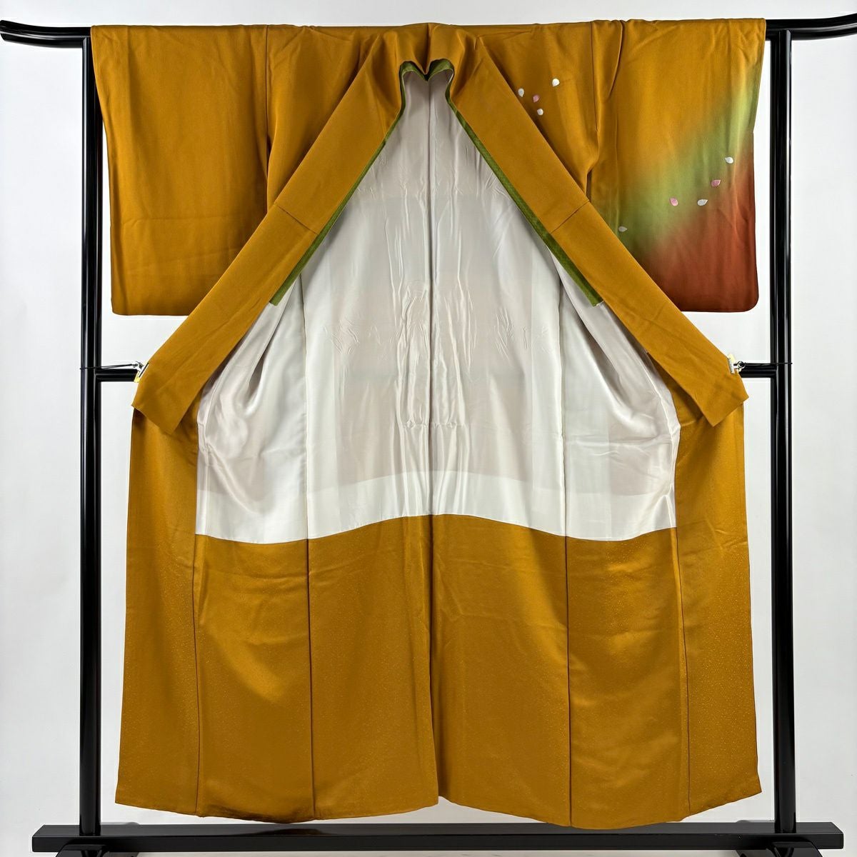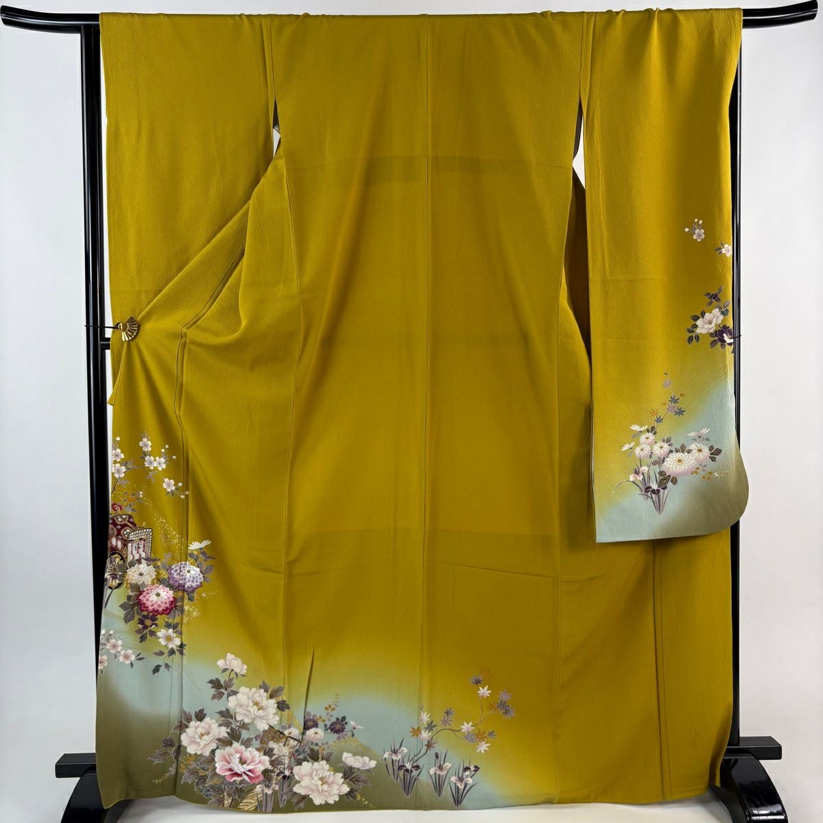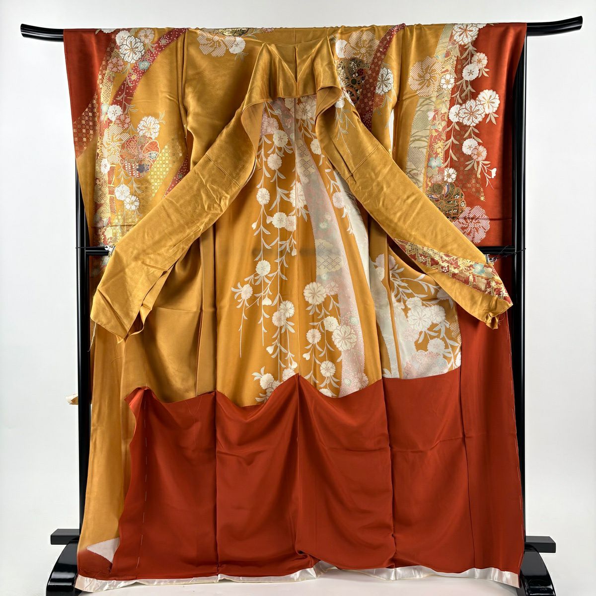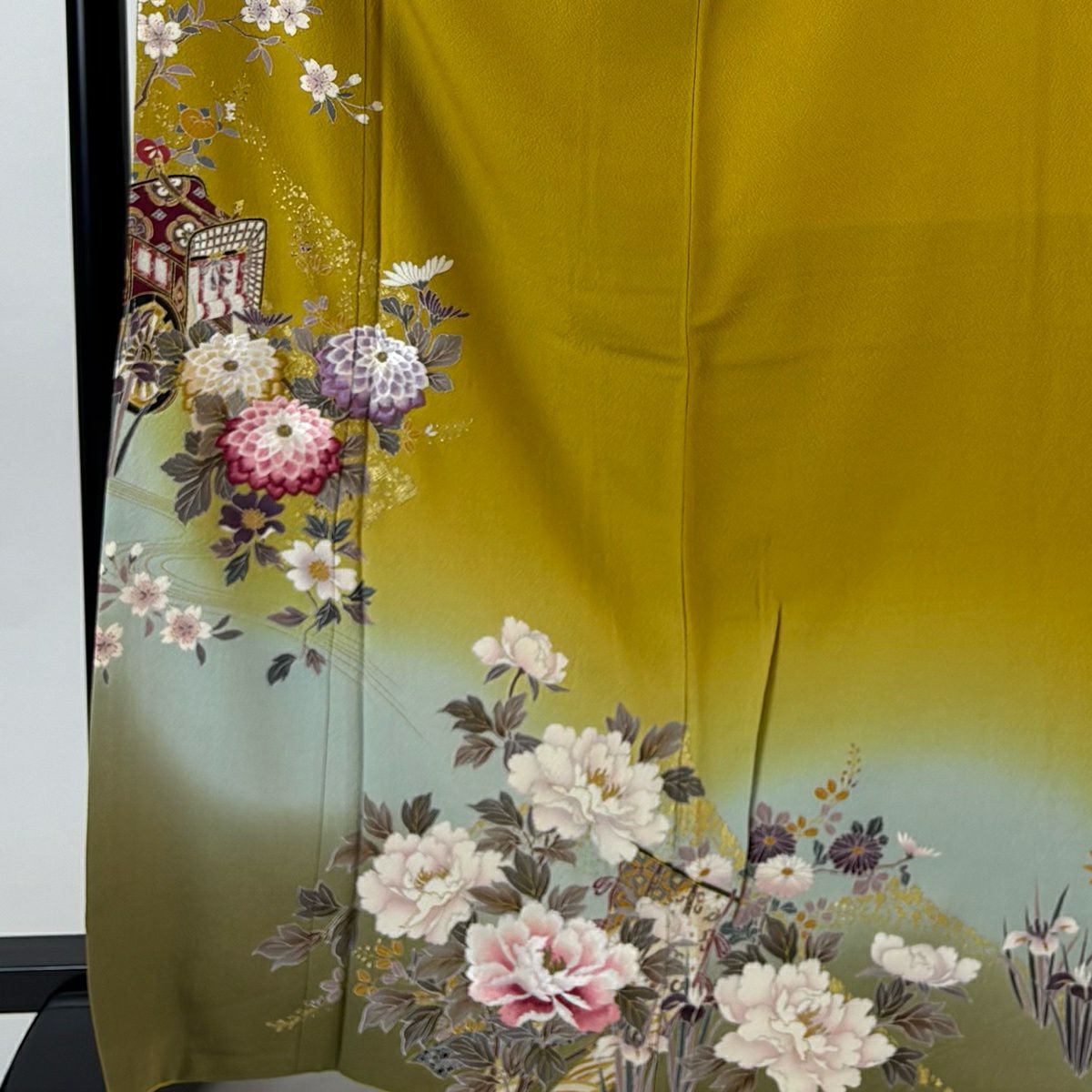 50%OFF 振袖 身丈168cm 裄丈66cm M 袷 御所車 草花 金彩 刺繍 からし色 正絹 秀品 K50