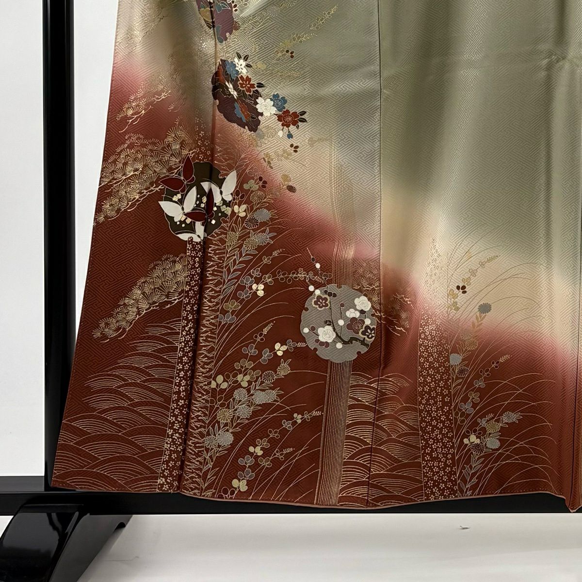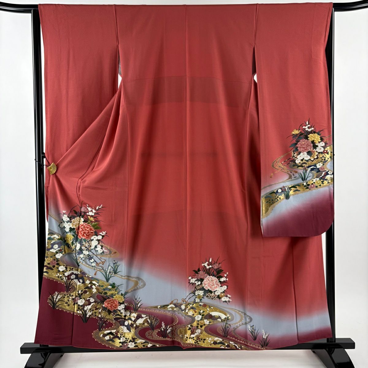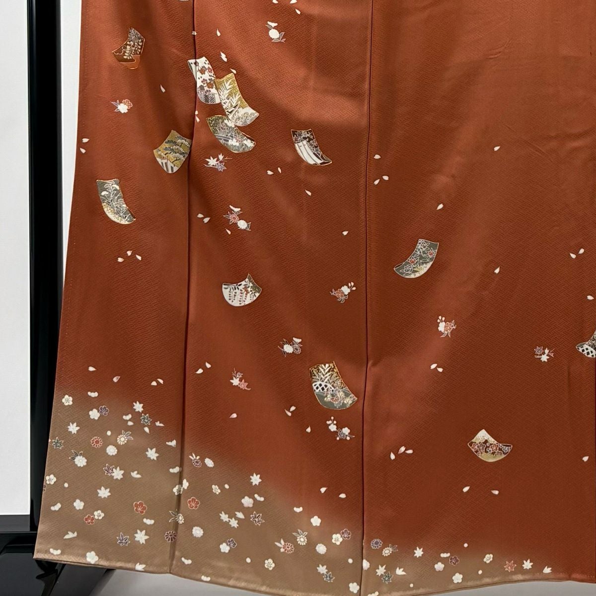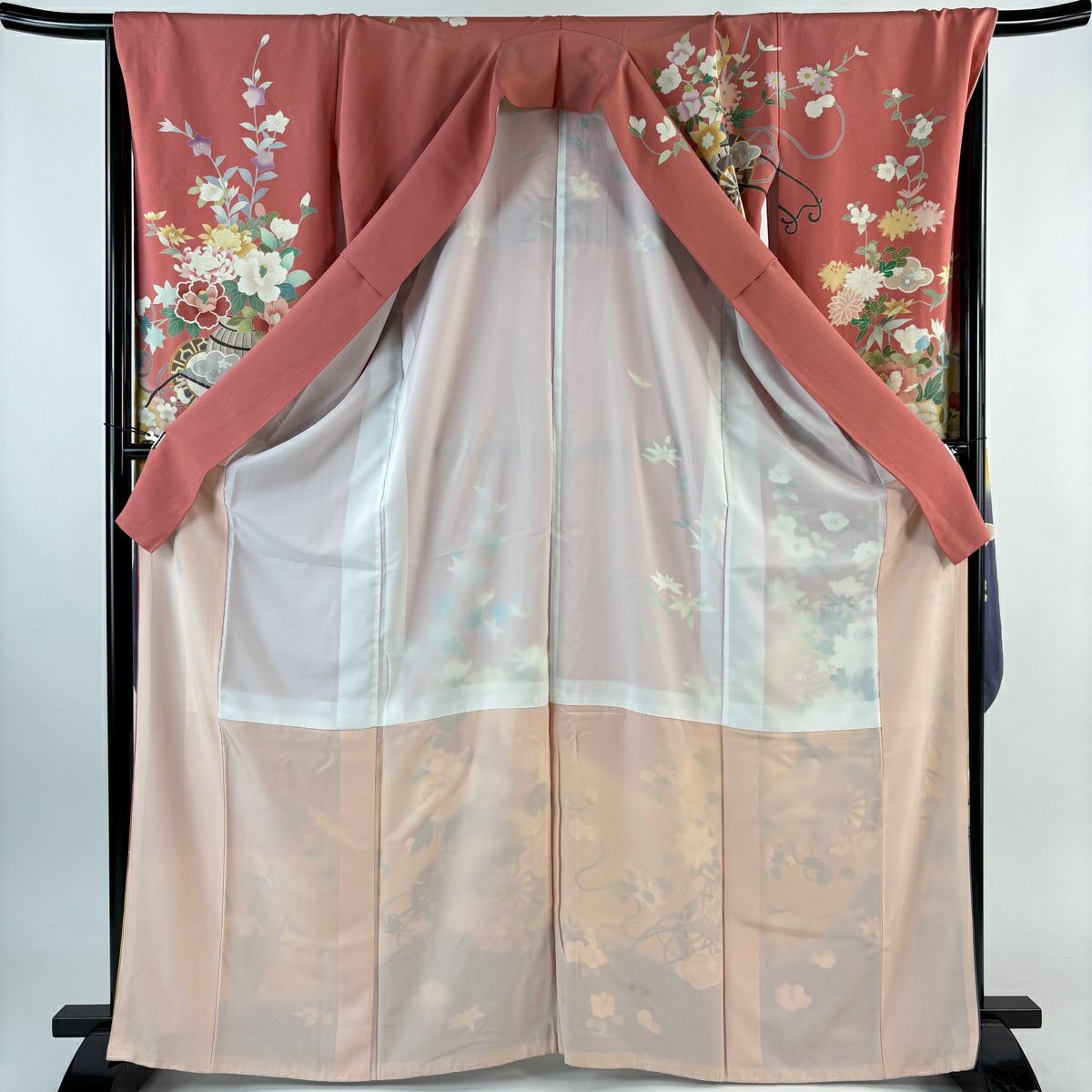 50%OFF 訪問着 身丈163.5cm 裄丈67.5cm L 袷 誰が袖 草花 金糸 金彩 赤茶 正絹 秀品 K50