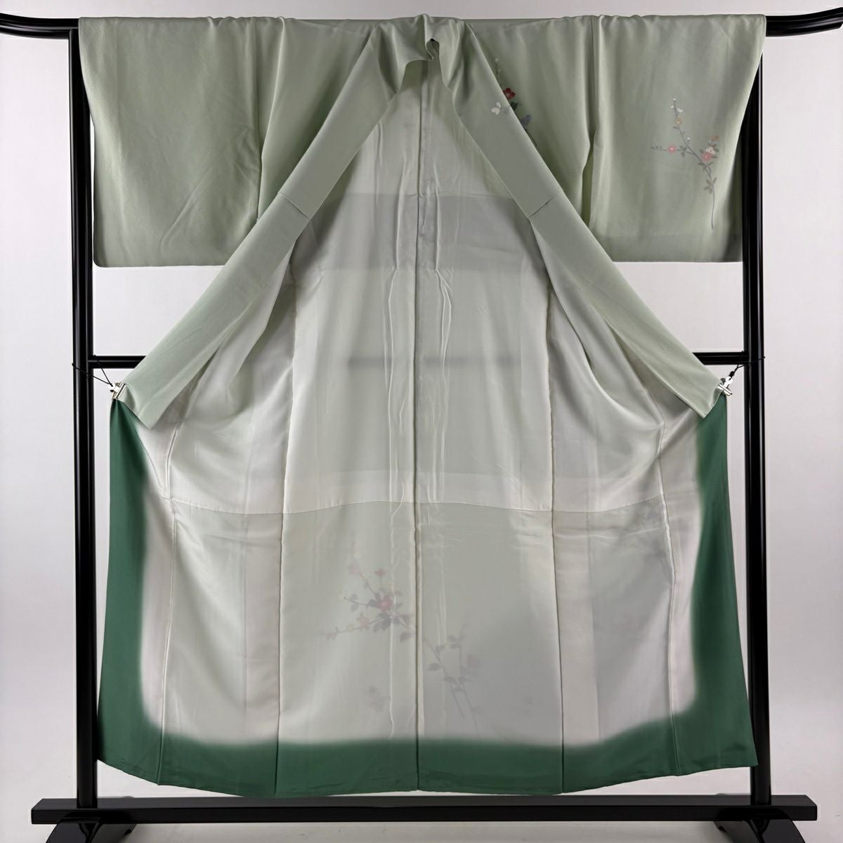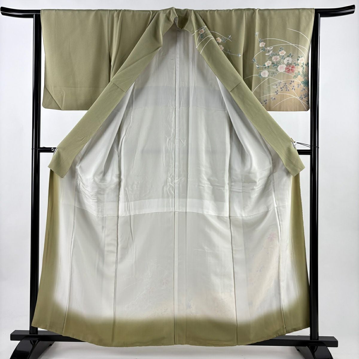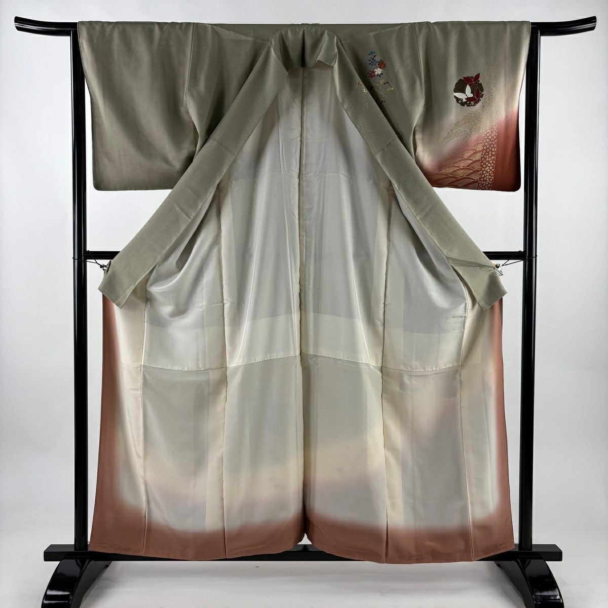 70%OFF 訪問着 身丈159cm 裄丈64cm M 袷 雪輪 花蝶 金彩 染め分け 灰緑 正絹 秀品 K70
