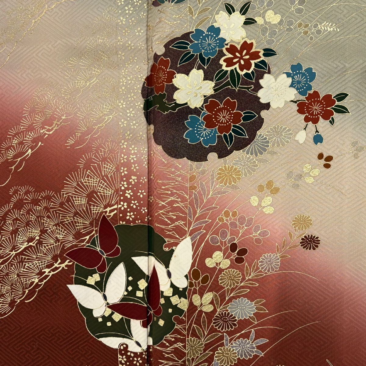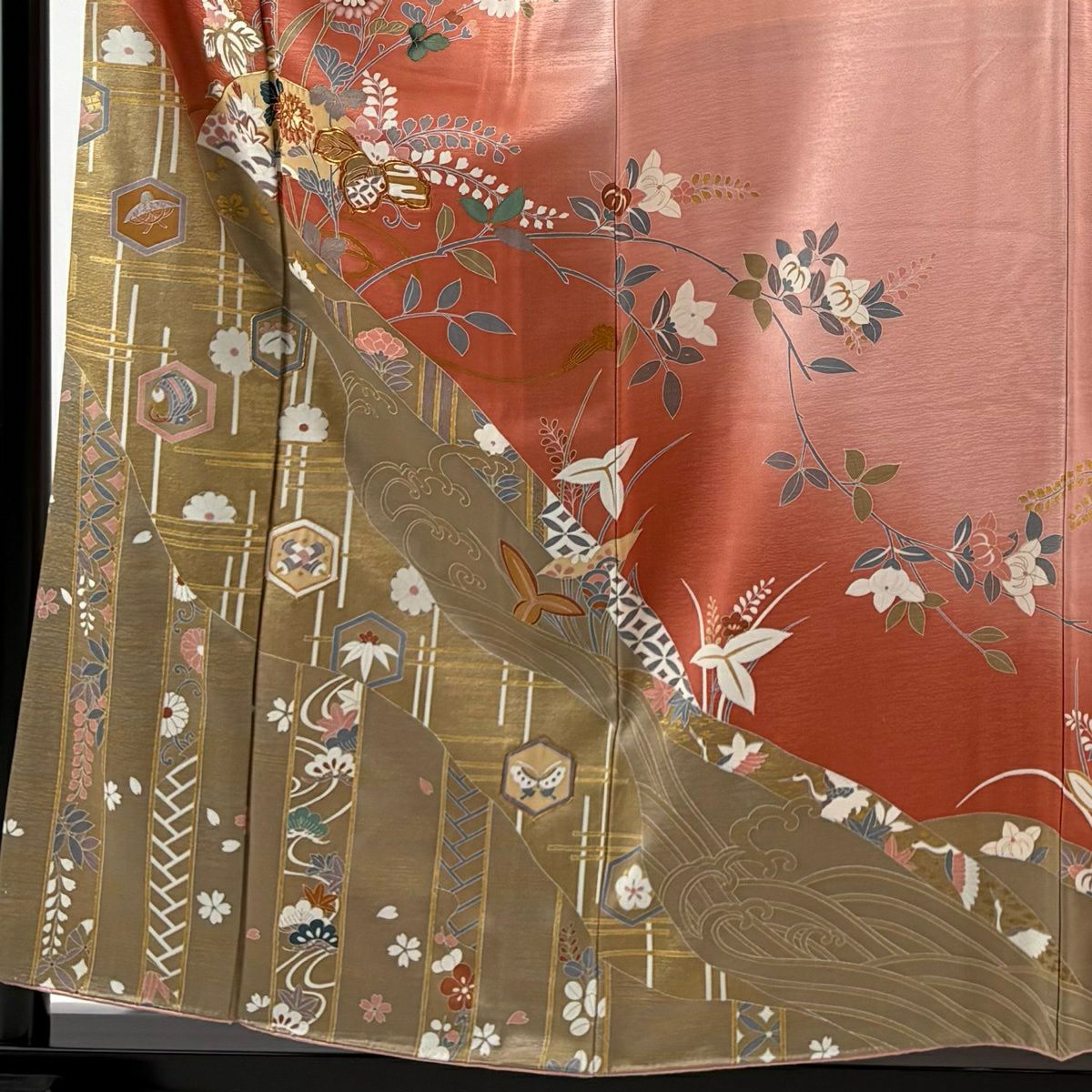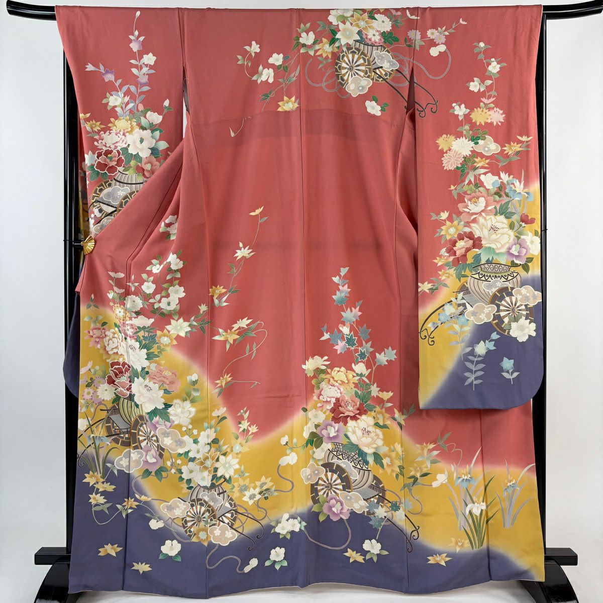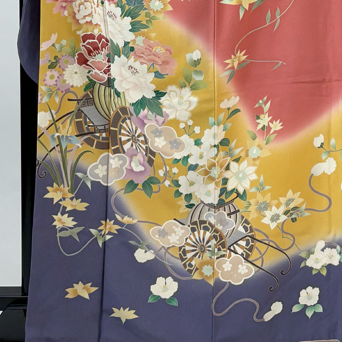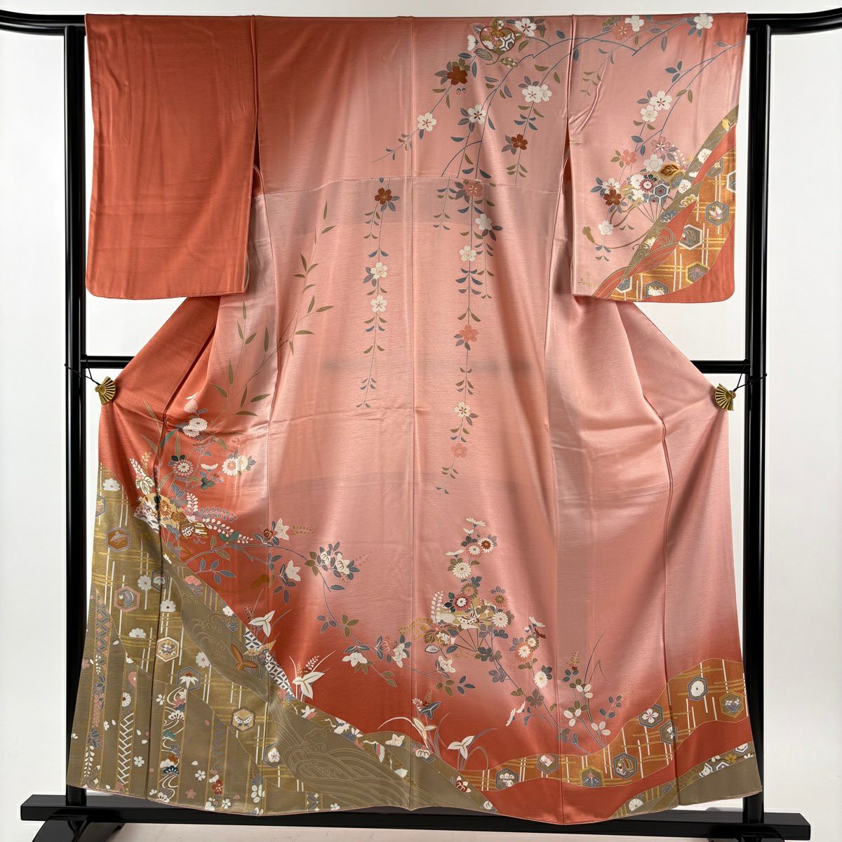 50%OFF 振袖 身丈168cm 裄丈67.5cm L 袷 花車 草花 染め分け ピンク 正絹 秀品 K50