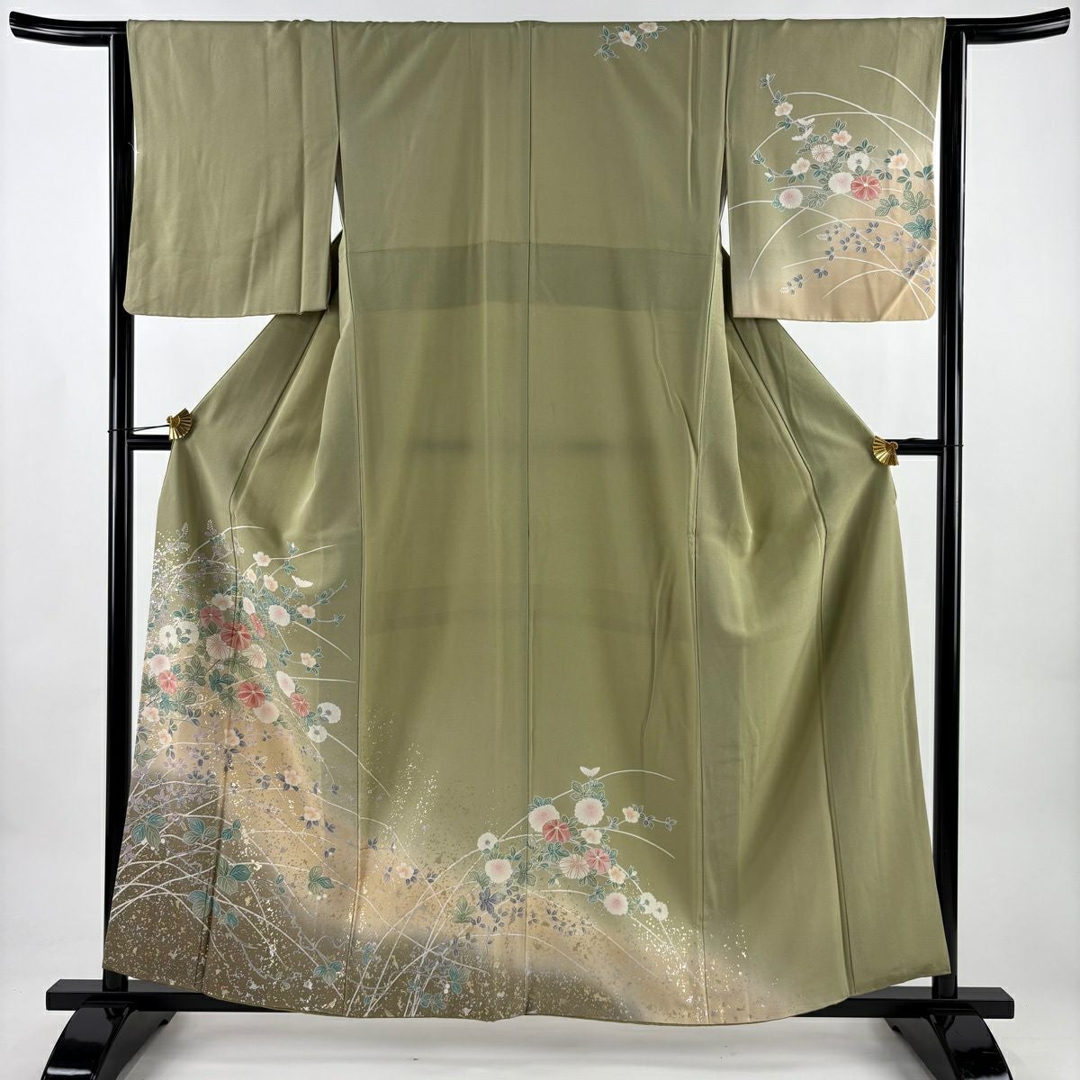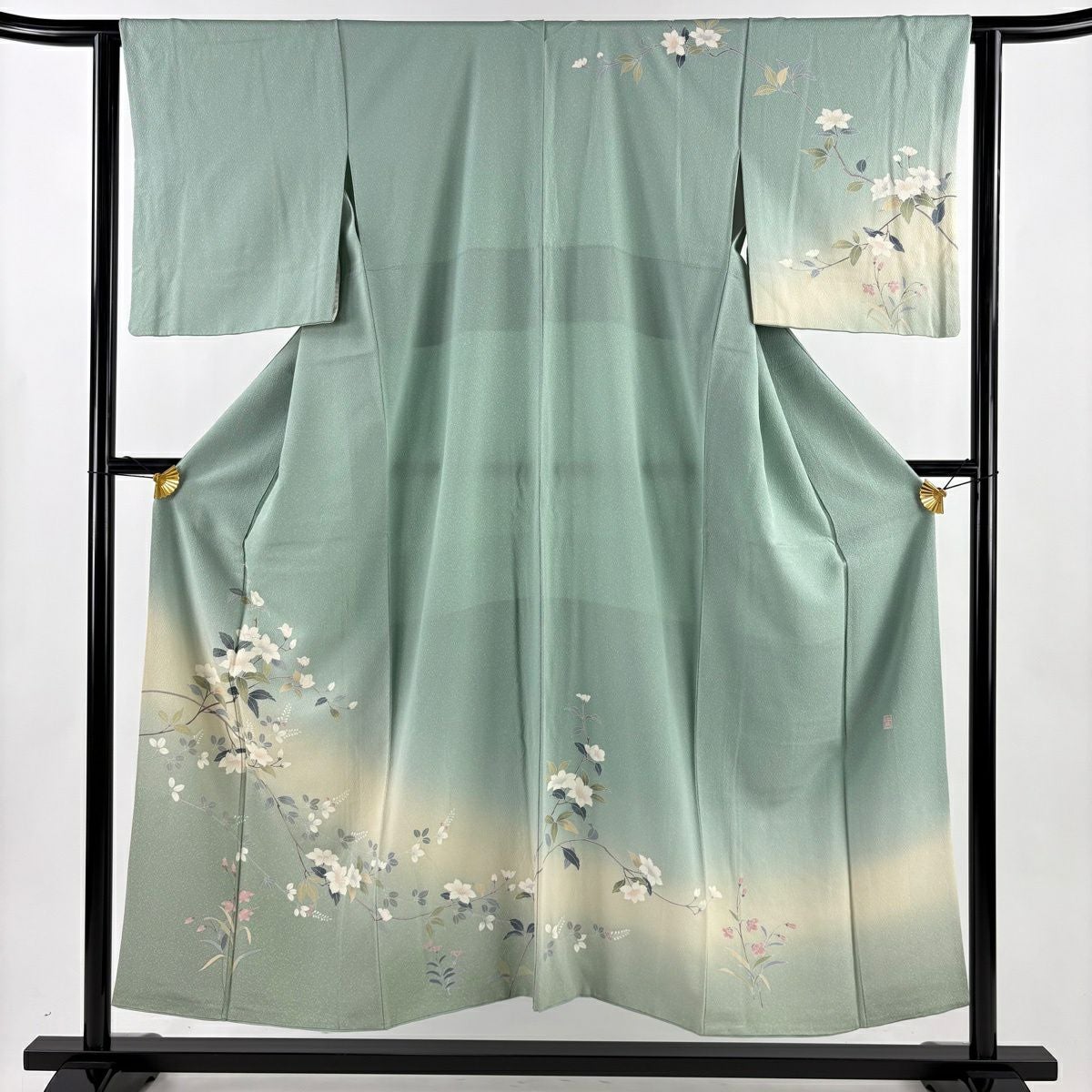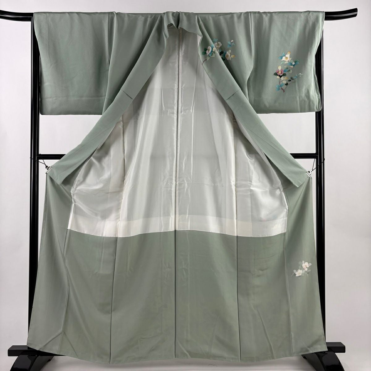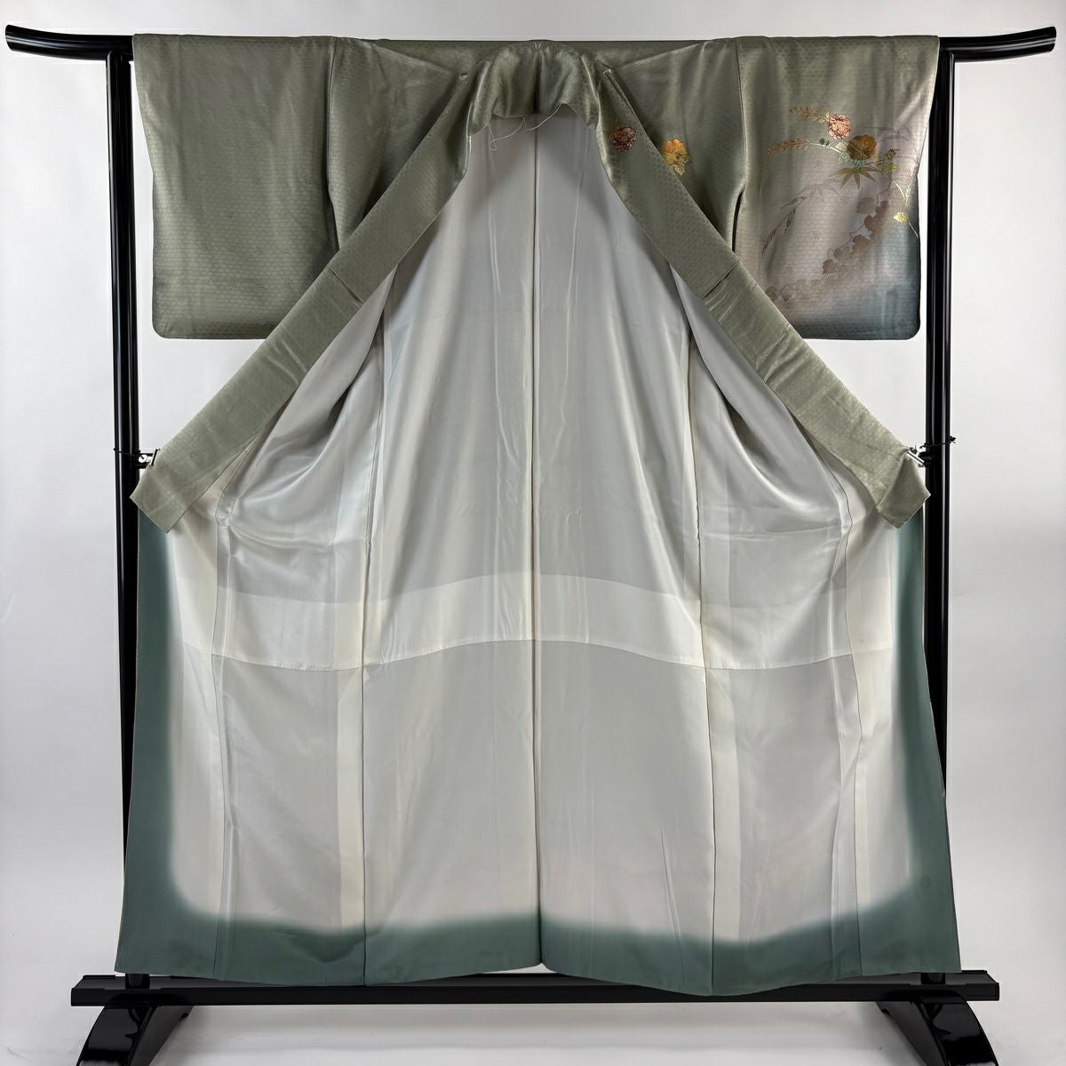 70%OFF 付下げ 身丈157cm 裄丈63.5cm S 袷 草花 地紋 金彩 螺鈿 灰緑 正絹 秀品 K70