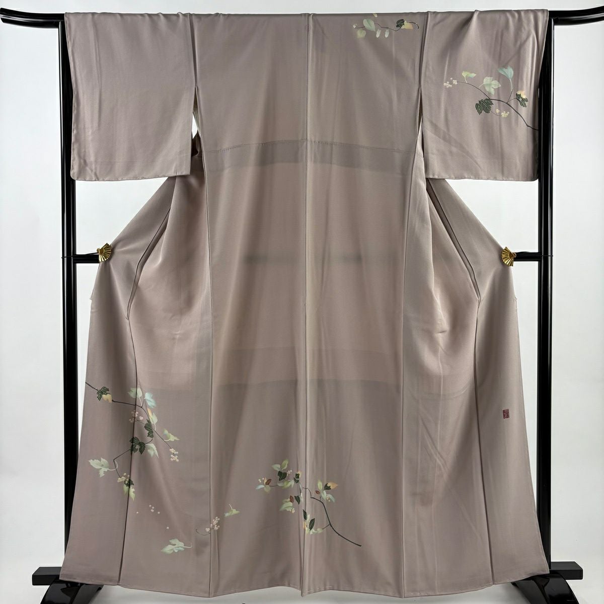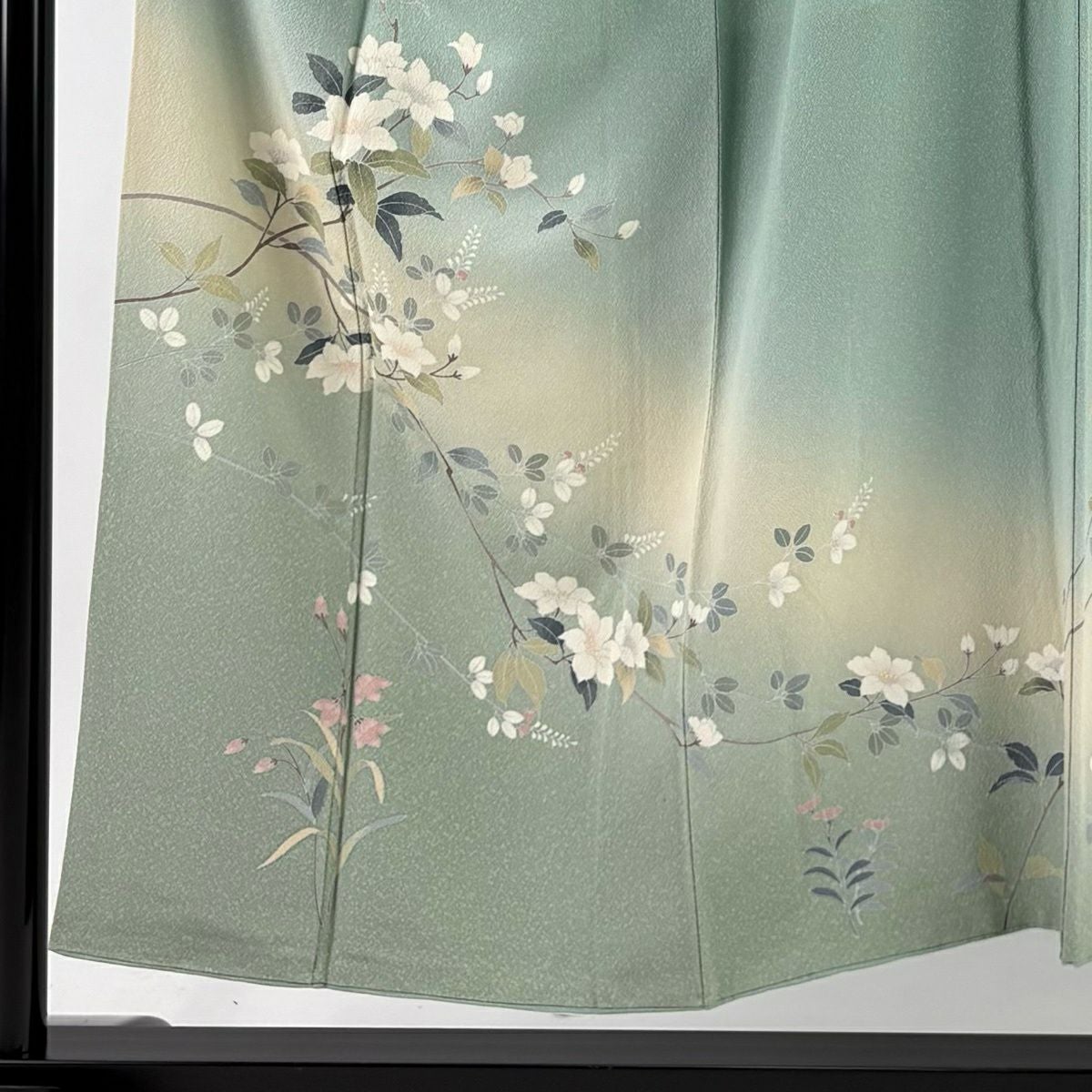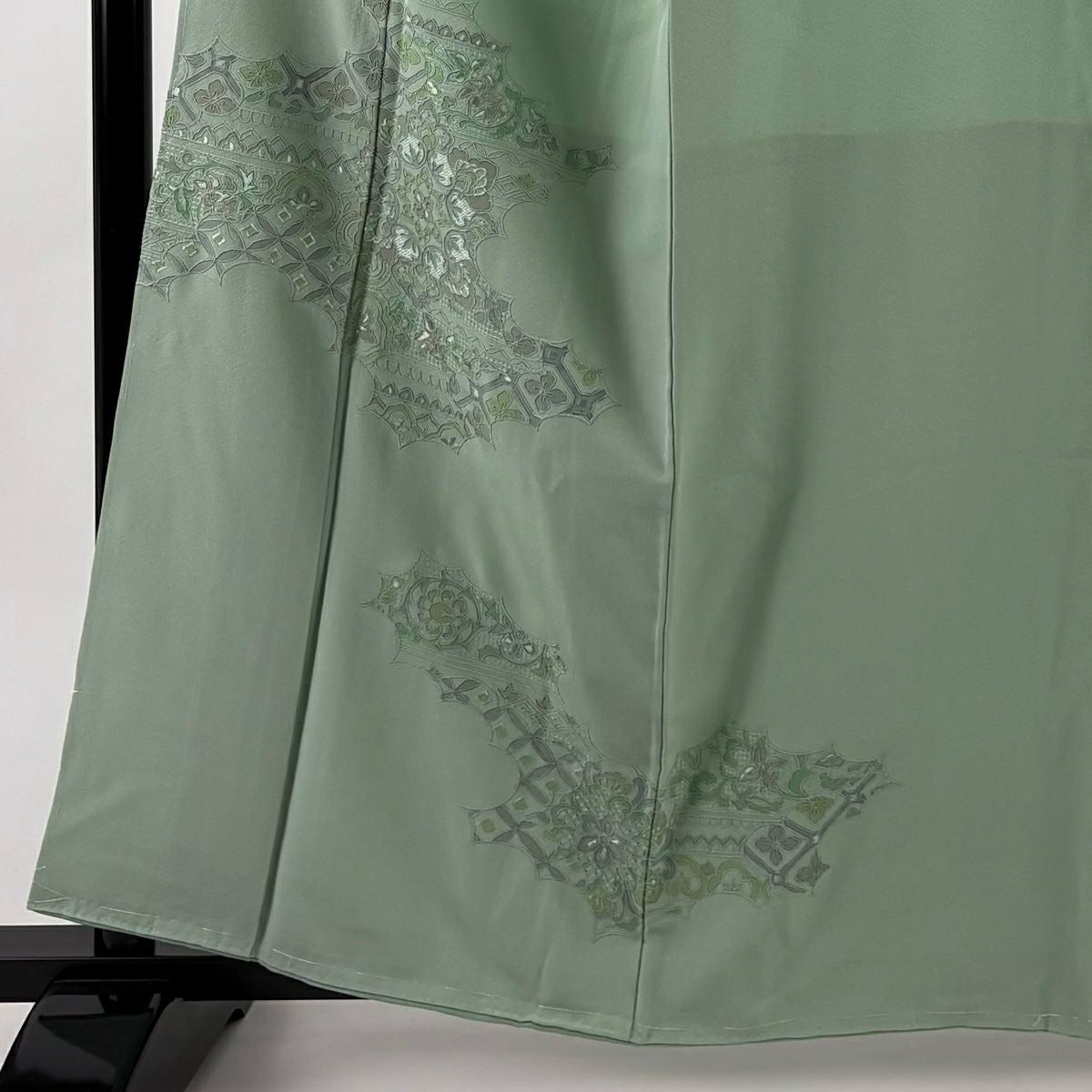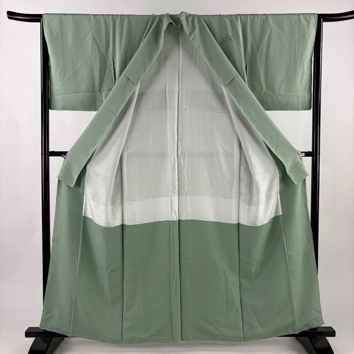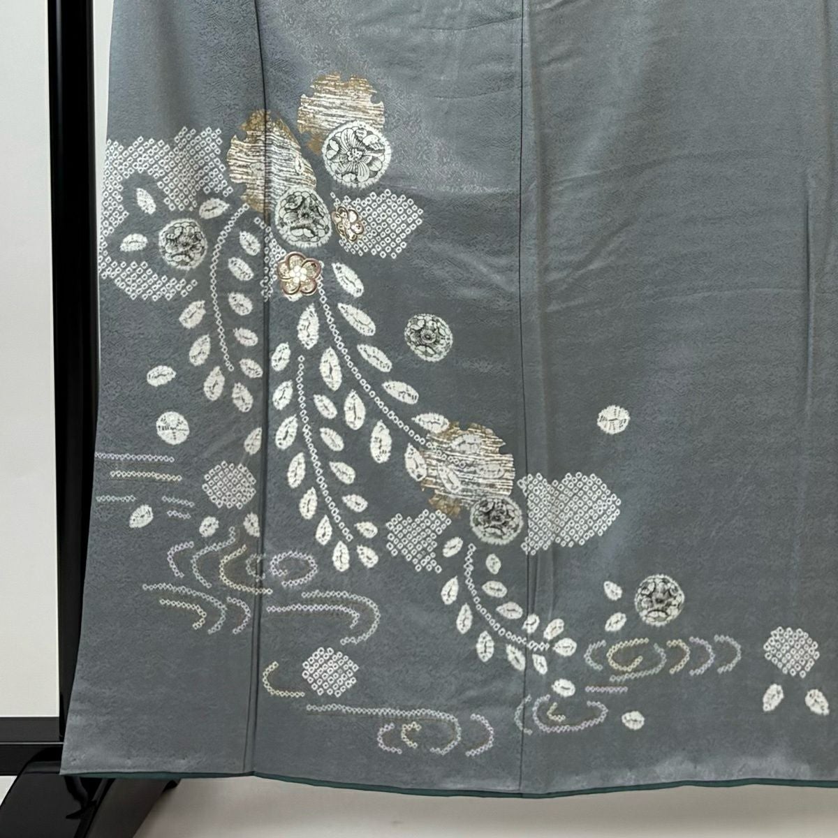 70%OFF 付下げ 身丈157cm 裄丈63.5cm S 袷 草花 地紋 金彩 螺鈿 灰緑 正絹 秀品 K70