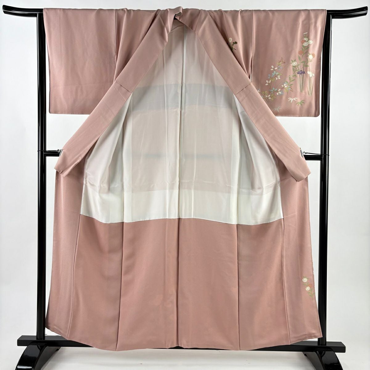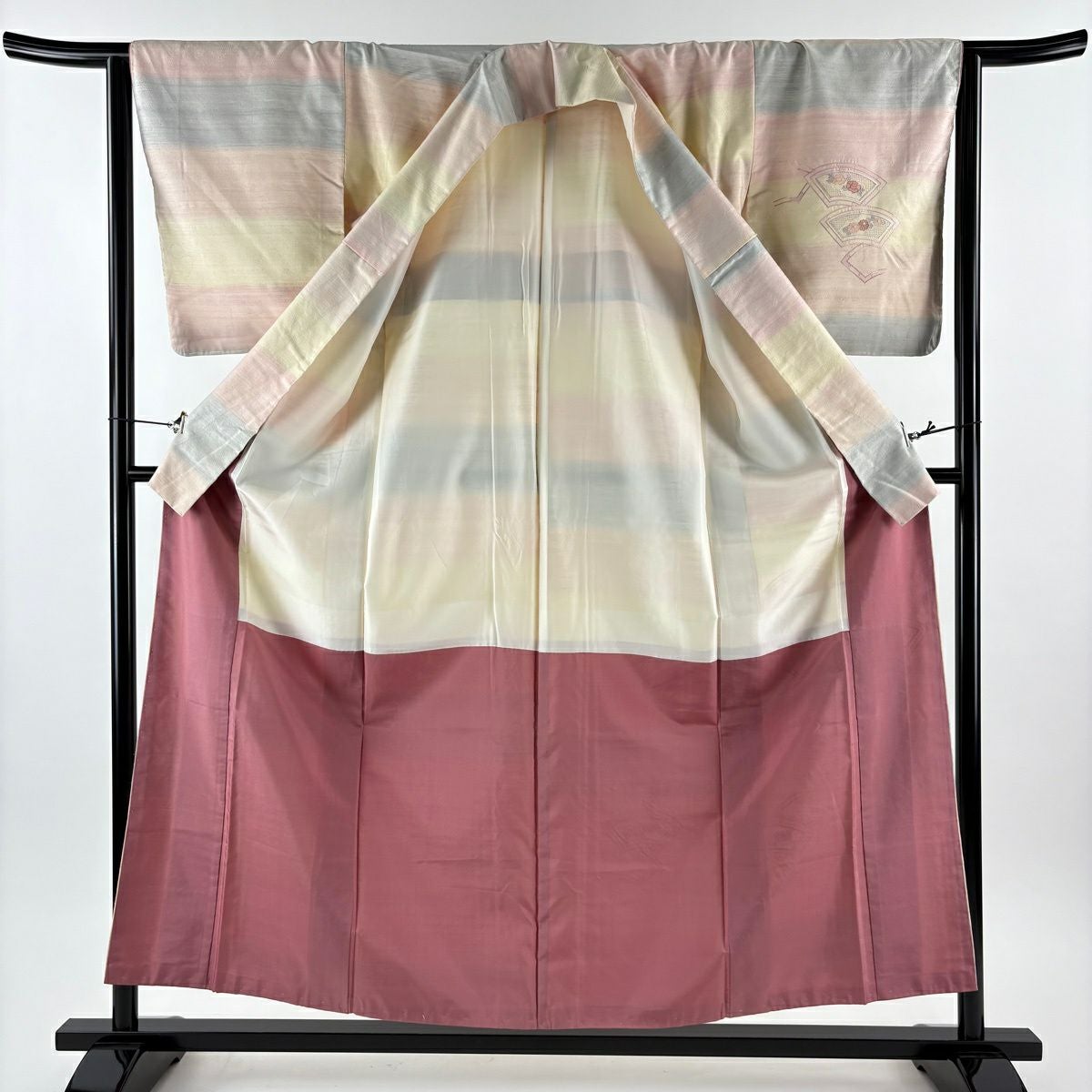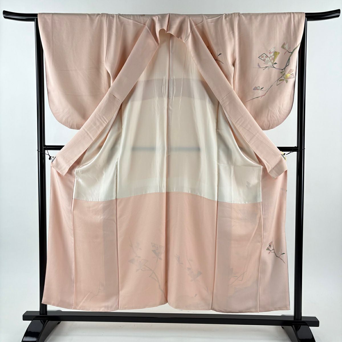 70%OFF 付下げ 身丈156cm 裄丈64cm M 袷 紬地 扇面 草花 刺繍 ピンク 正絹 秀品 K70