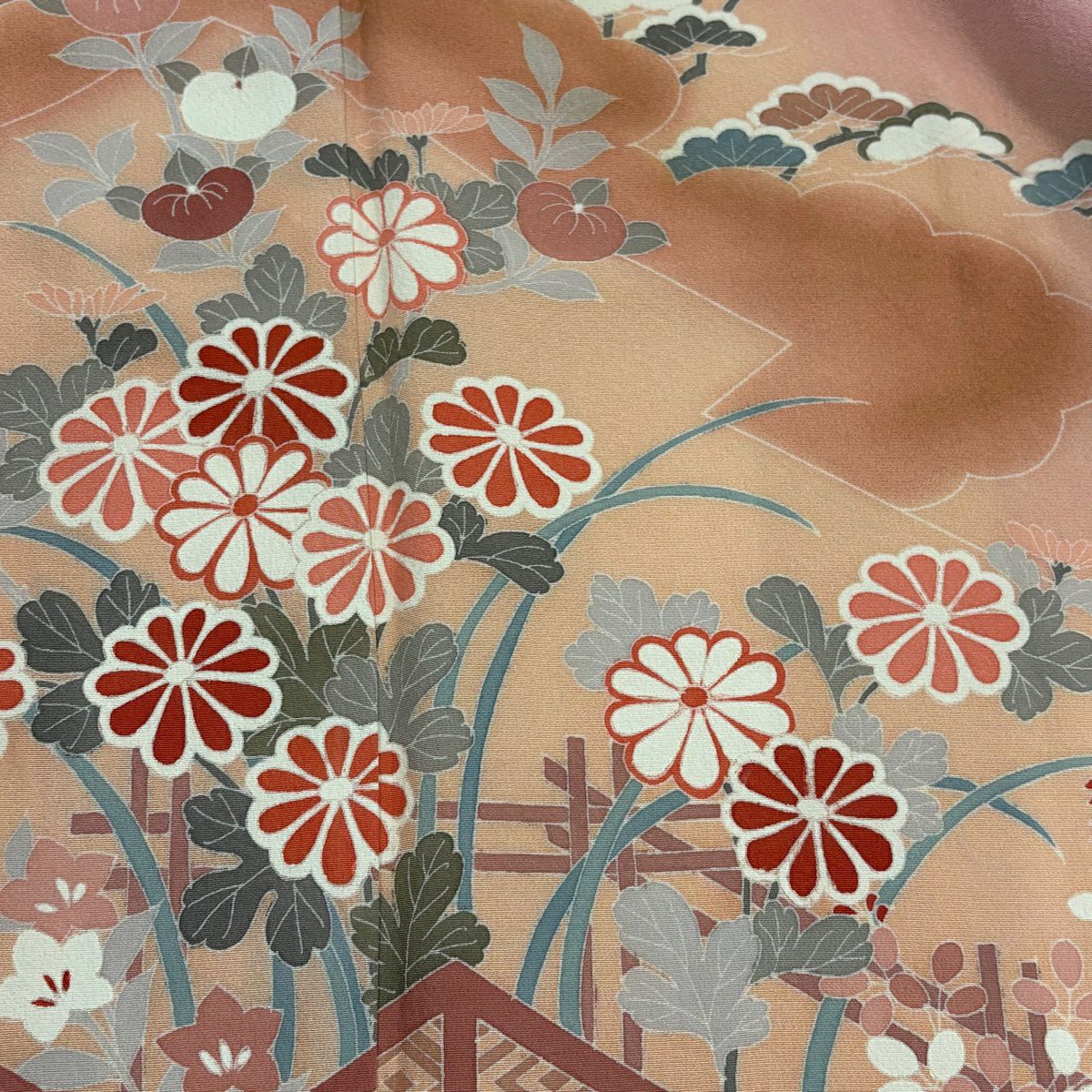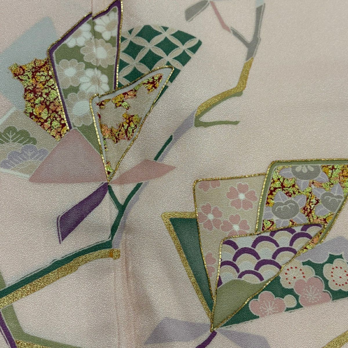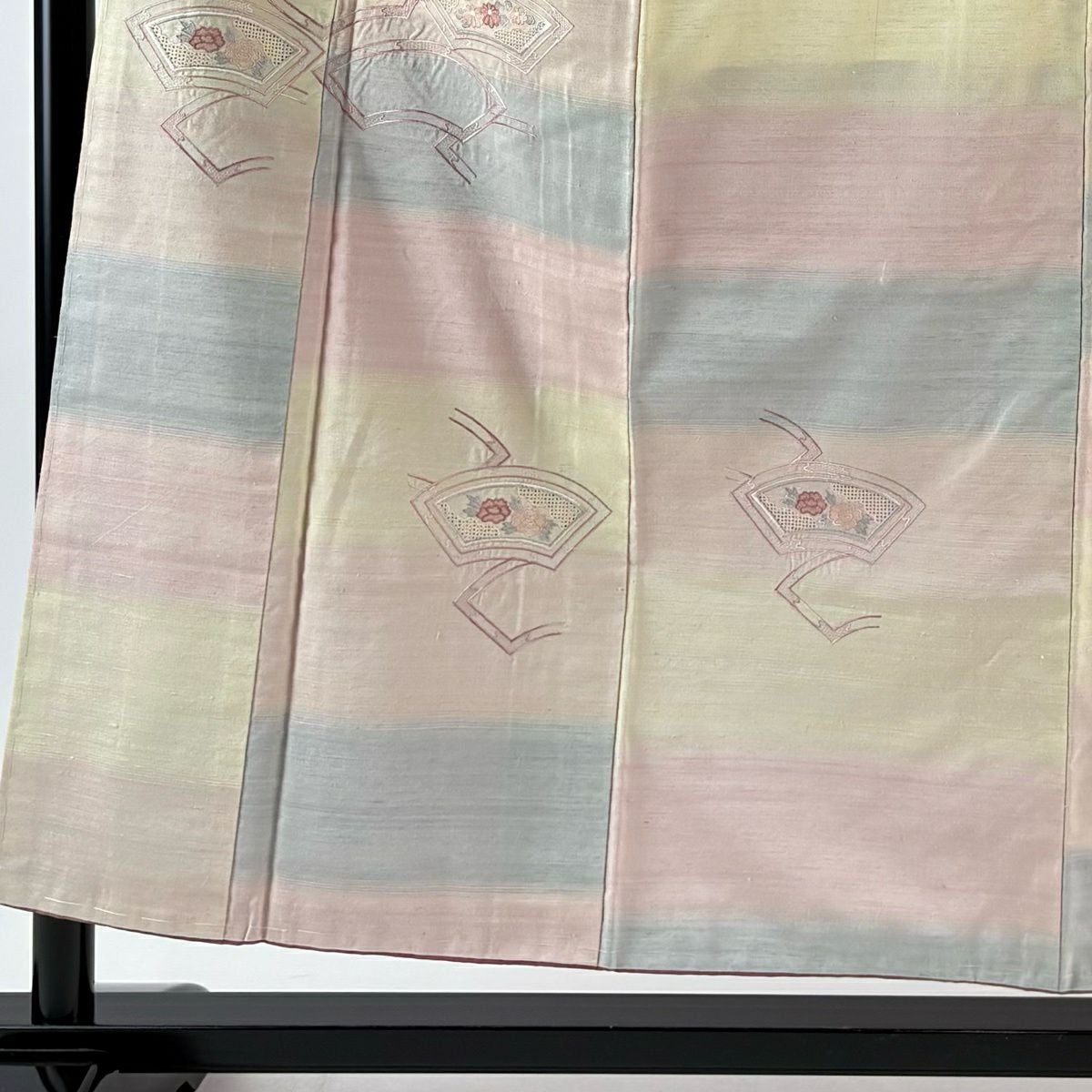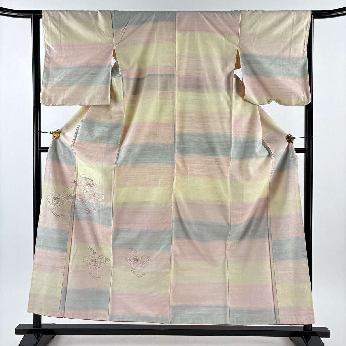 70%OFF 付下げ 身丈156cm 裄丈64cm M 袷 紬地 扇面 草花 刺繍 ピンク 正絹 秀品 K70