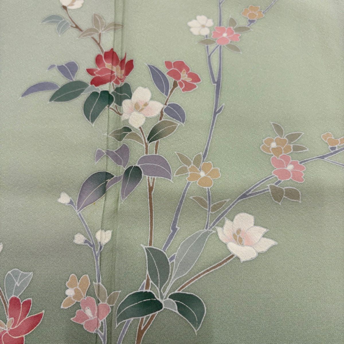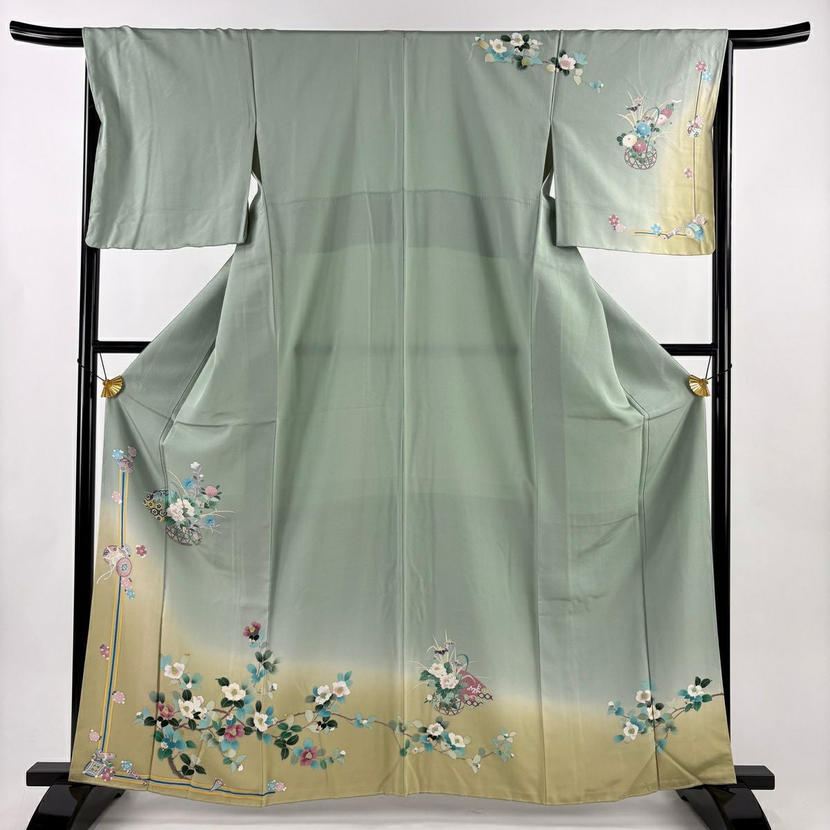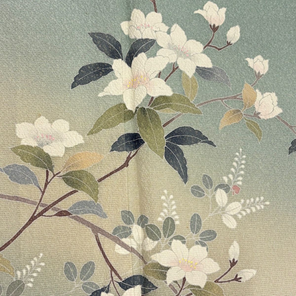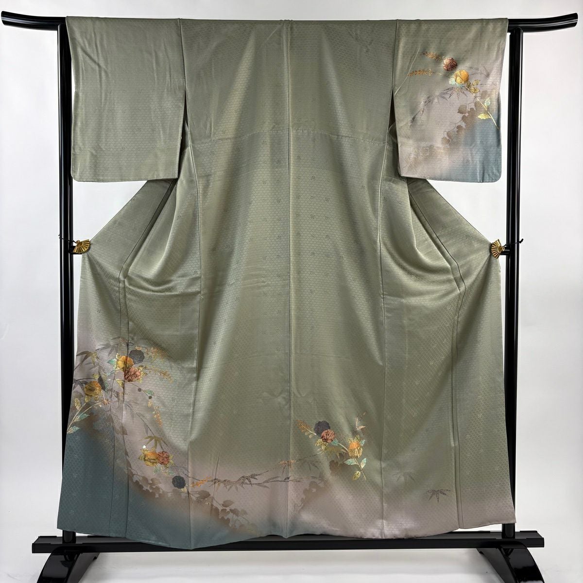 70%OFF 訪問着 身丈158cm 裄丈63.5cm S 袷 菊 椿 金銀彩 ぼかし 灰緑 正絹 秀品 K70