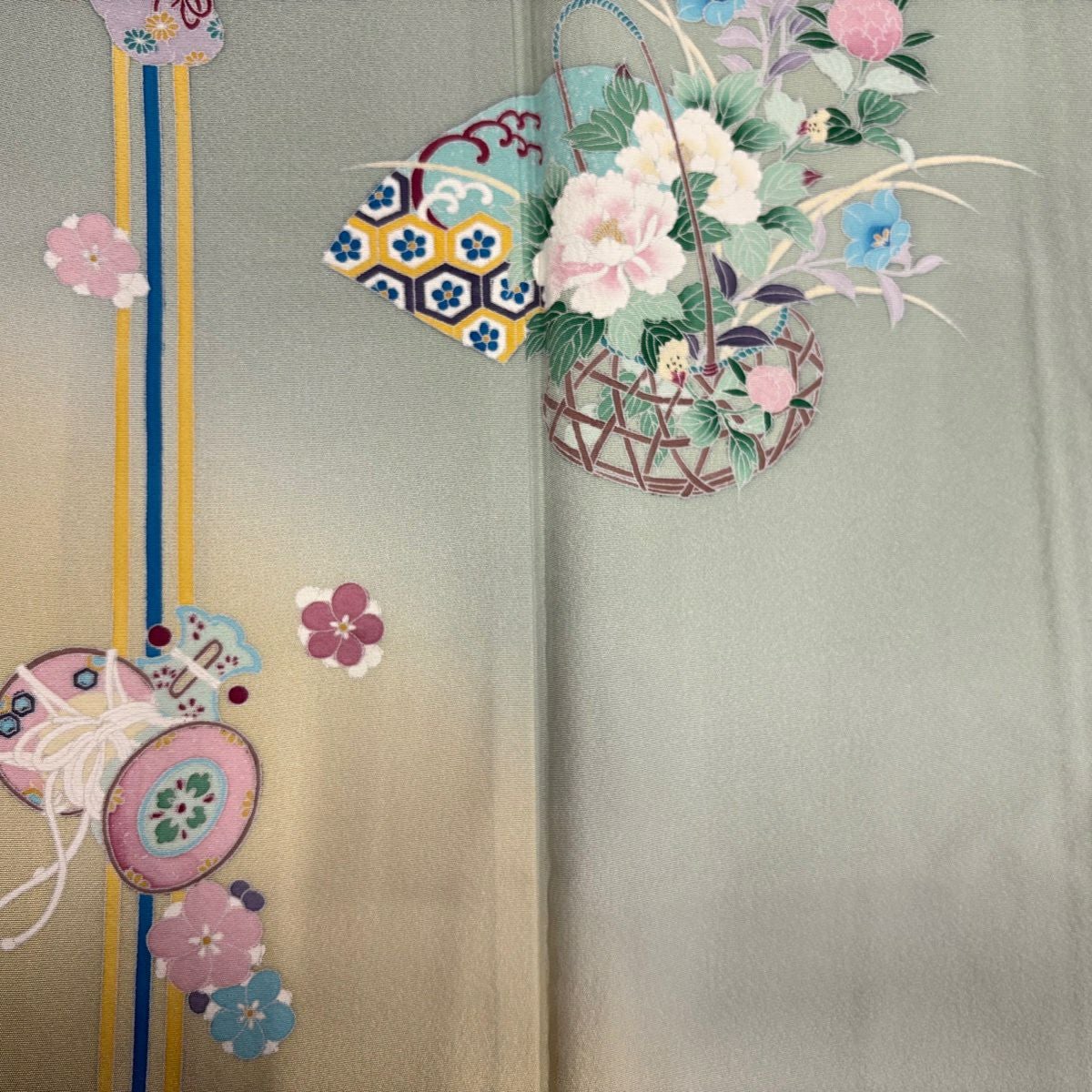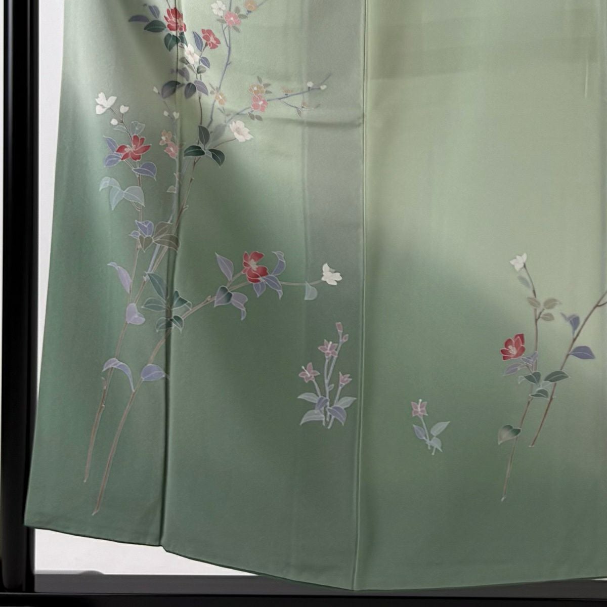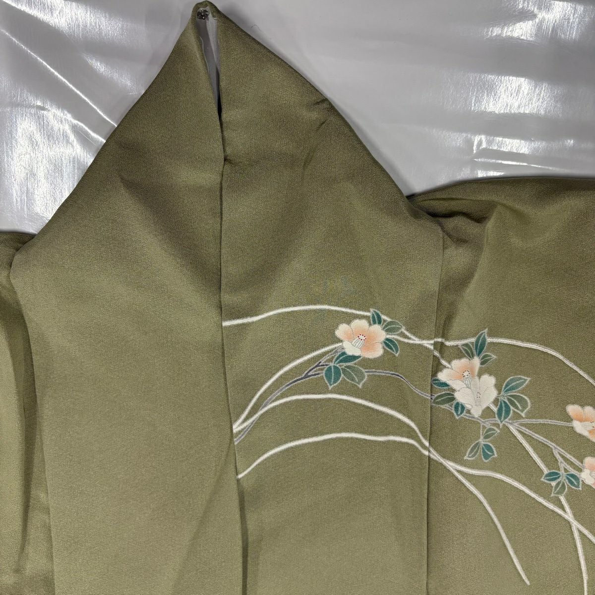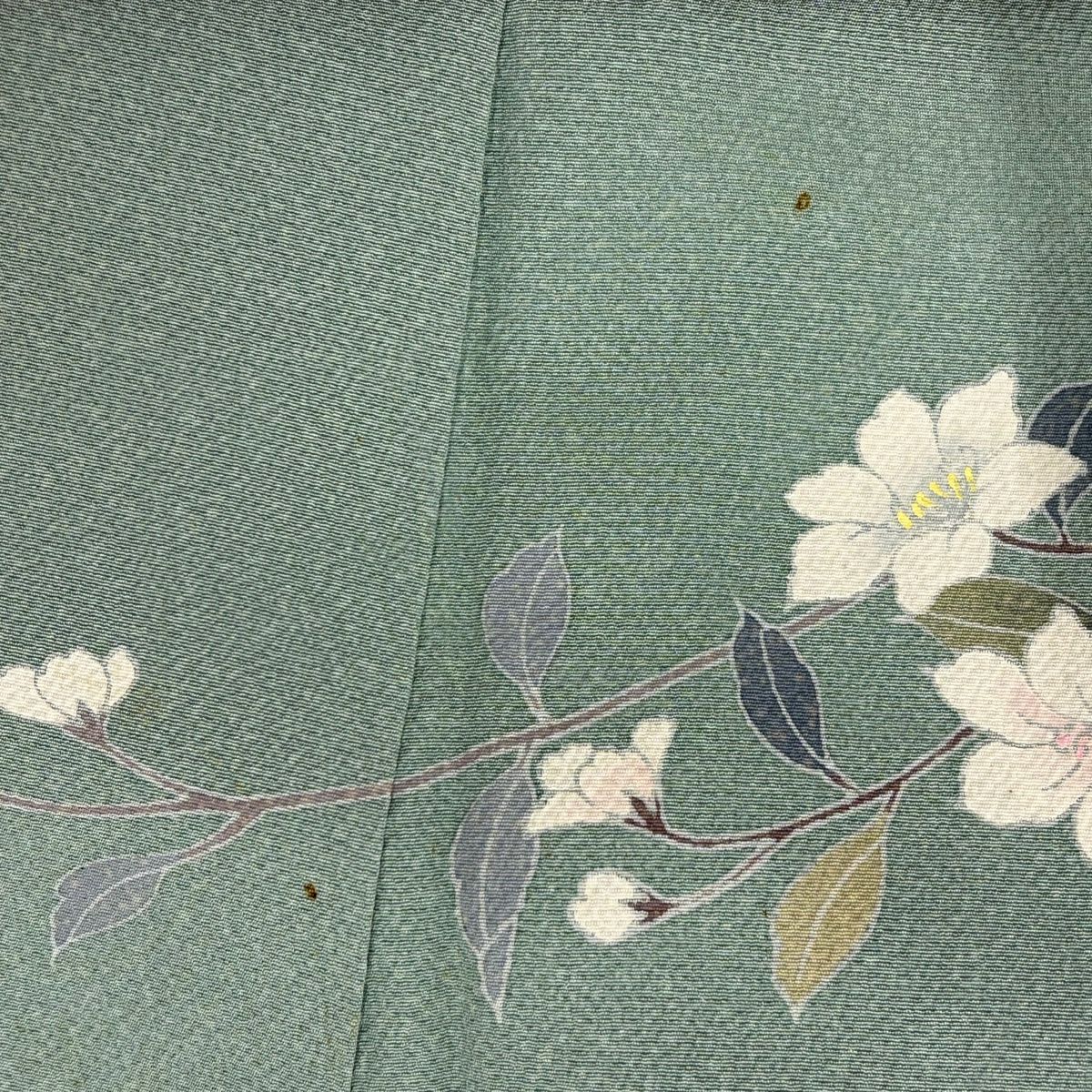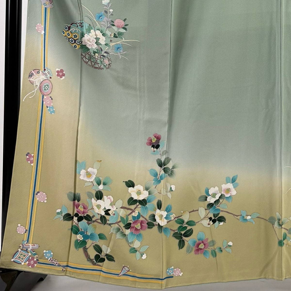70%OFF 訪問着 身丈158cm 裄丈63.5cm S 袷 菊 椿 金銀彩 ぼかし 灰緑 正絹 秀品 K70