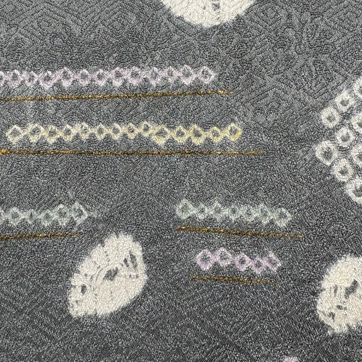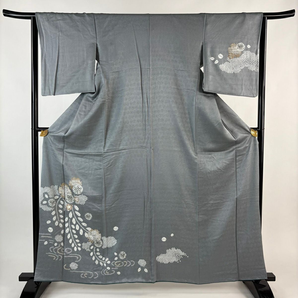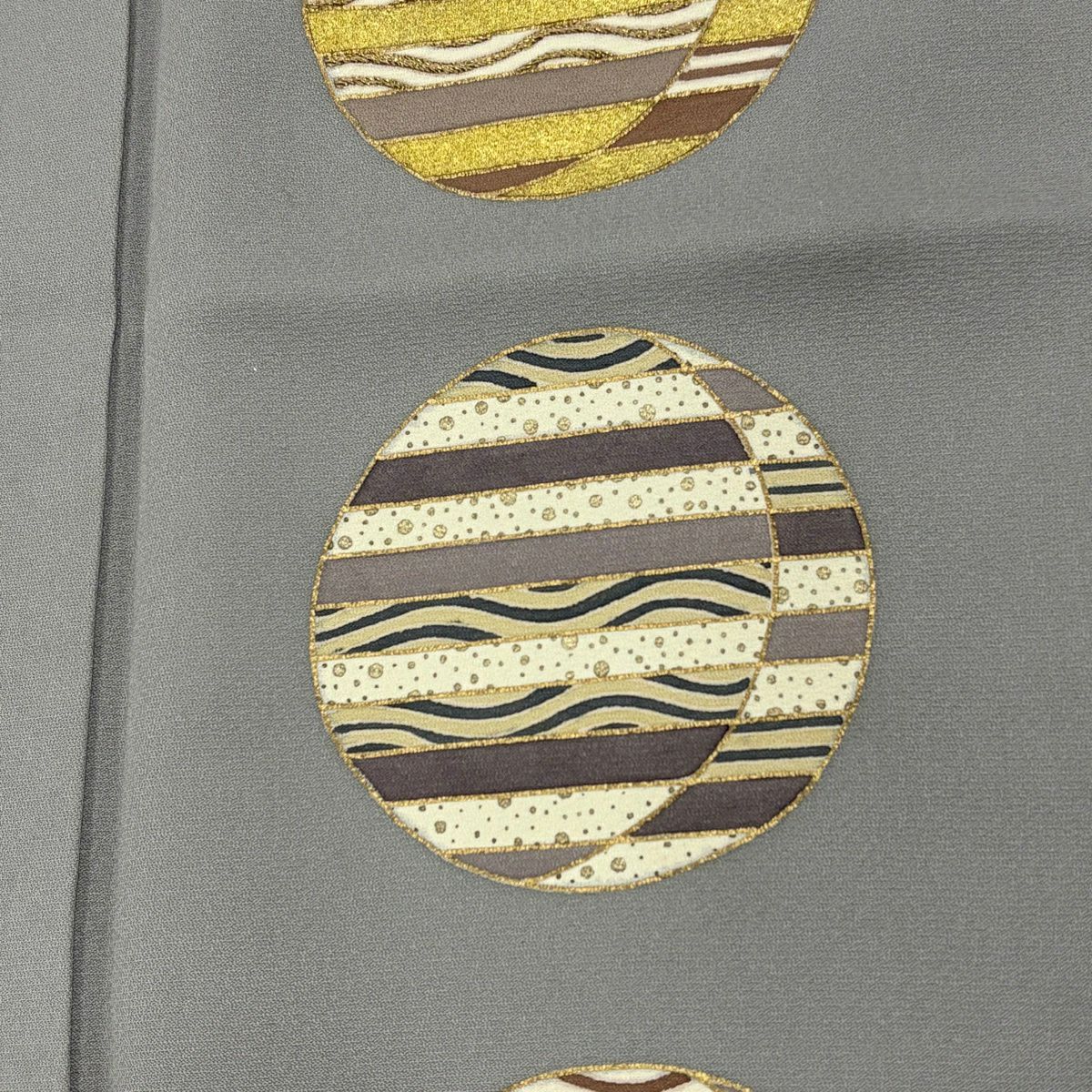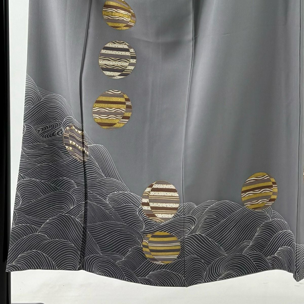 70%OFF 付下げ 身丈150cm 裄丈63cm S 袷 丸文 波 金糸 金彩 灰色 正絹 秀品 一つ紋 K70