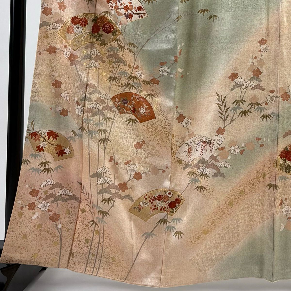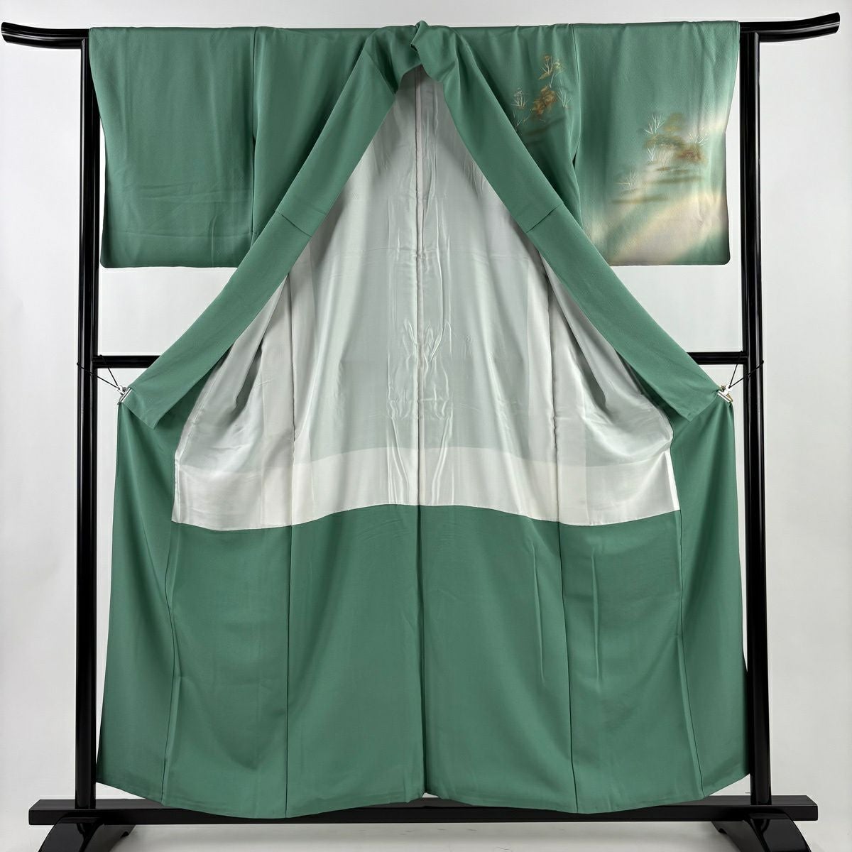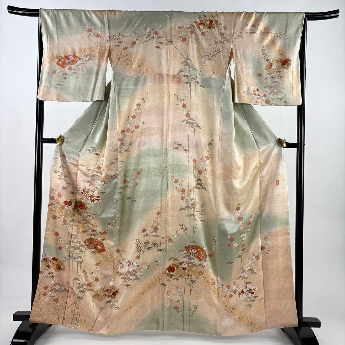 70%OFF 訪問着 身丈163.5cm 裄丈66cm M 袷 扇面 松竹梅 金糸 金彩 薄緑 正絹 秀品 K70