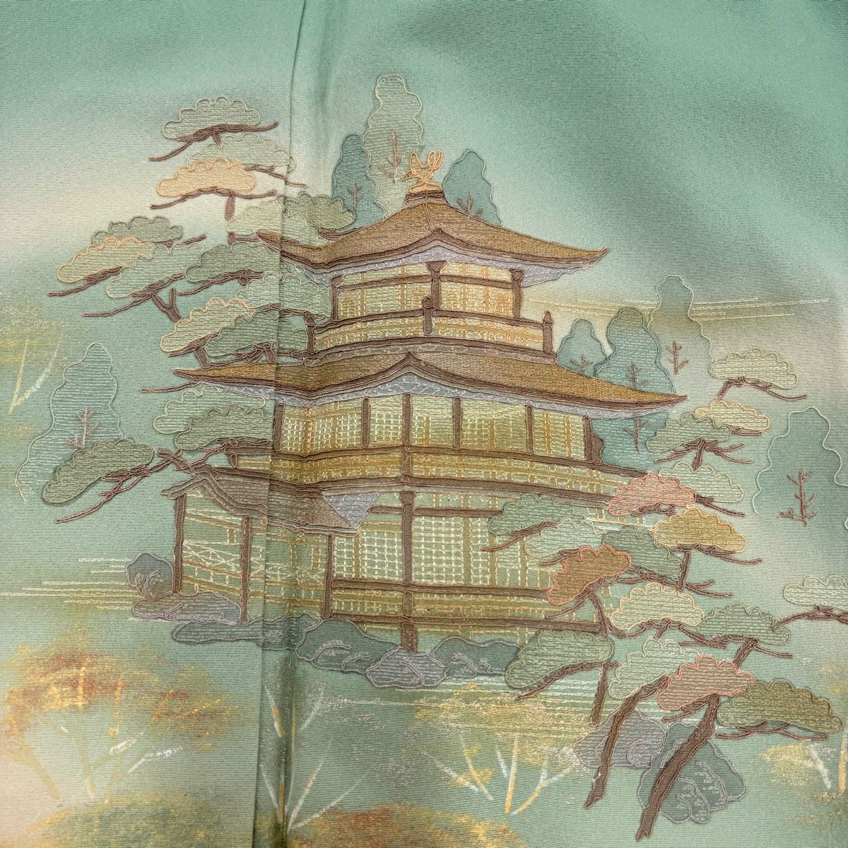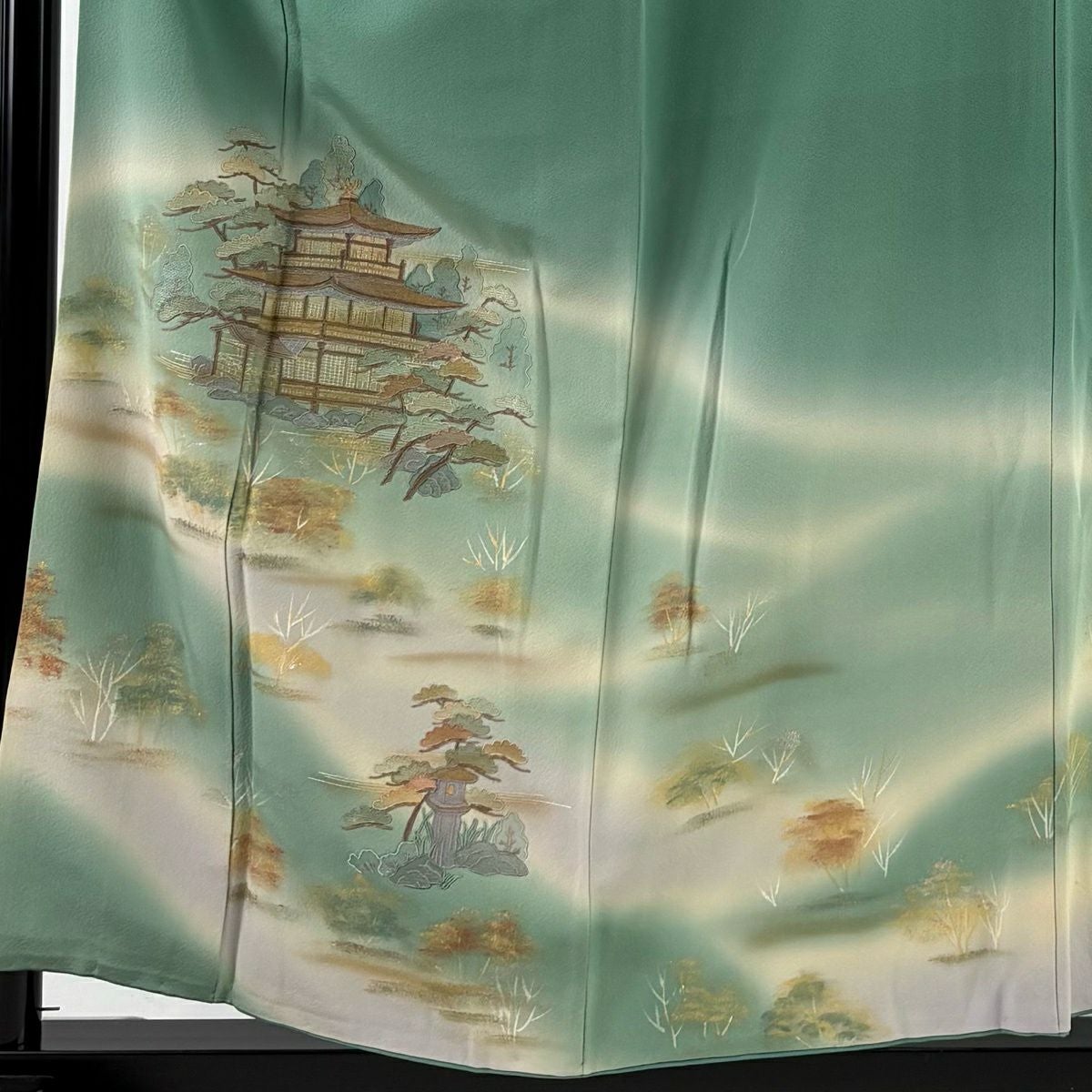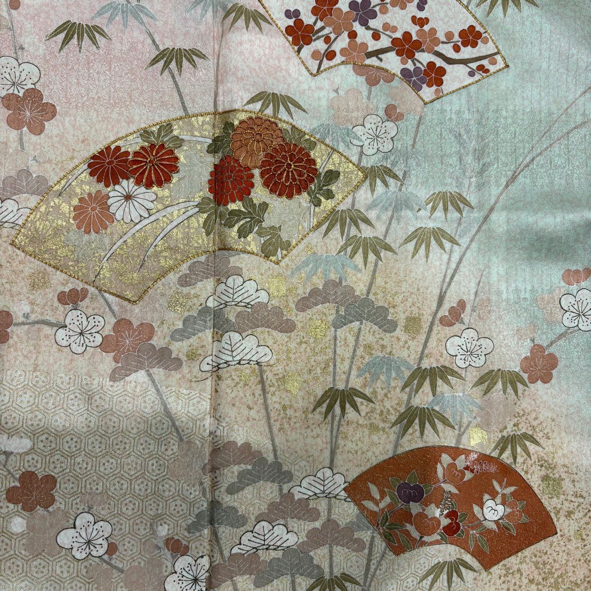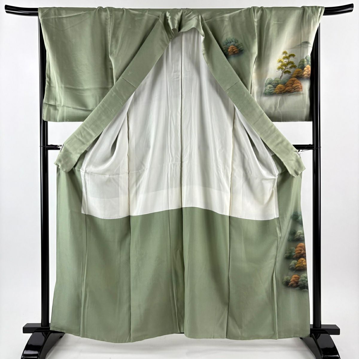 70%OFF 訪問着 身丈163.5cm 裄丈66cm M 袷 扇面 松竹梅 金糸 金彩 薄緑 正絹 秀品 K70