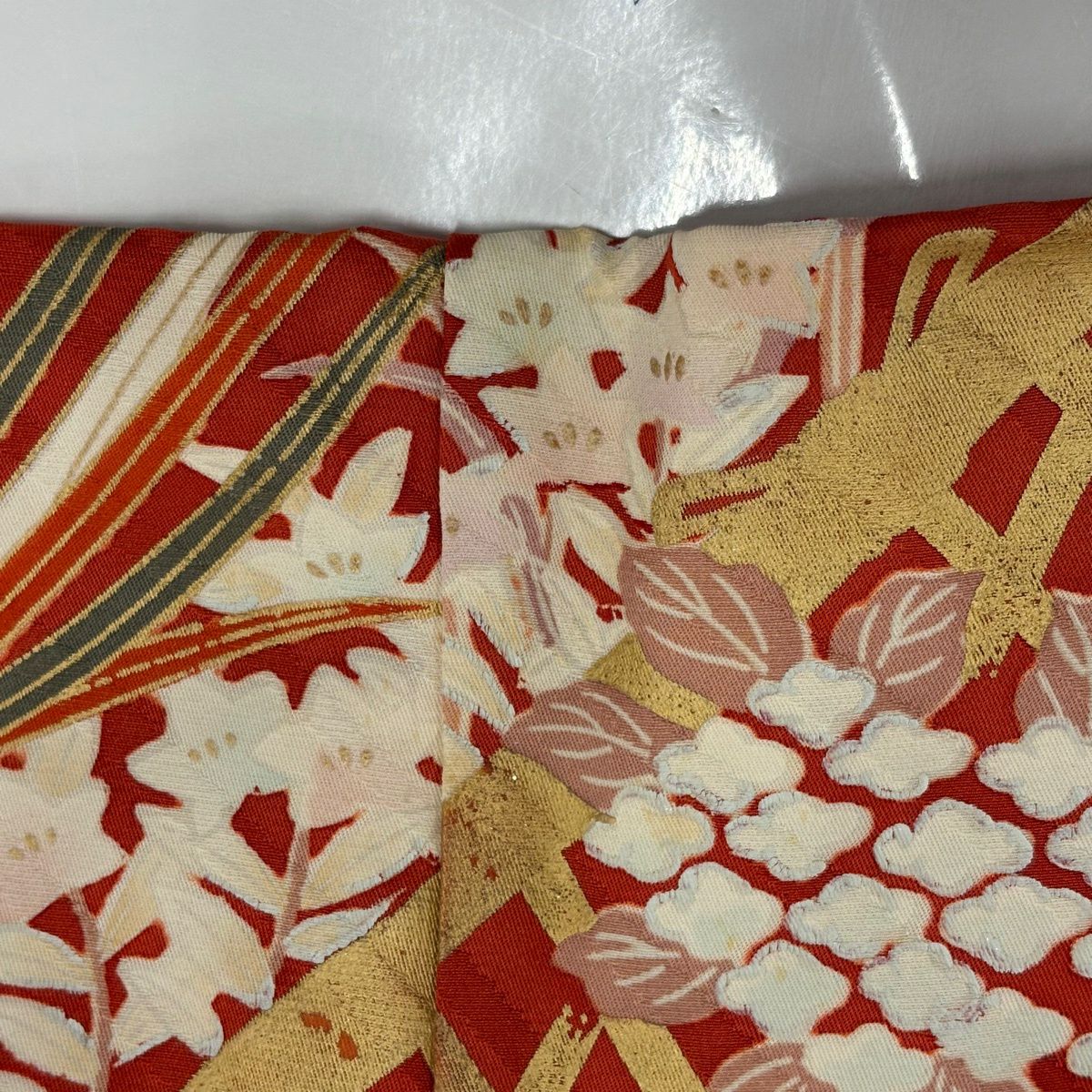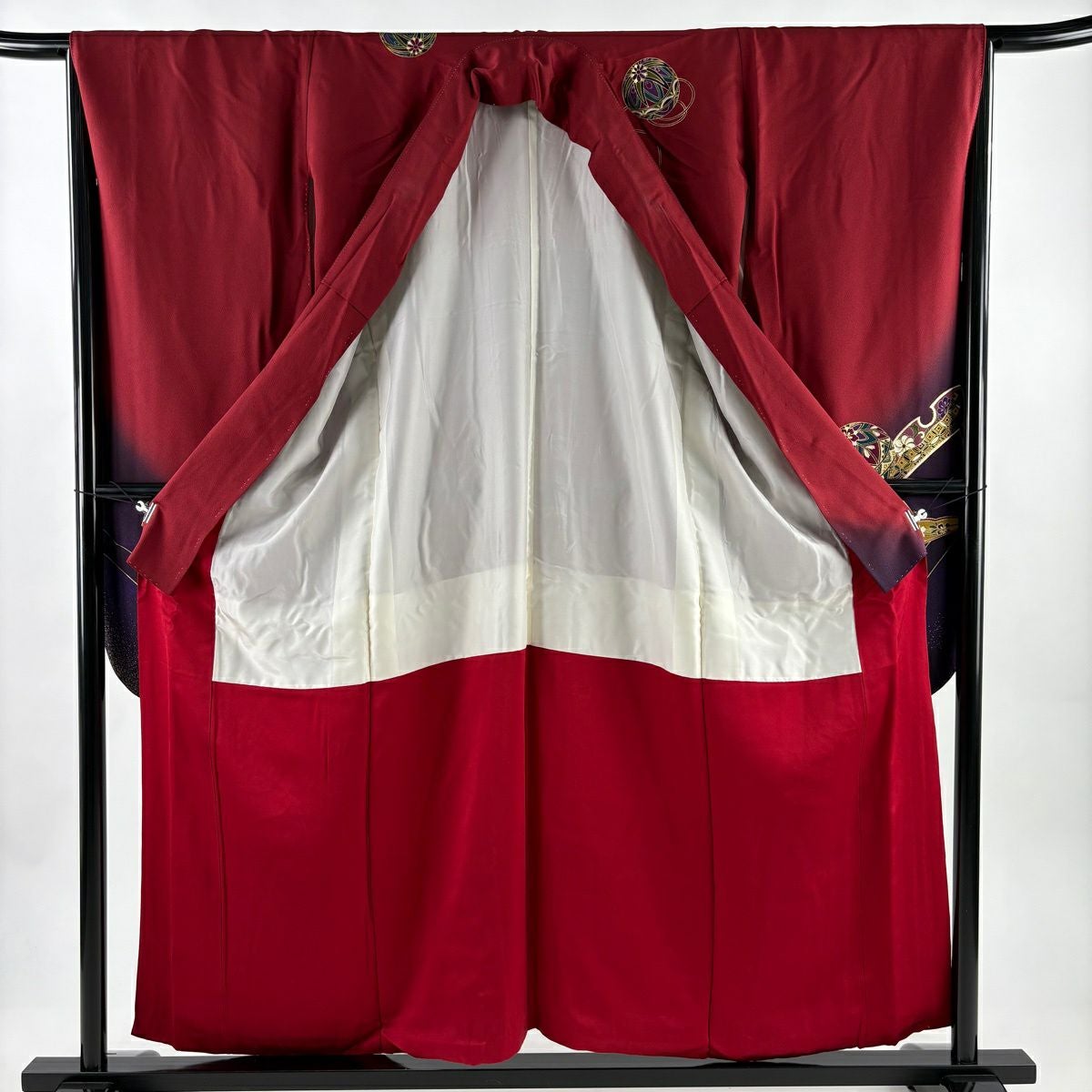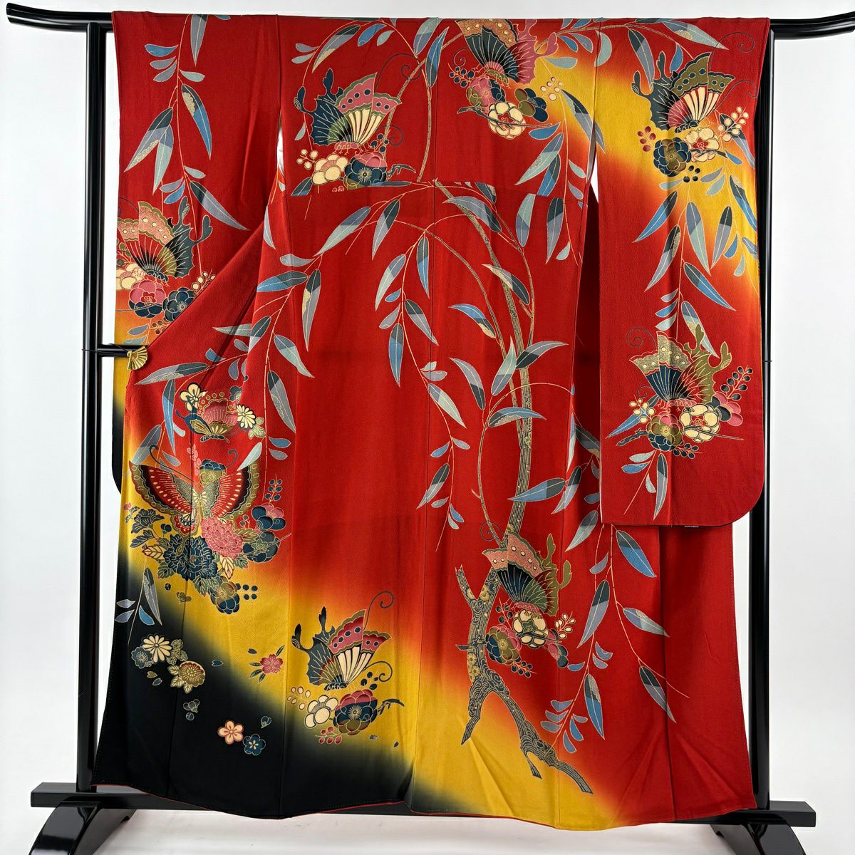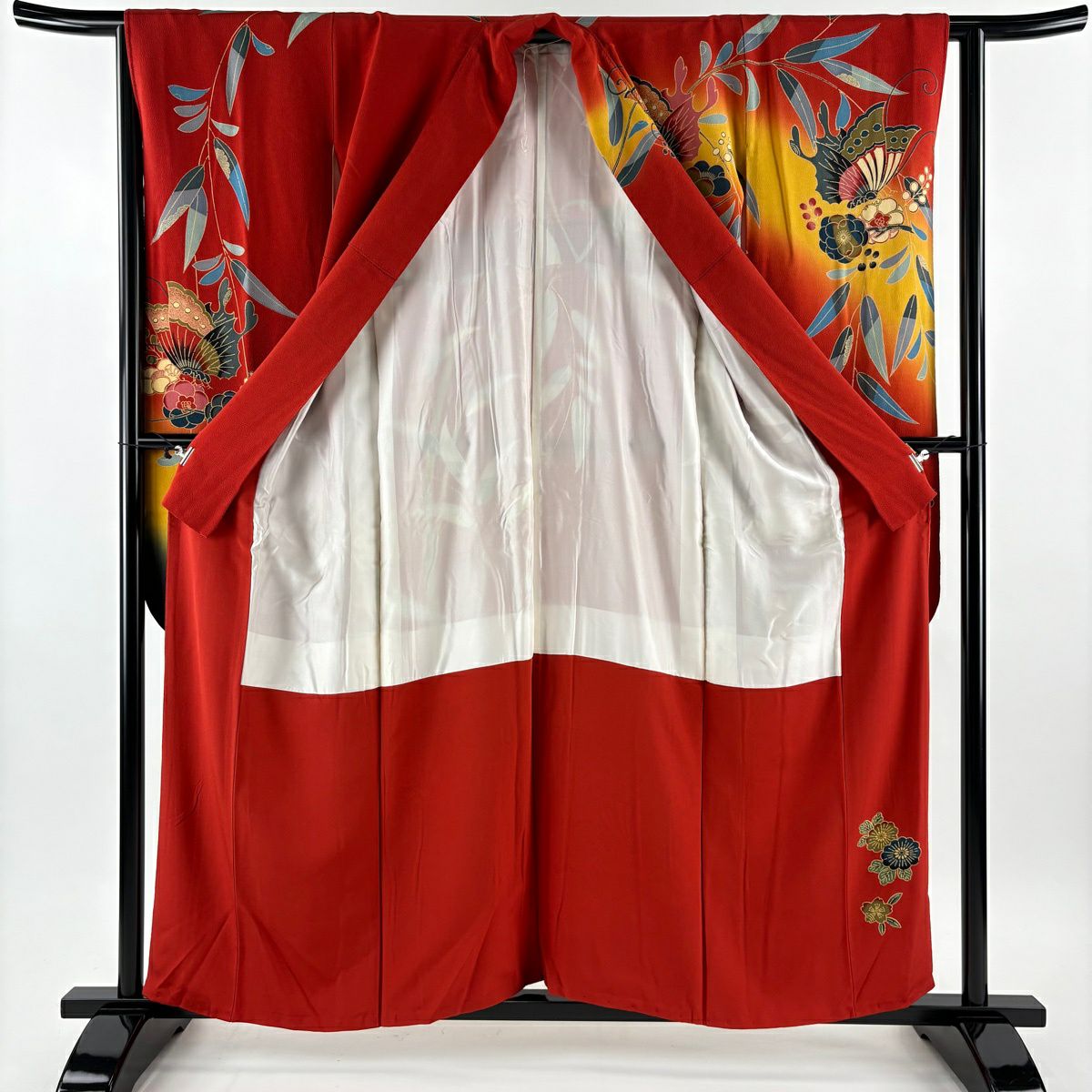 70%OFF 振袖 身丈158cm 裄丈65cm M 袷 やまと 花車 扇 刺繍 金糸 茜色 正絹 秀品 K70