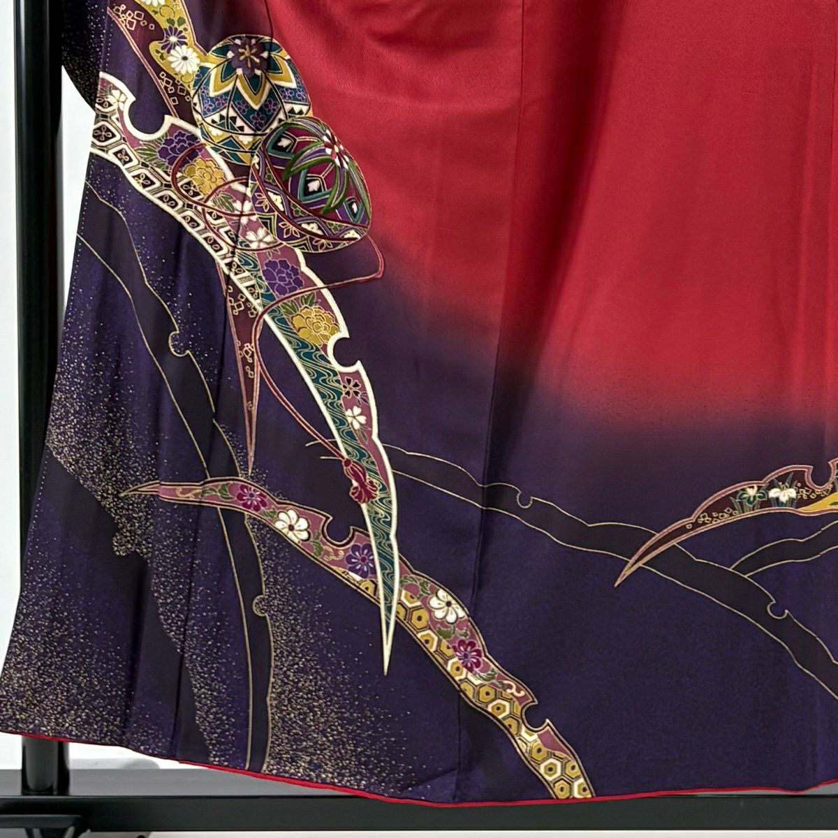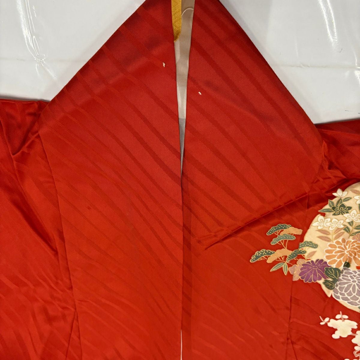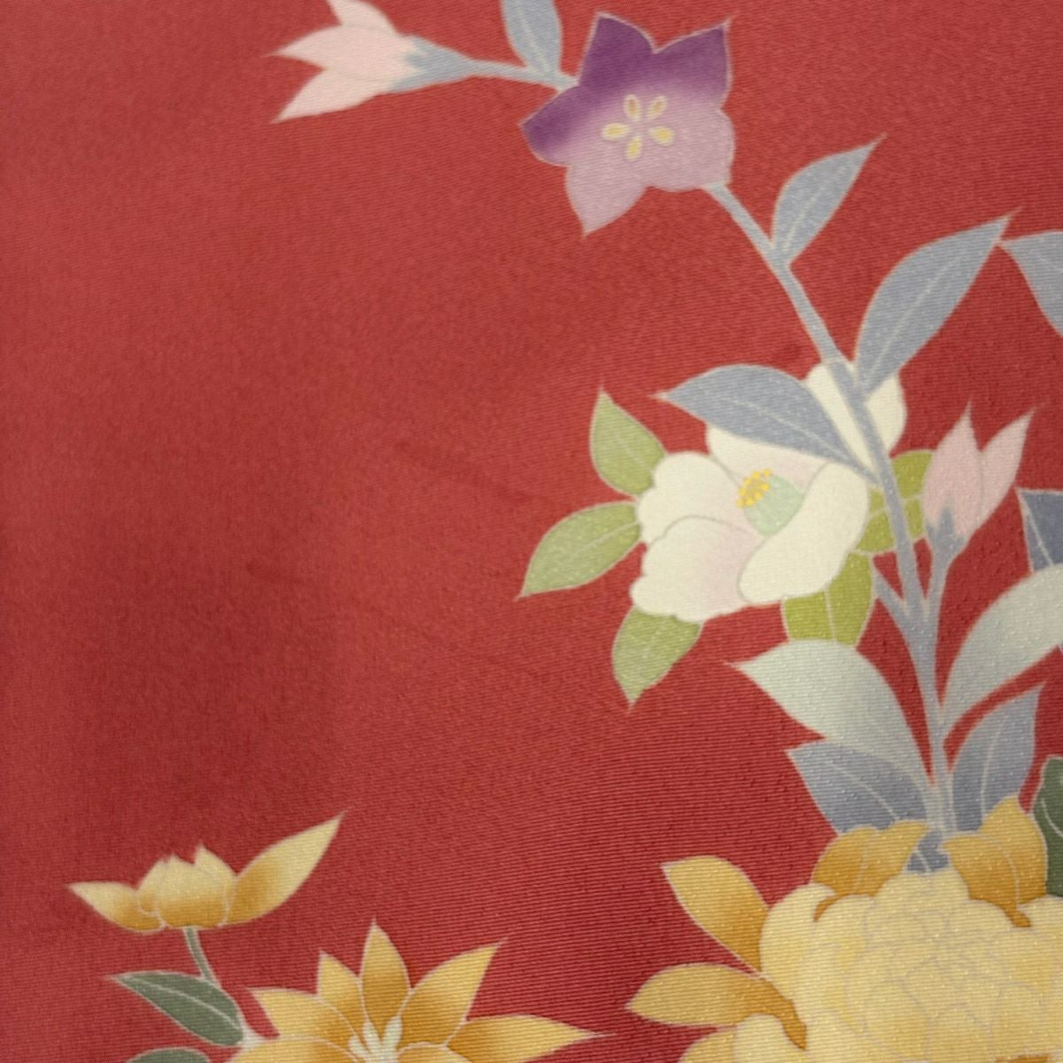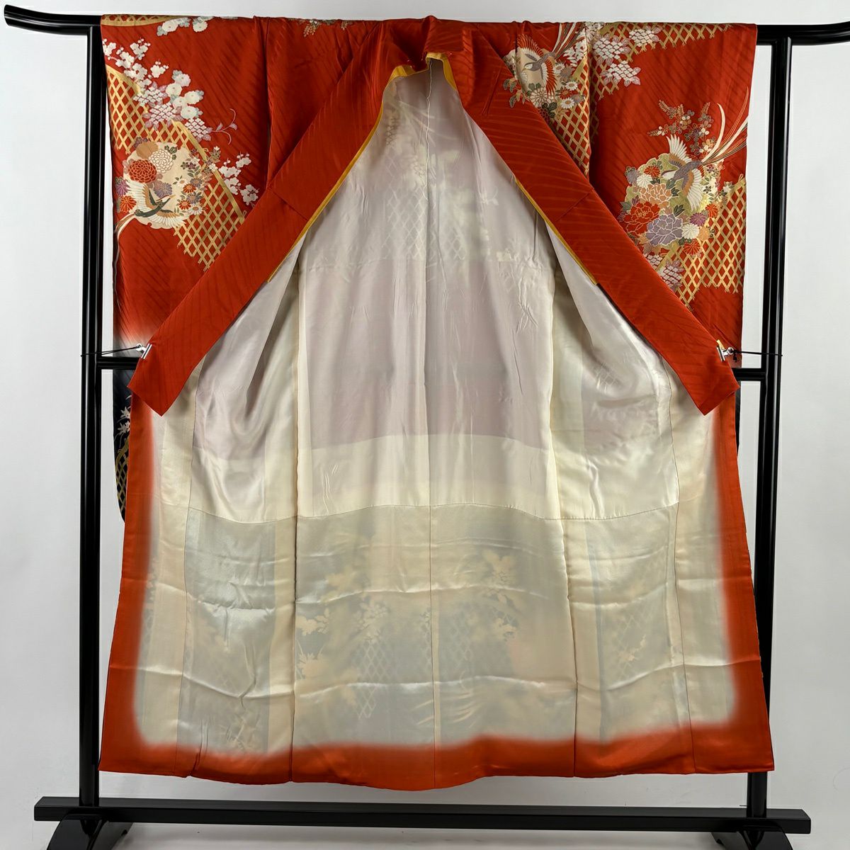 70%OFF 振袖 身丈158cm 裄丈65cm M 袷 やまと 花車 扇 刺繍 金糸 茜色 正絹 秀品 K70