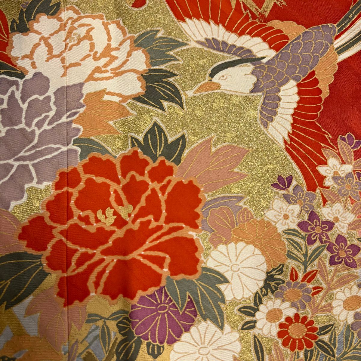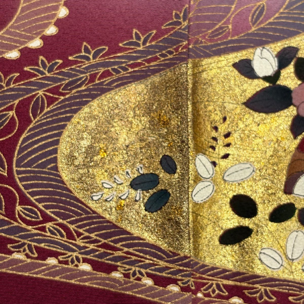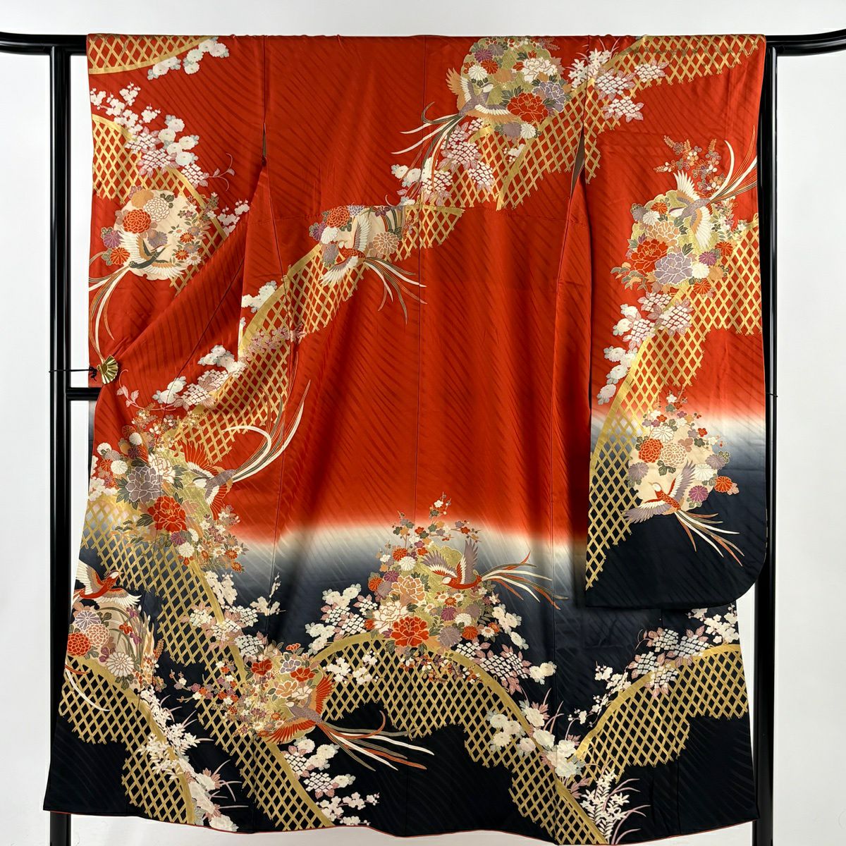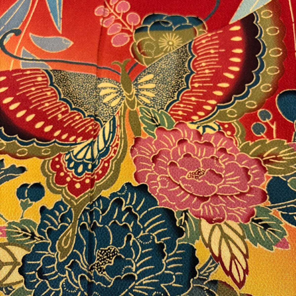 70%OFF 振袖 身丈158cm 裄丈65cm M 袷 やまと 花車 扇 刺繍 金糸 茜色 正絹 秀品 K70