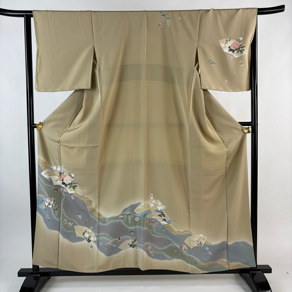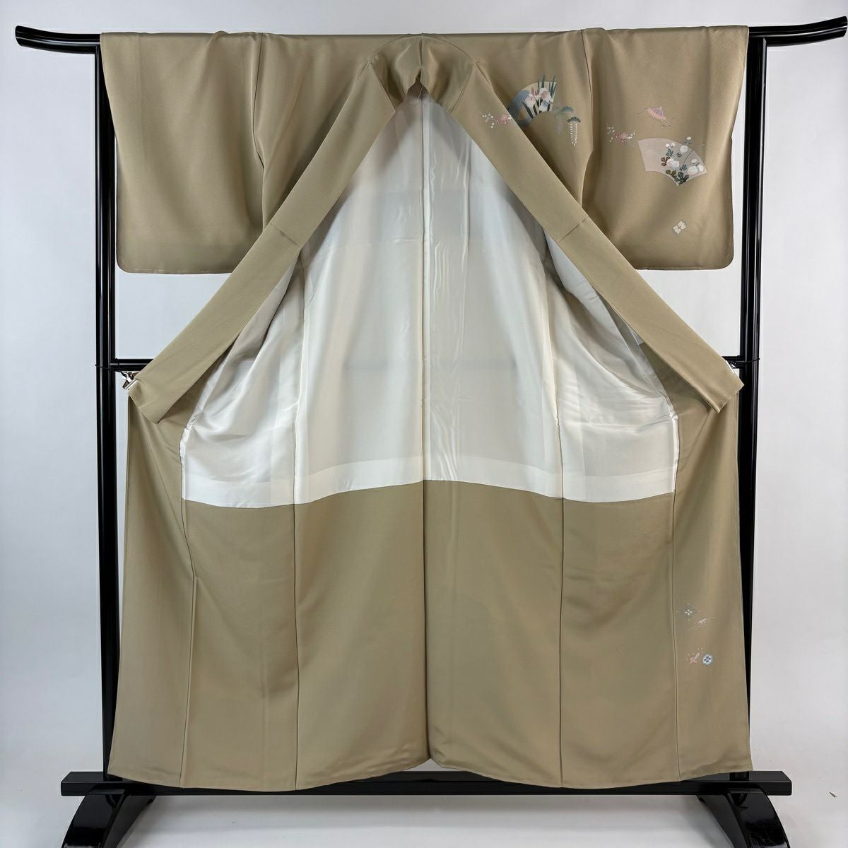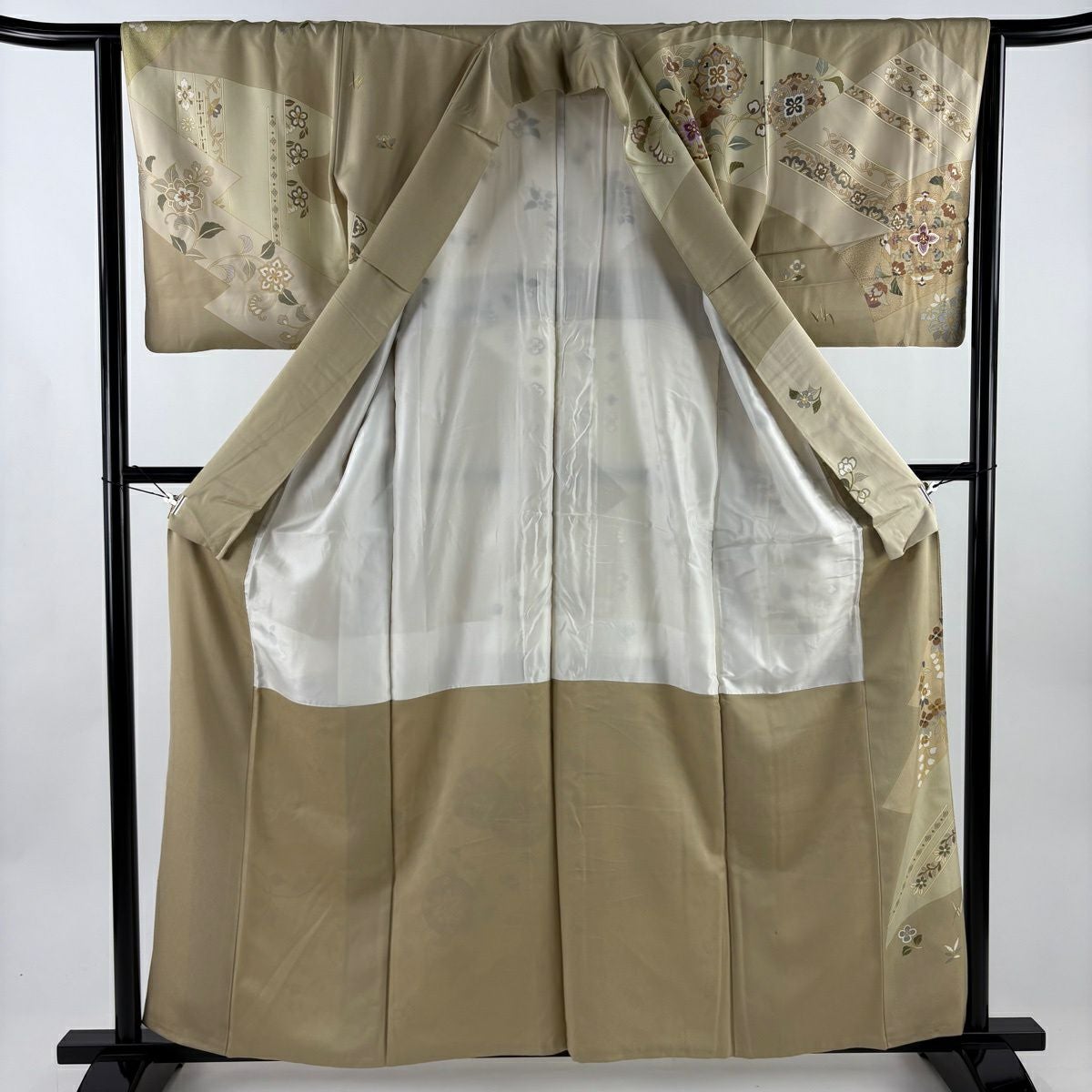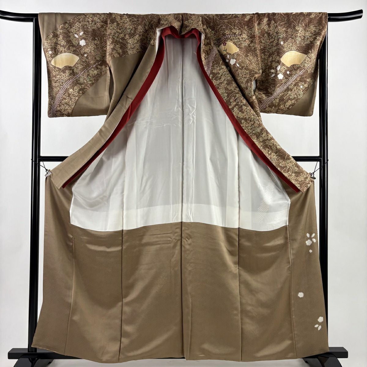 50%OFF 訪問着 身丈159cm 裄丈64.5cm M 袷 扇面 草花 金糸 金彩 薄茶色 正絹 秀品 K50