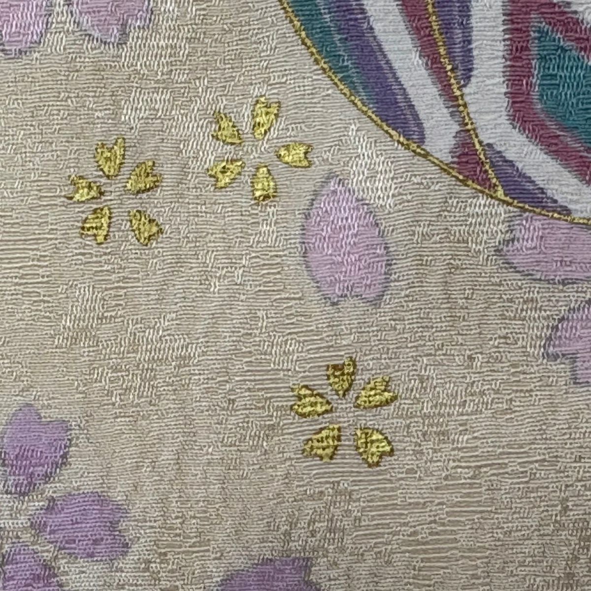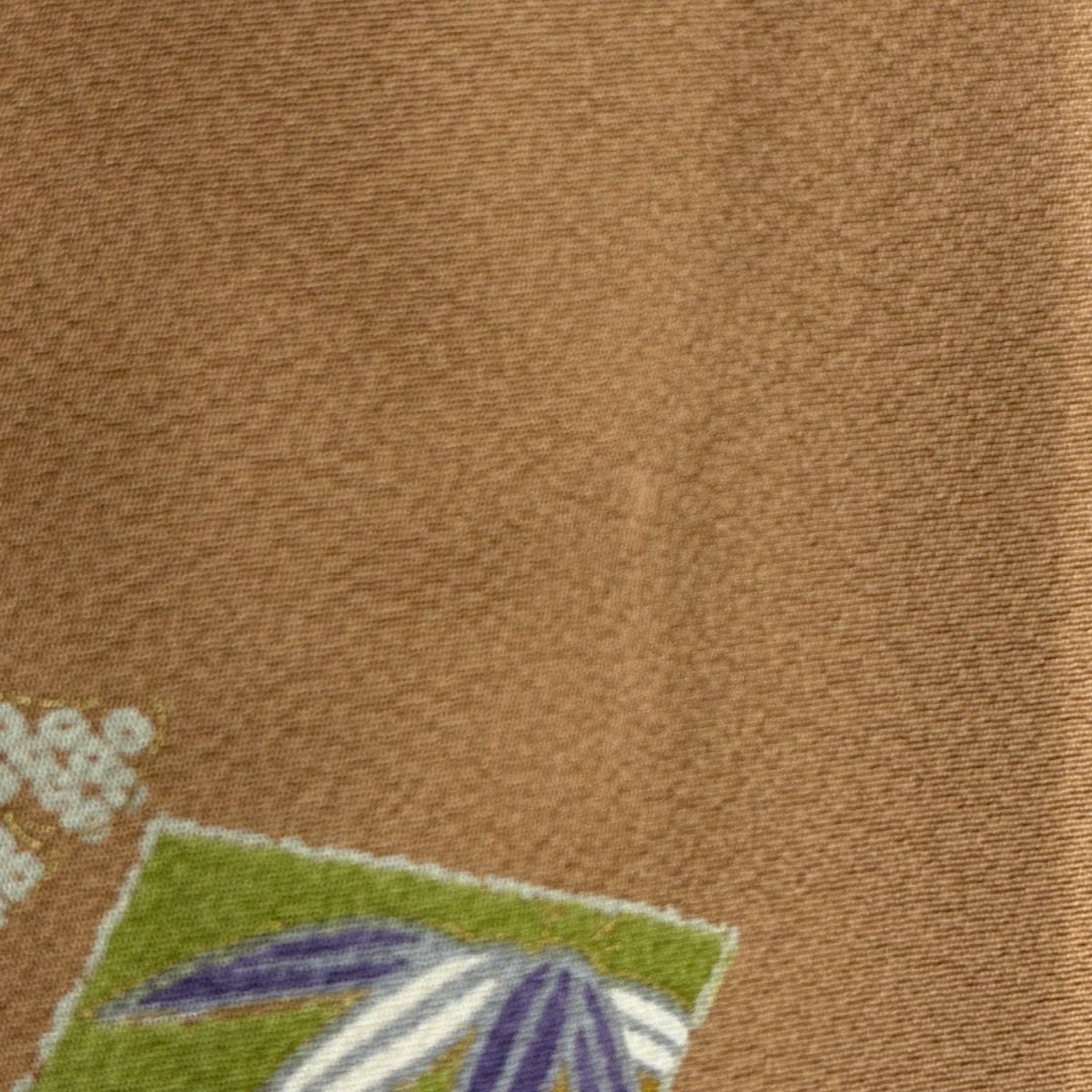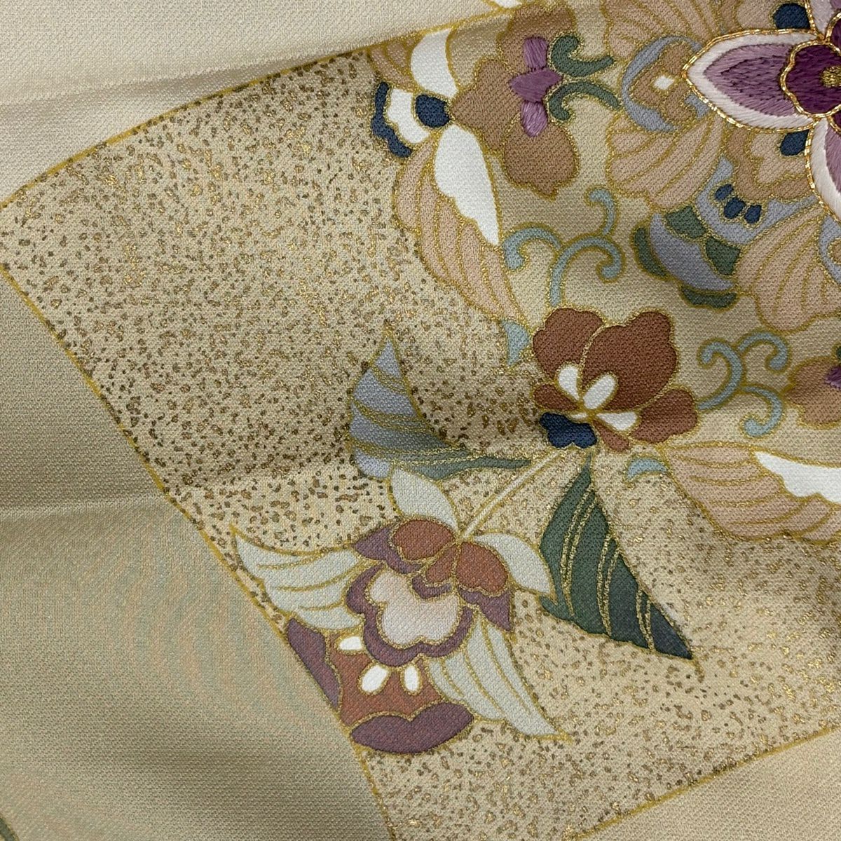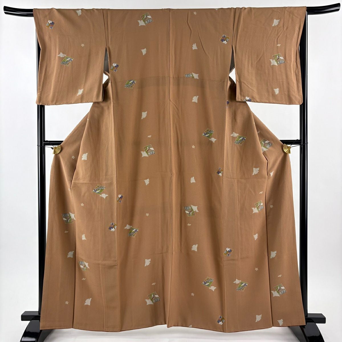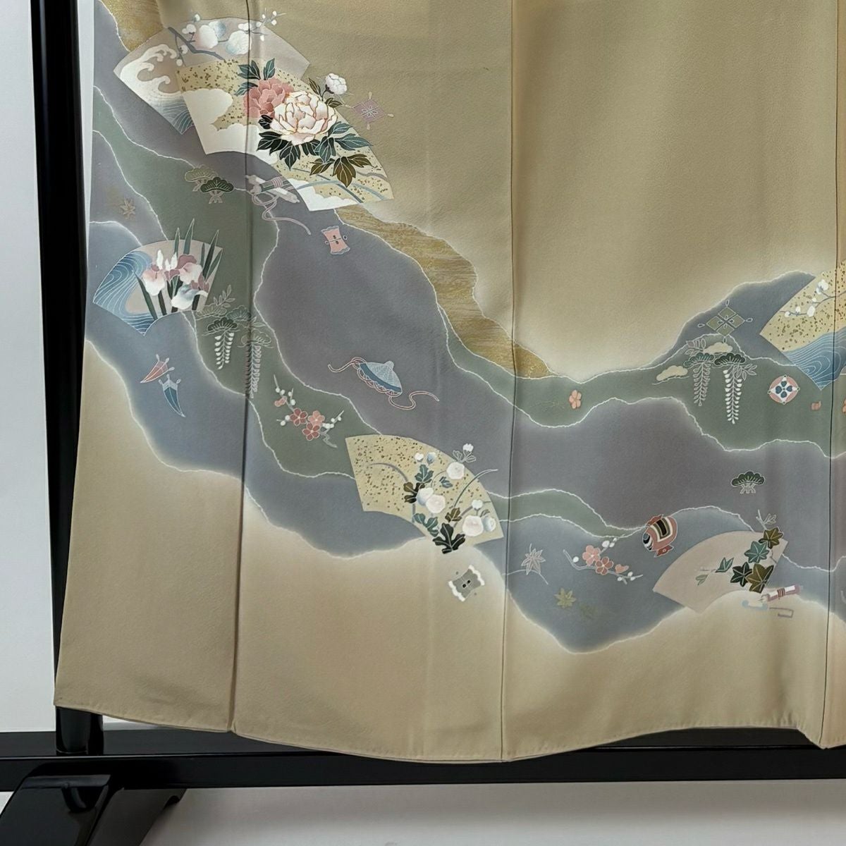 50%OFF 訪問着 身丈159cm 裄丈64.5cm M 袷 扇面 草花 金糸 金彩 薄茶色 正絹 秀品 K50