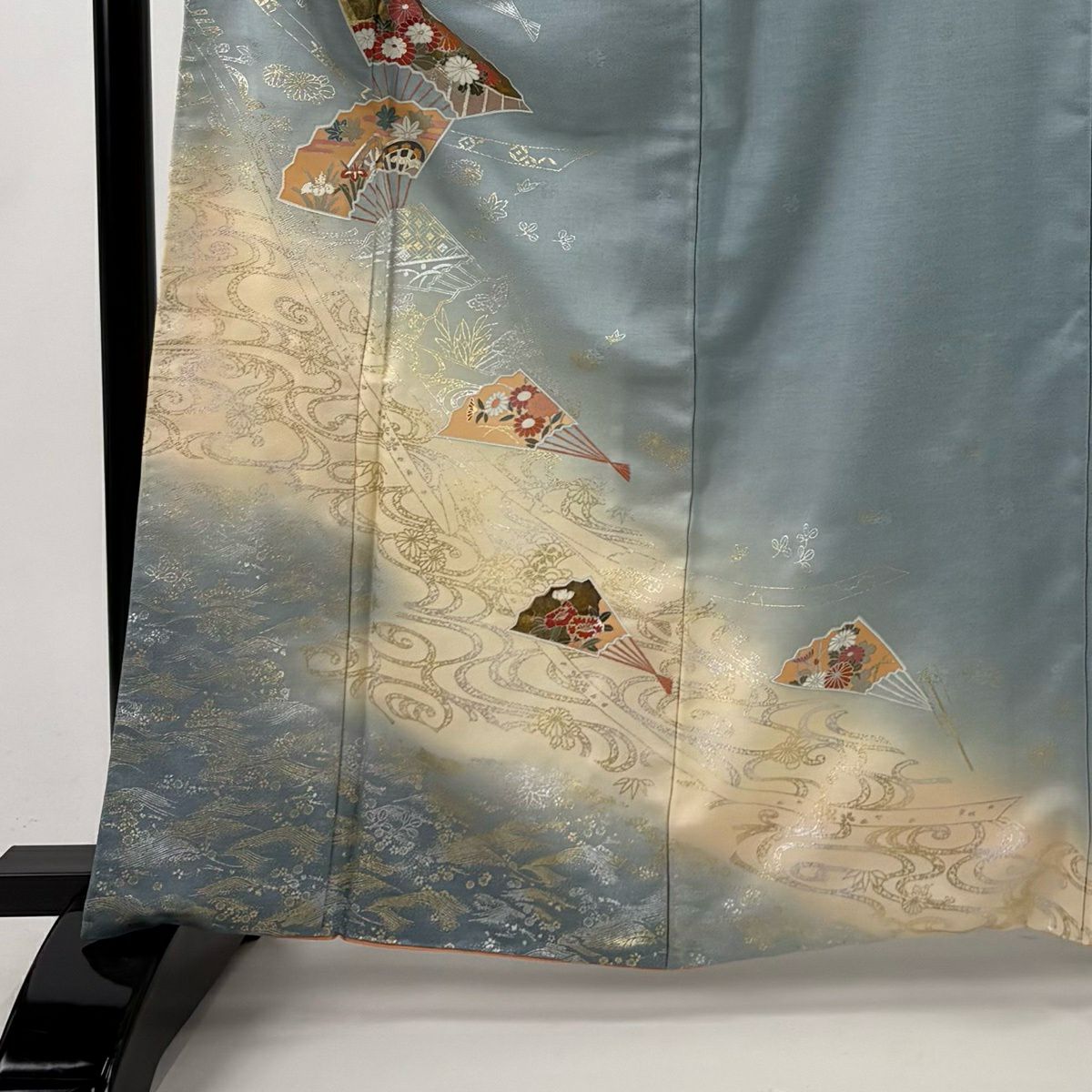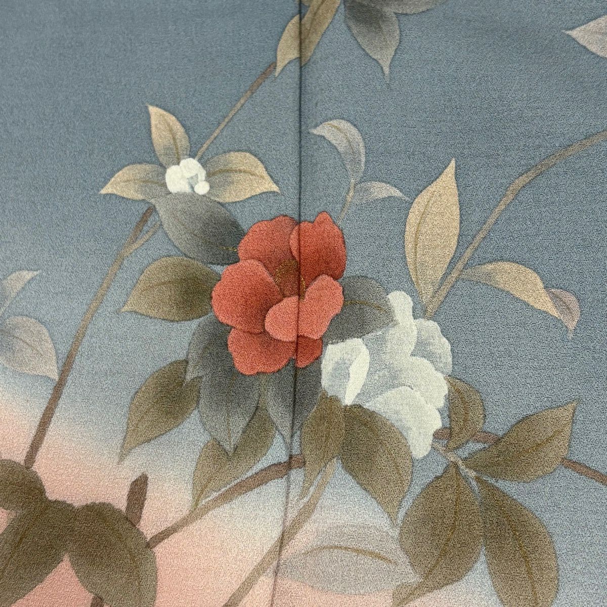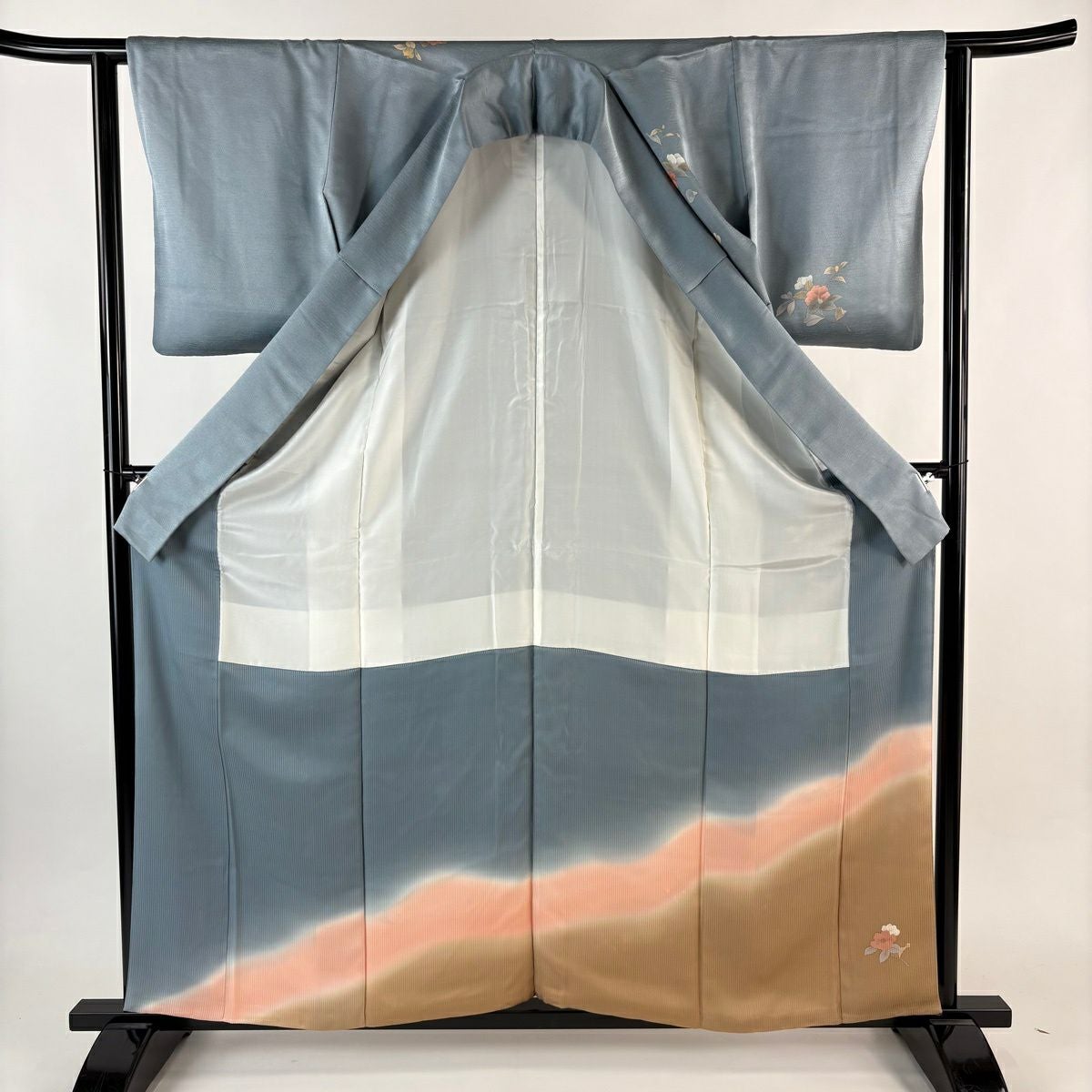 50%OFF 訪問着 身丈160cm 裄丈62cm S 袷 椿 枝梅 金彩 染め分け 青灰色 正絹 秀品 K50