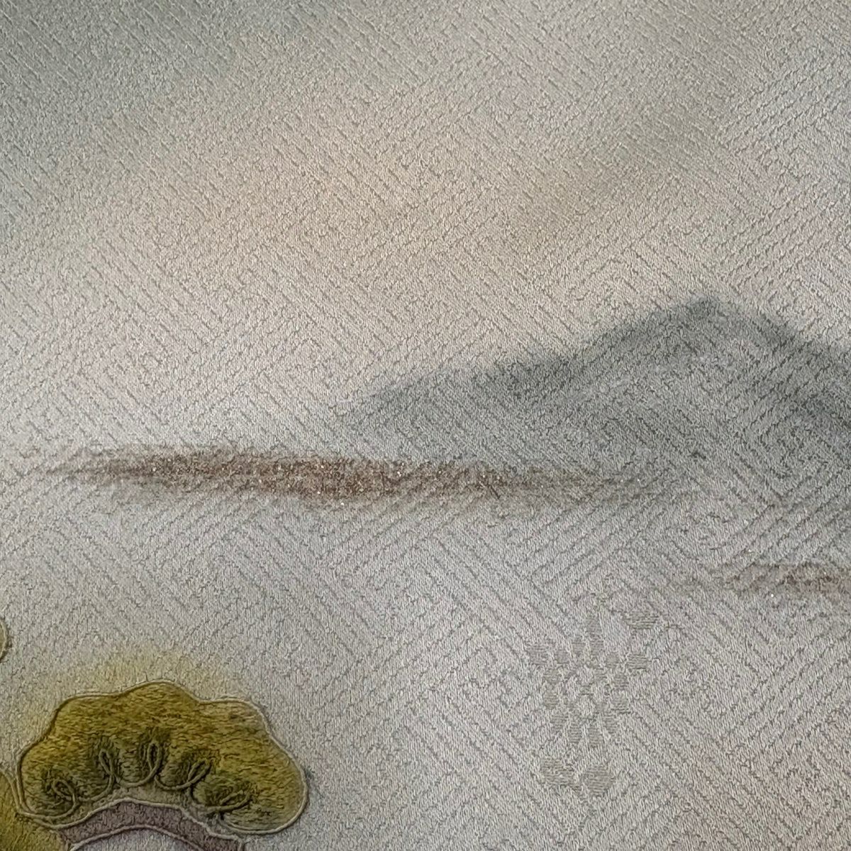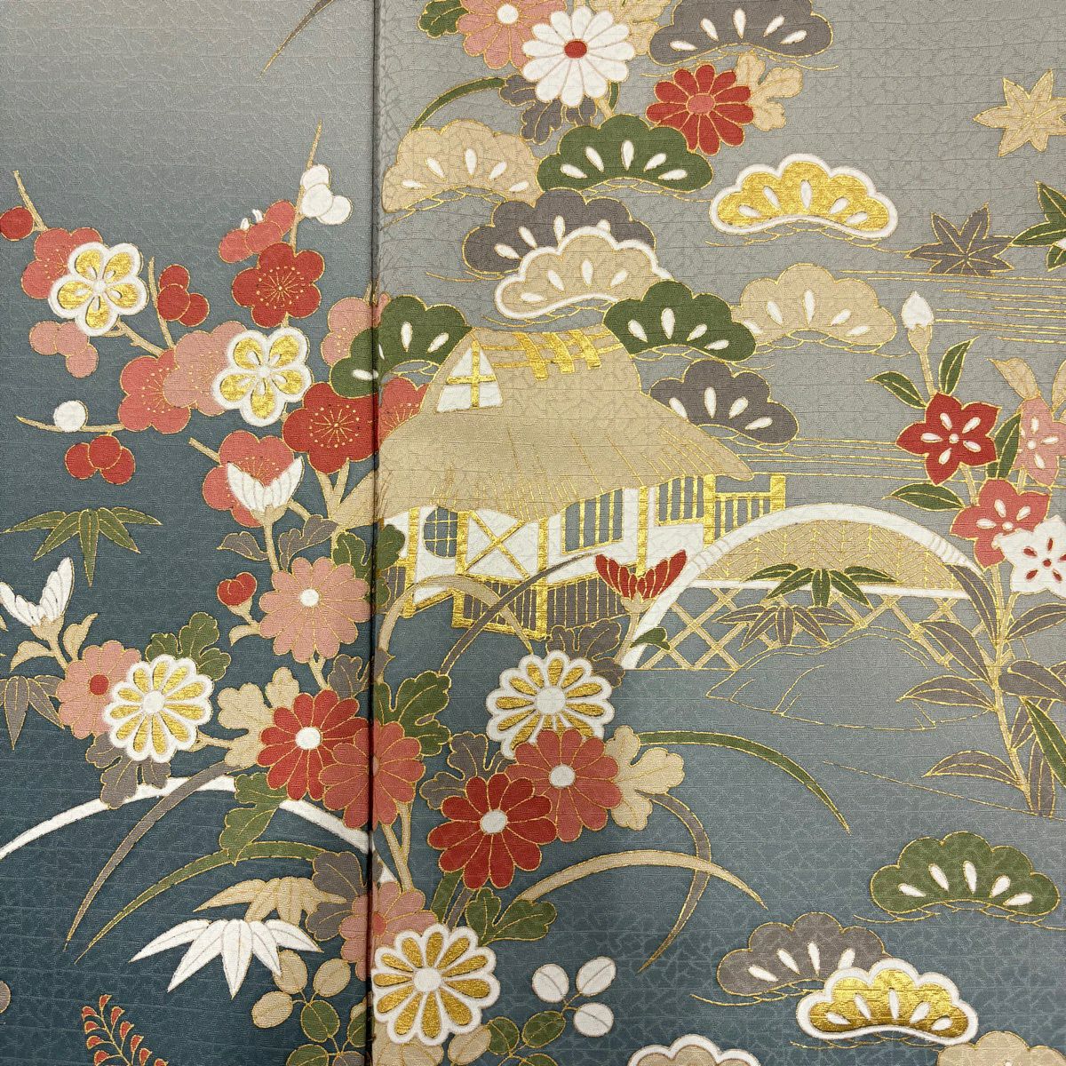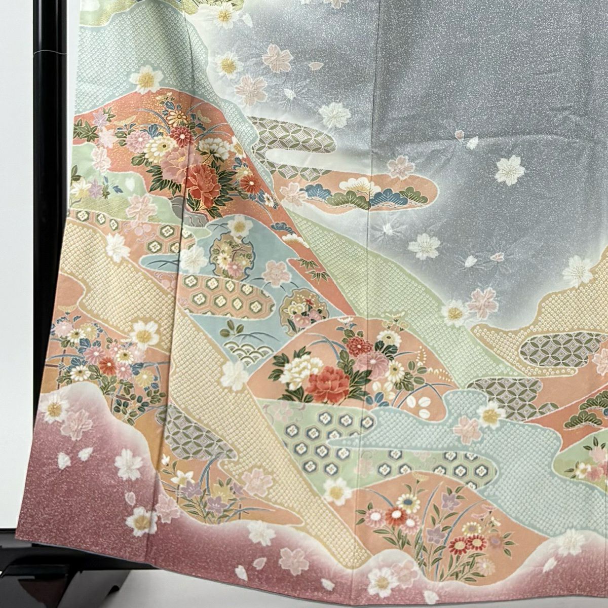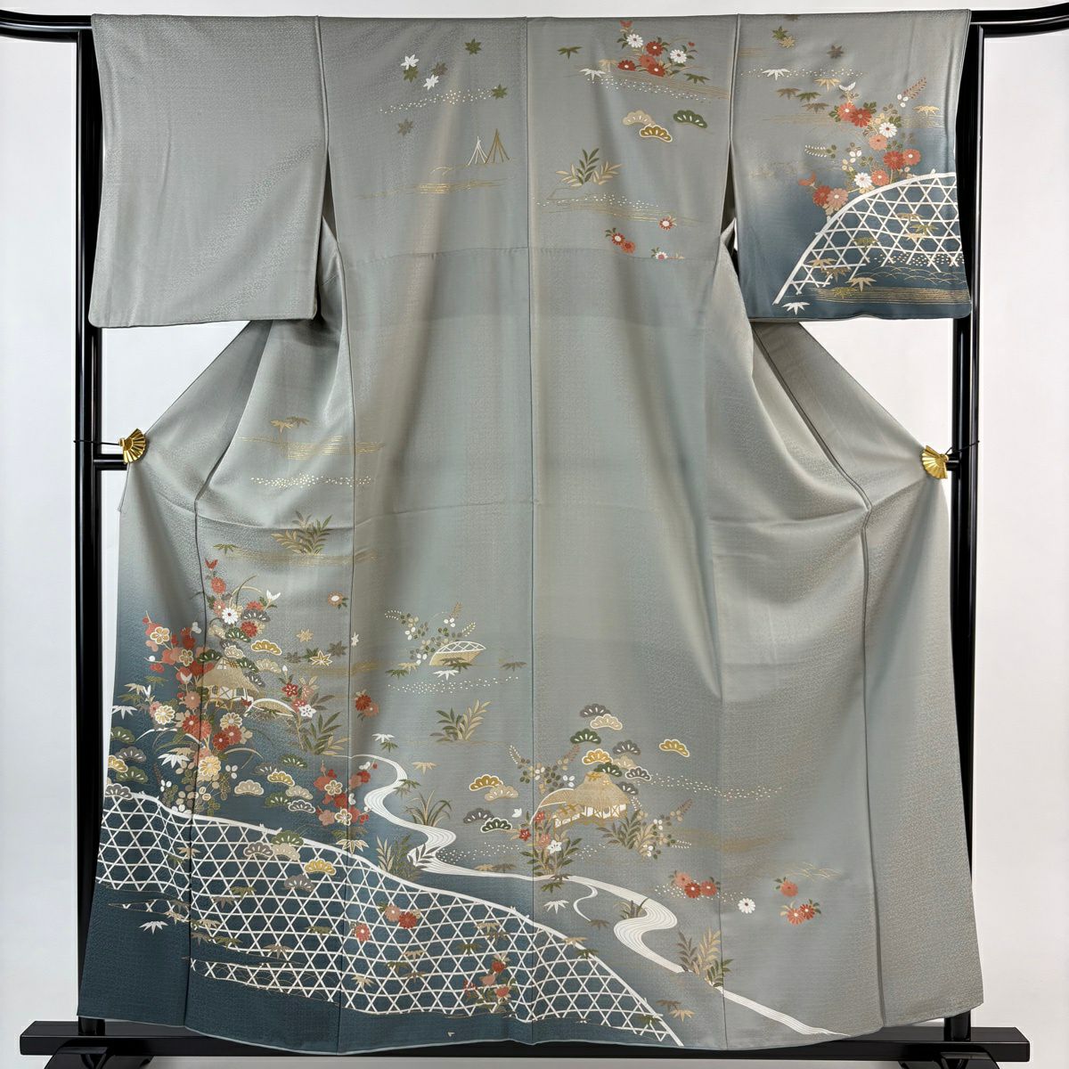 50%OFF 訪問着 身丈158cm 裄丈65cm M 袷 松竹梅 建物 金彩 ぼかし 灰色 正絹 秀品 K50