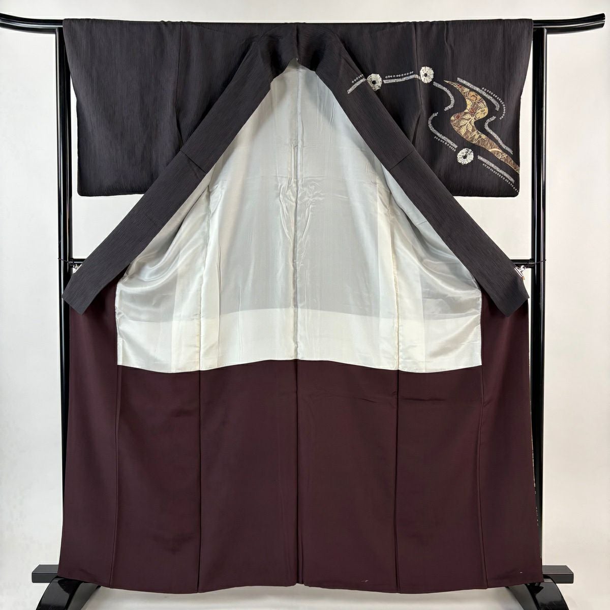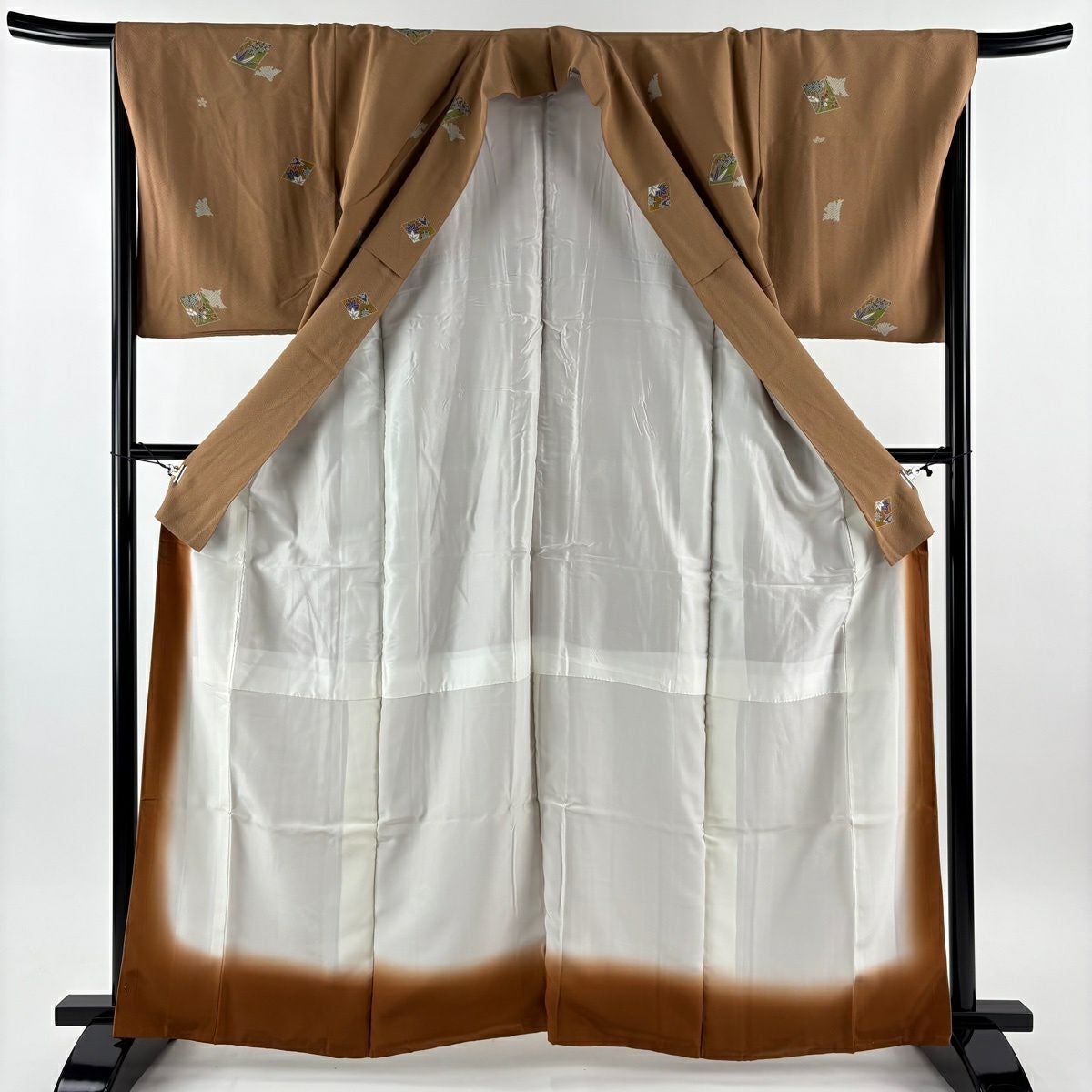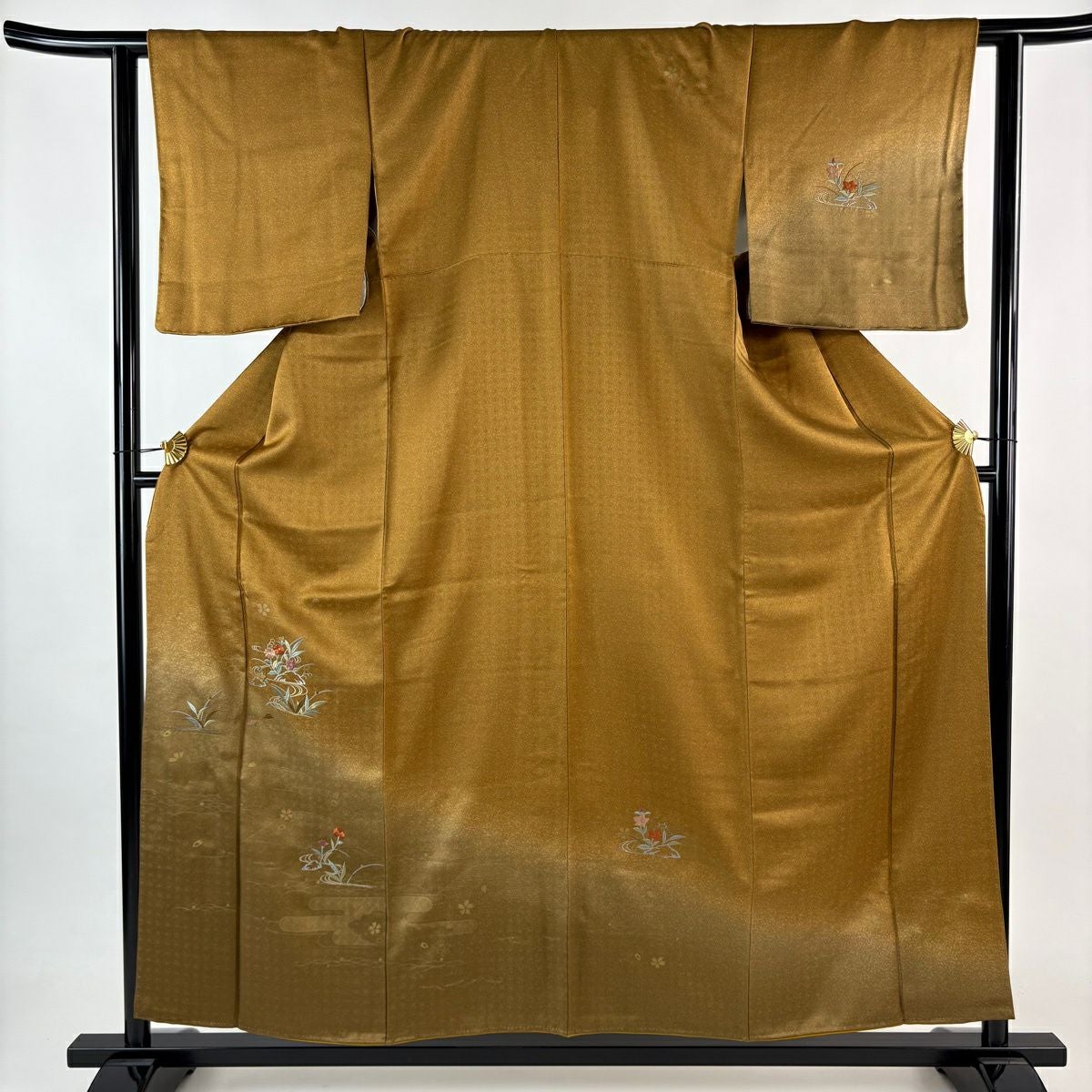 50%OFF 付下げ 身丈157cm 裄丈62.5cm S 袷 草花 流水 銀糸 刺繍 茶色 正絹 秀品 K50