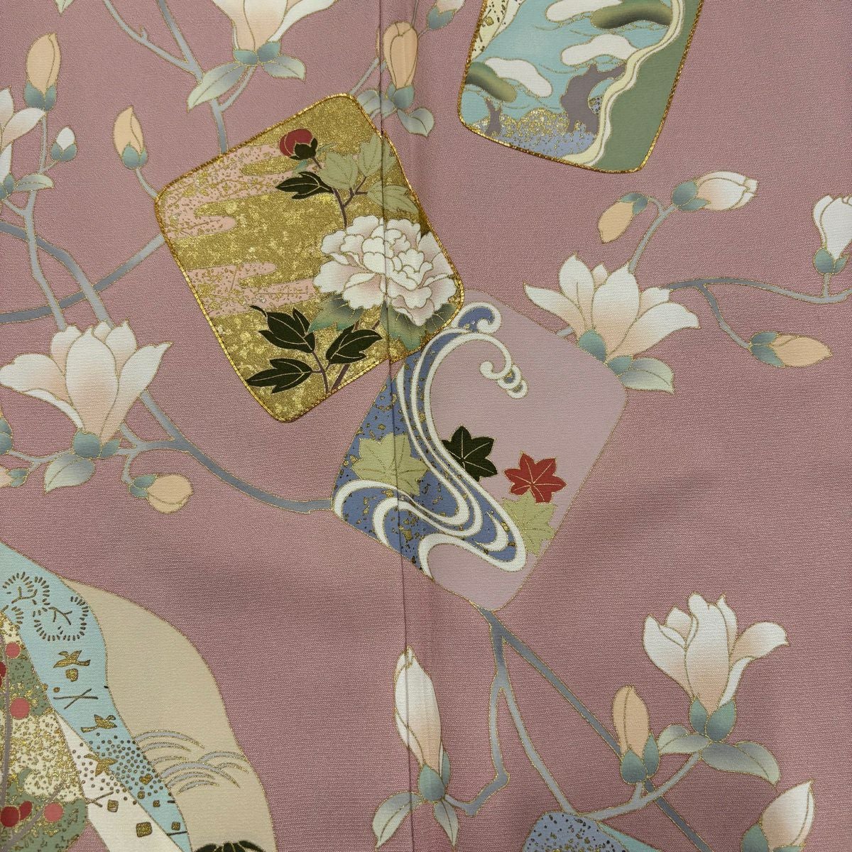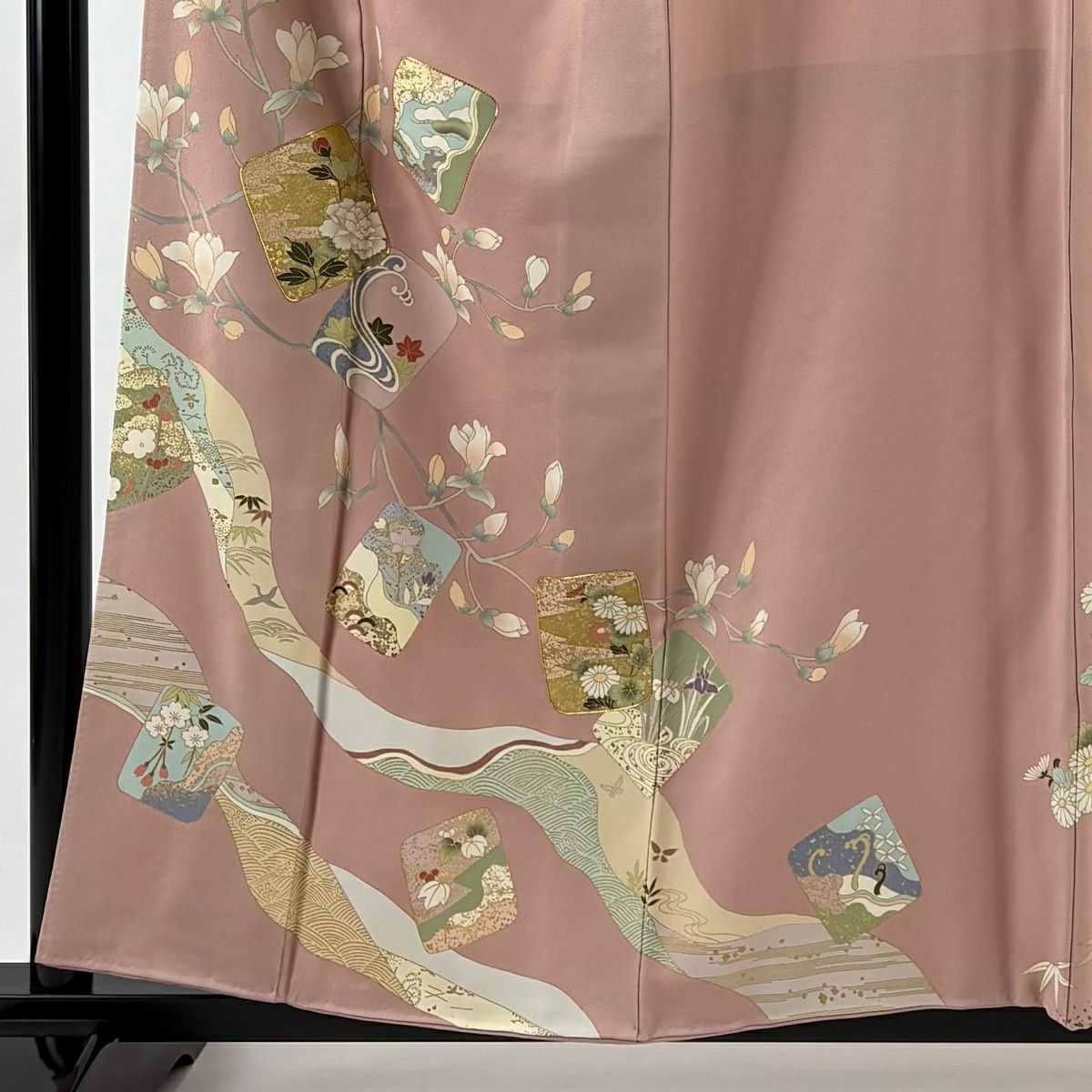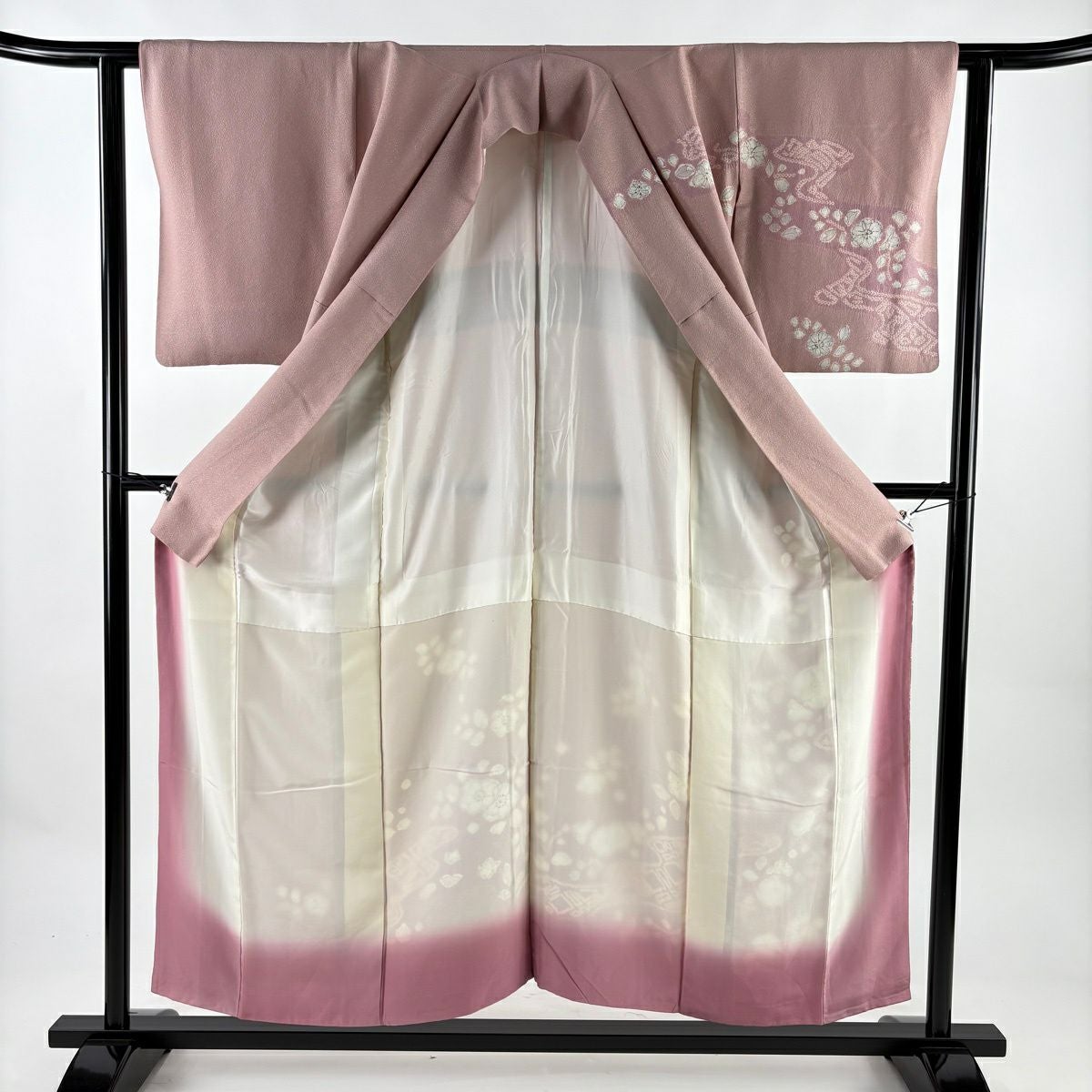 50%OFF 訪問着 身丈154cm 裄丈65.5cm M 袷 枝花 霞 金糸 金彩 ピンク 正絹 秀品 K50