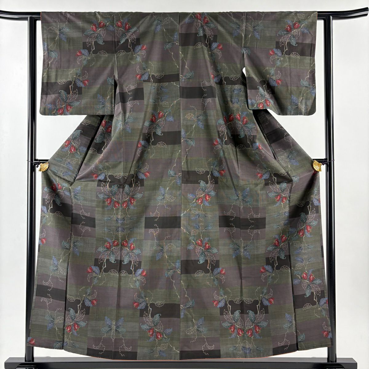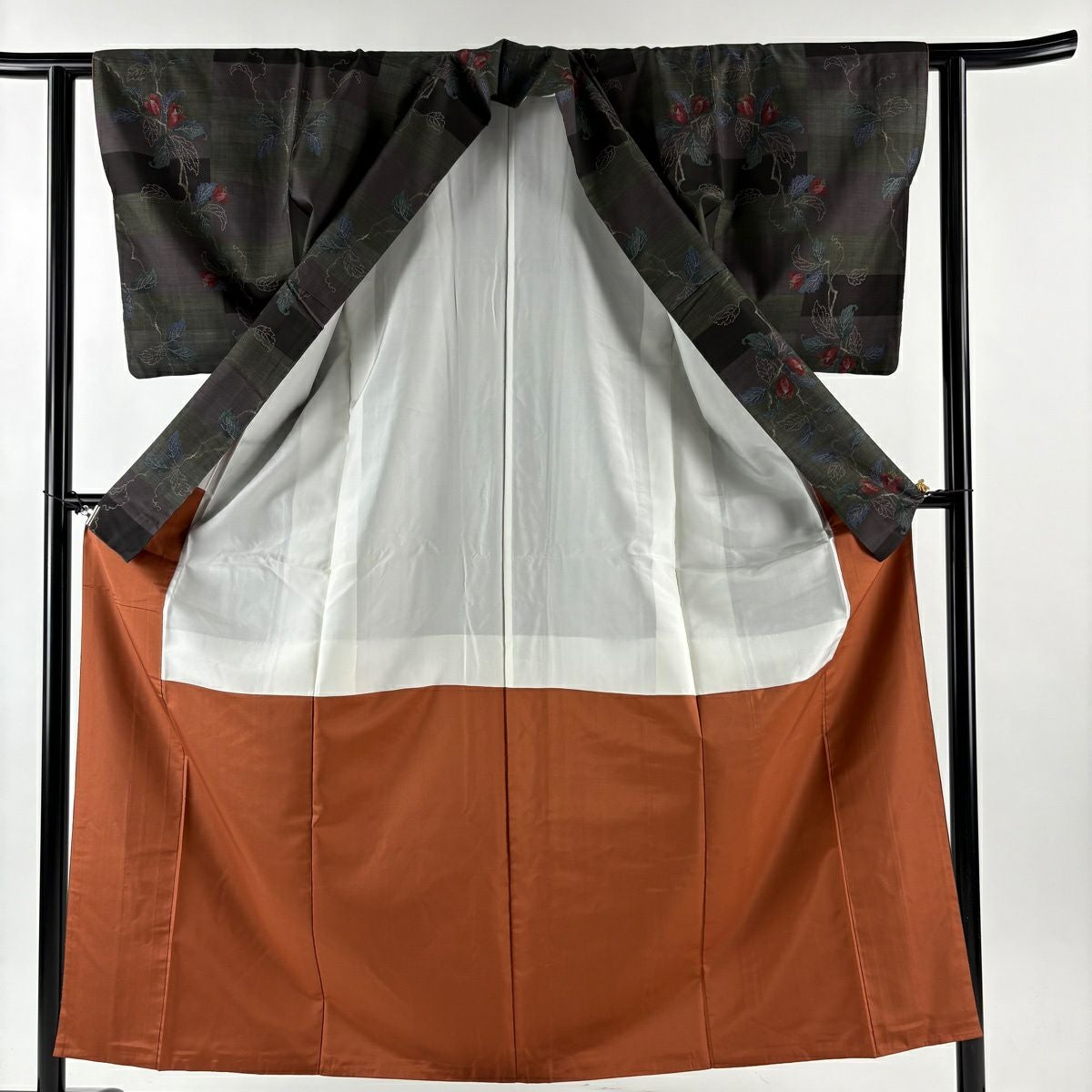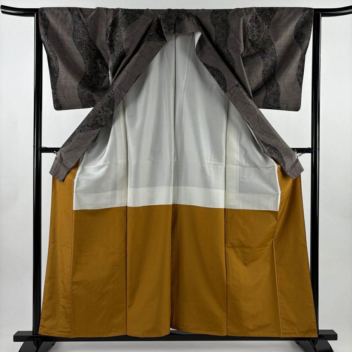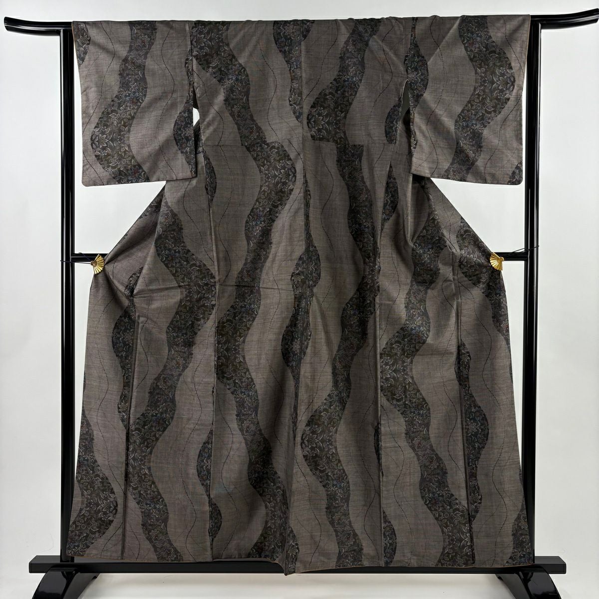 【最終値引き】 70%OFF 紬 身丈159cm 裄丈63cm S 袷 草花 よろけ縞 灰茶 正絹 秀品 K70
