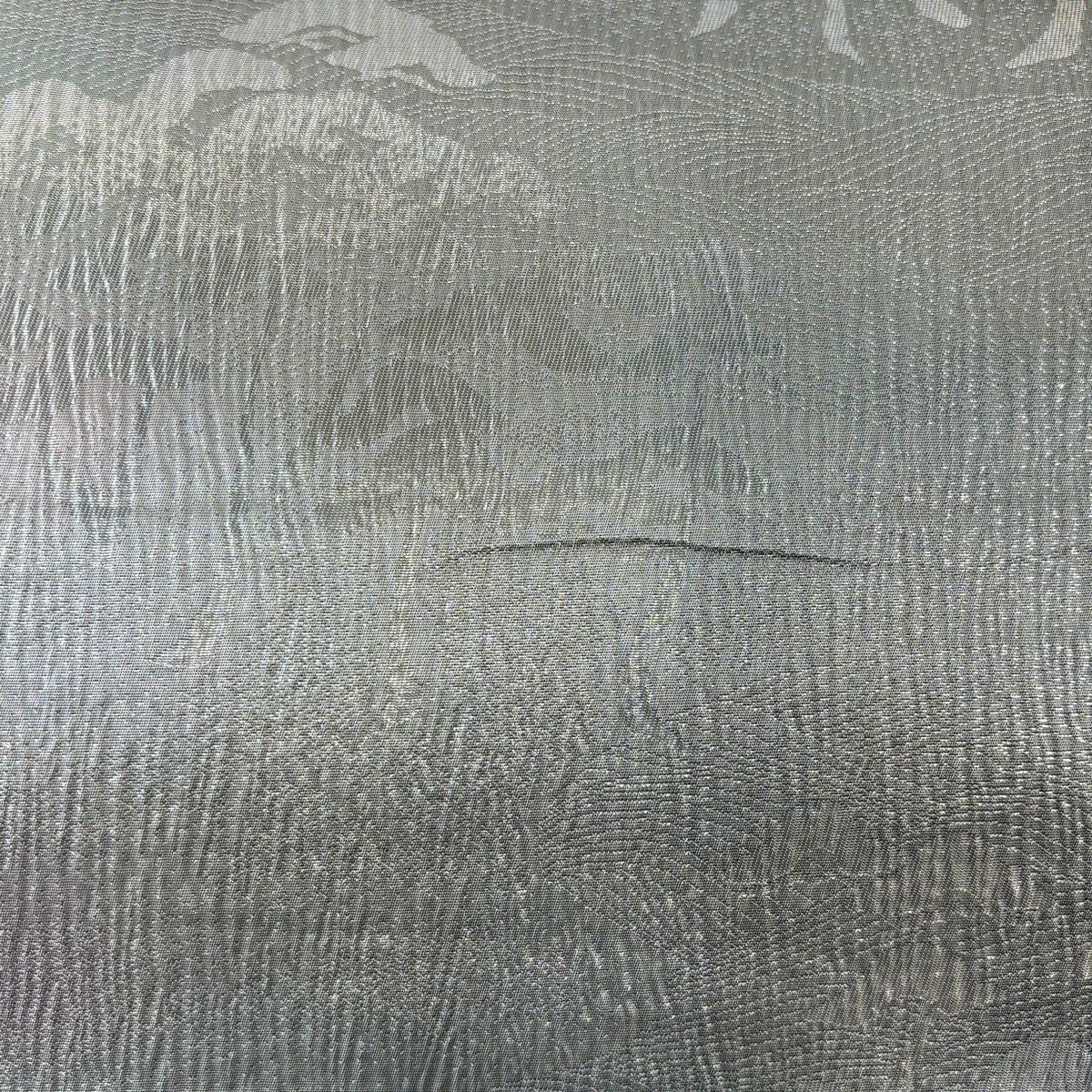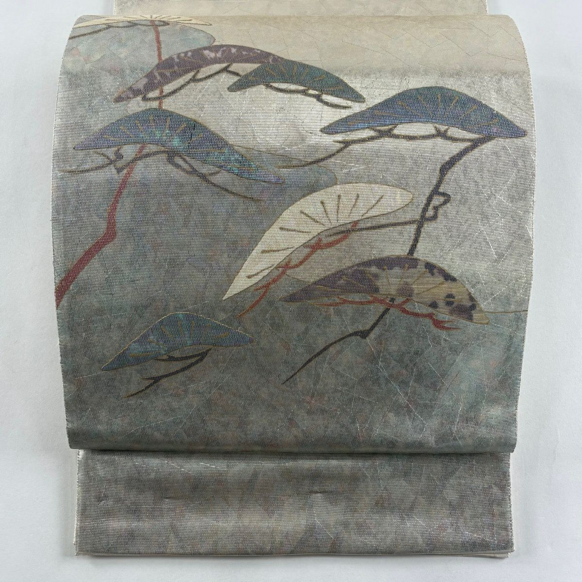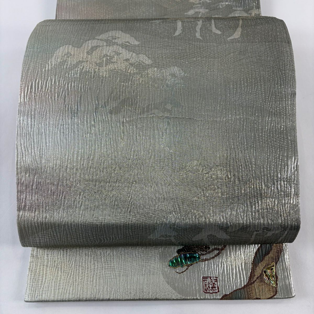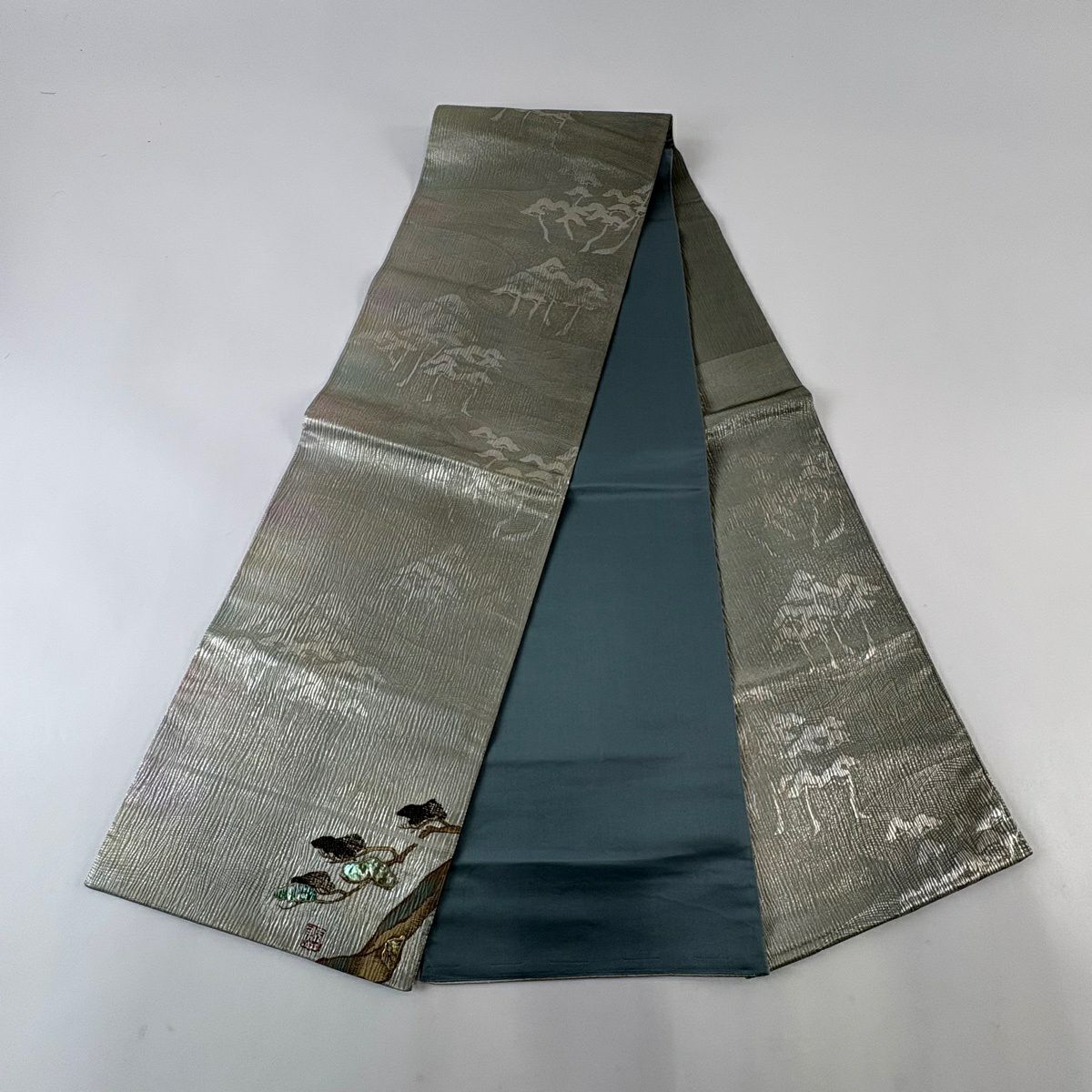【最終値引き】 77%OFF 【美品】 袋帯 秀品 ワンポイント柄 松 波 箔 螺鈿 灰緑 六通 正絹 K70