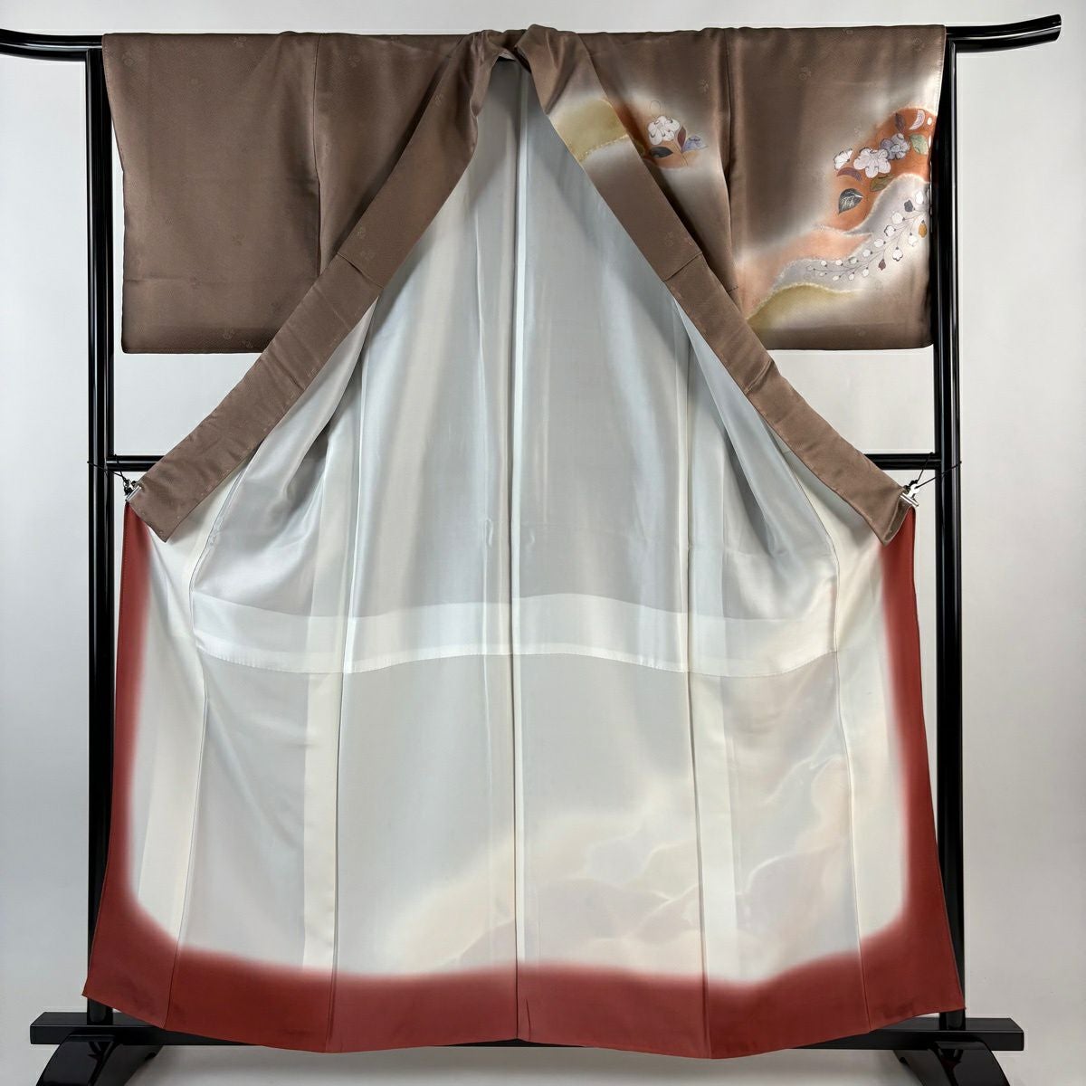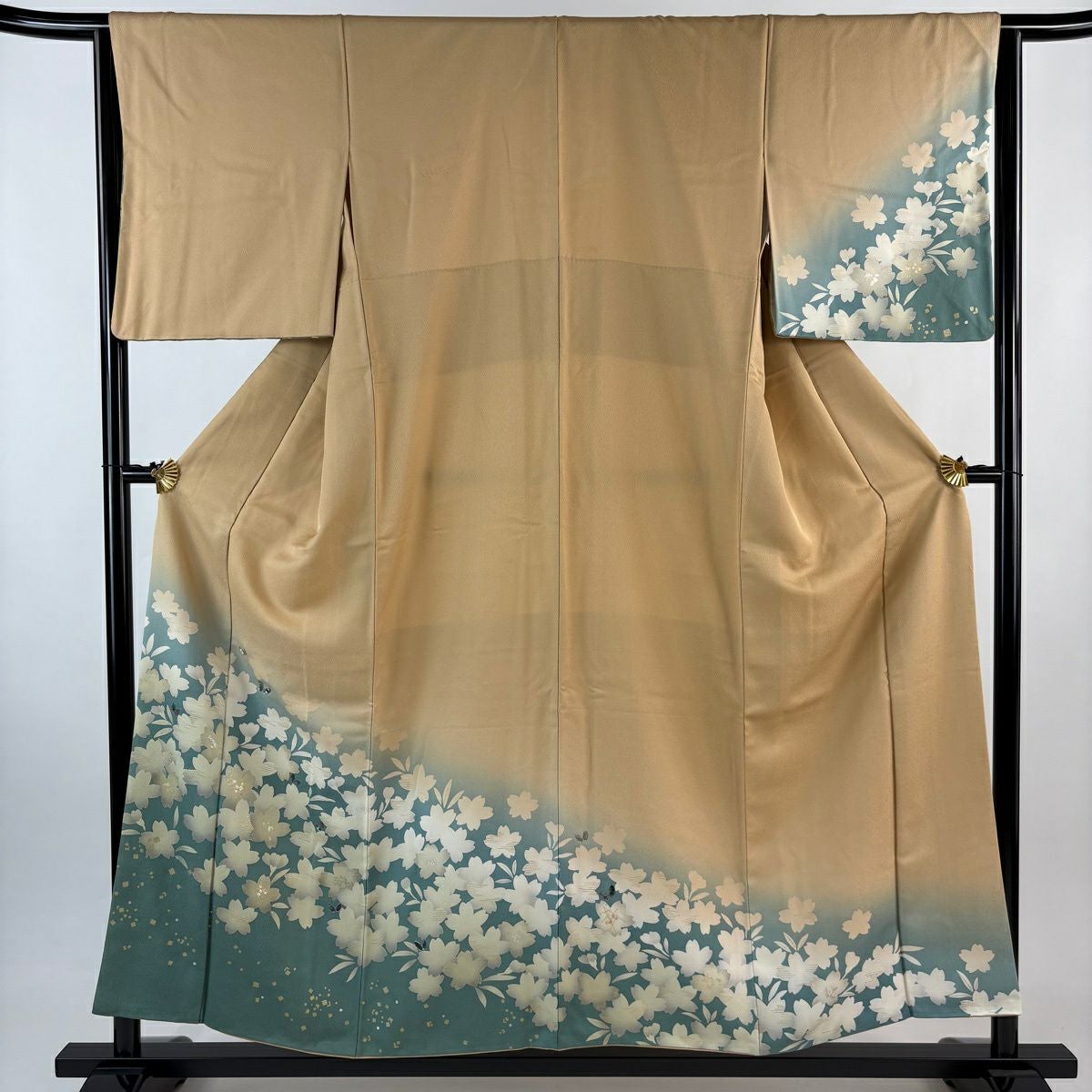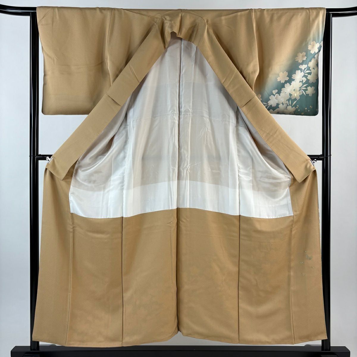 70%OFF 付下げ 身丈153.5cm 裄丈64.5cm M 袷 桜 蝶 螺鈿 金銀彩 薄茶色 正絹 秀品 K70