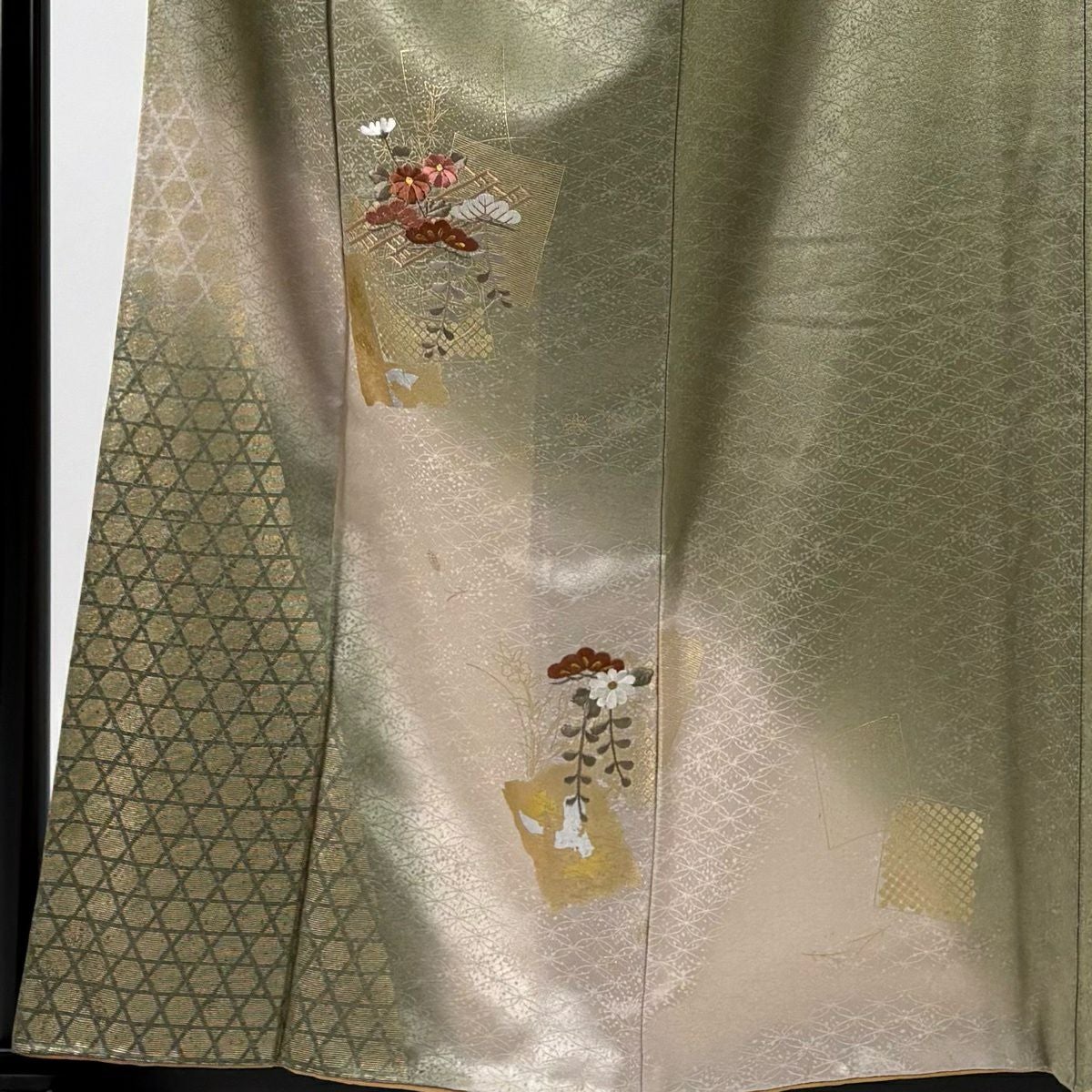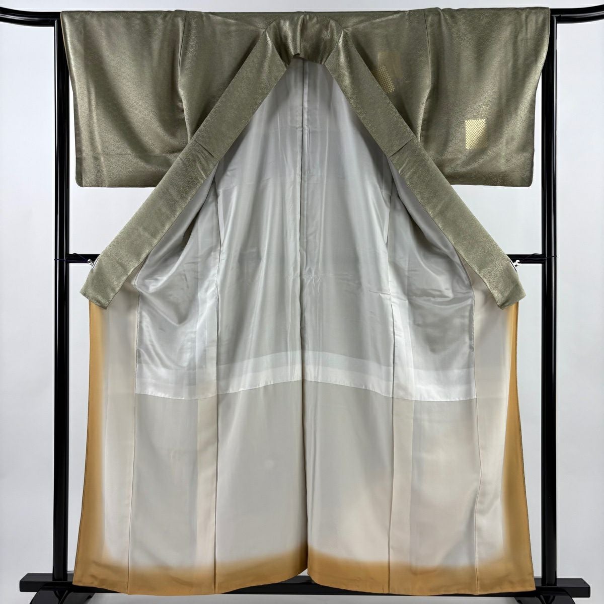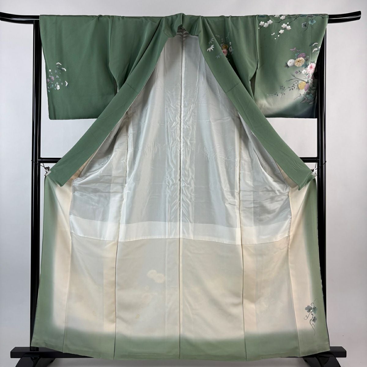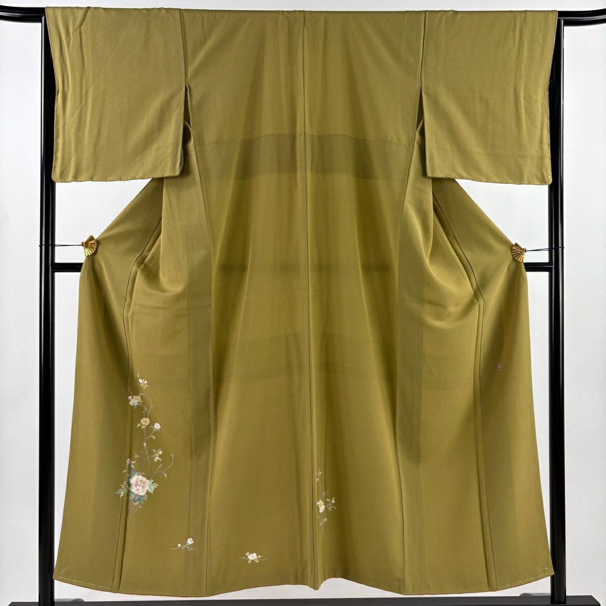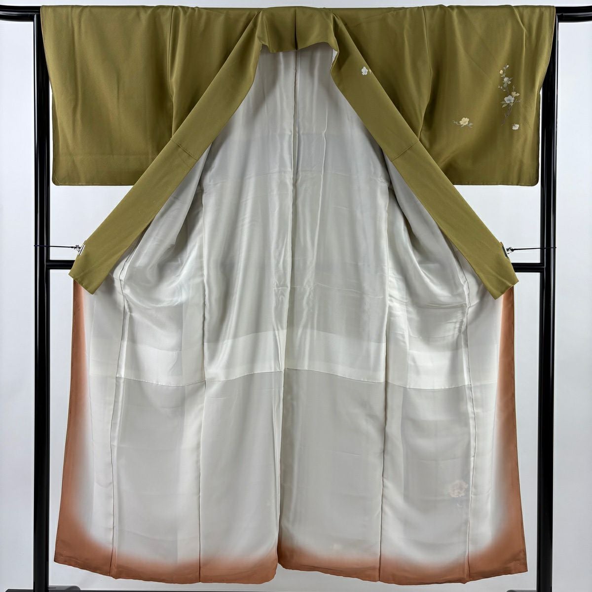 70%OFF 付下げ 身丈164.5cm 裄丈64cm M 袷 鼓 草花 金彩 ぼかし 鶯色 正絹 秀品 K70