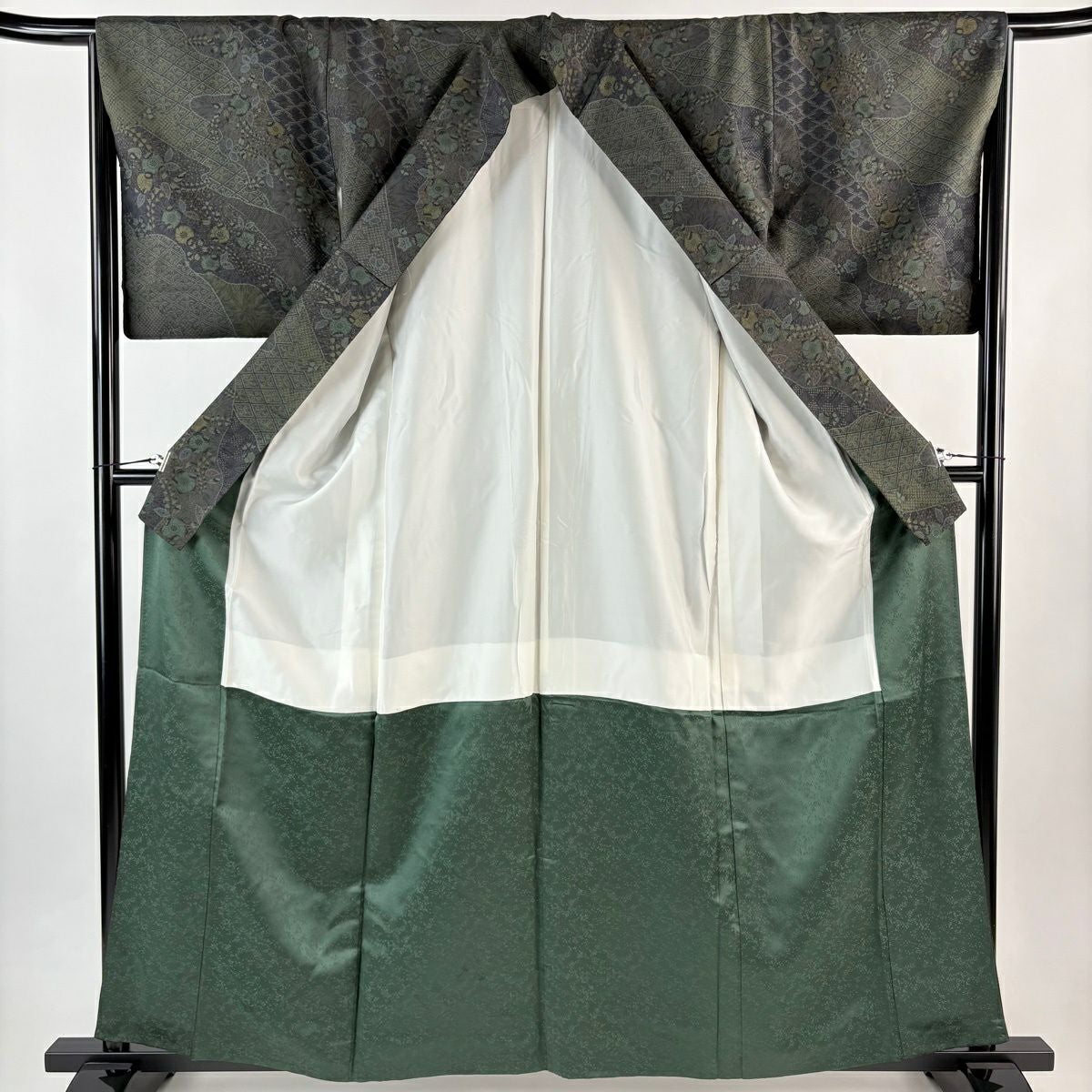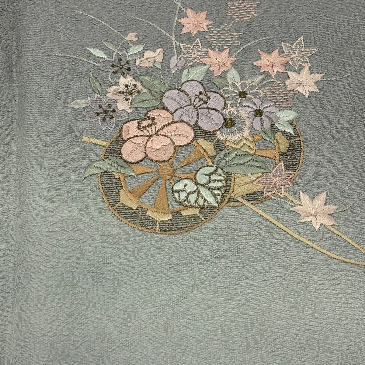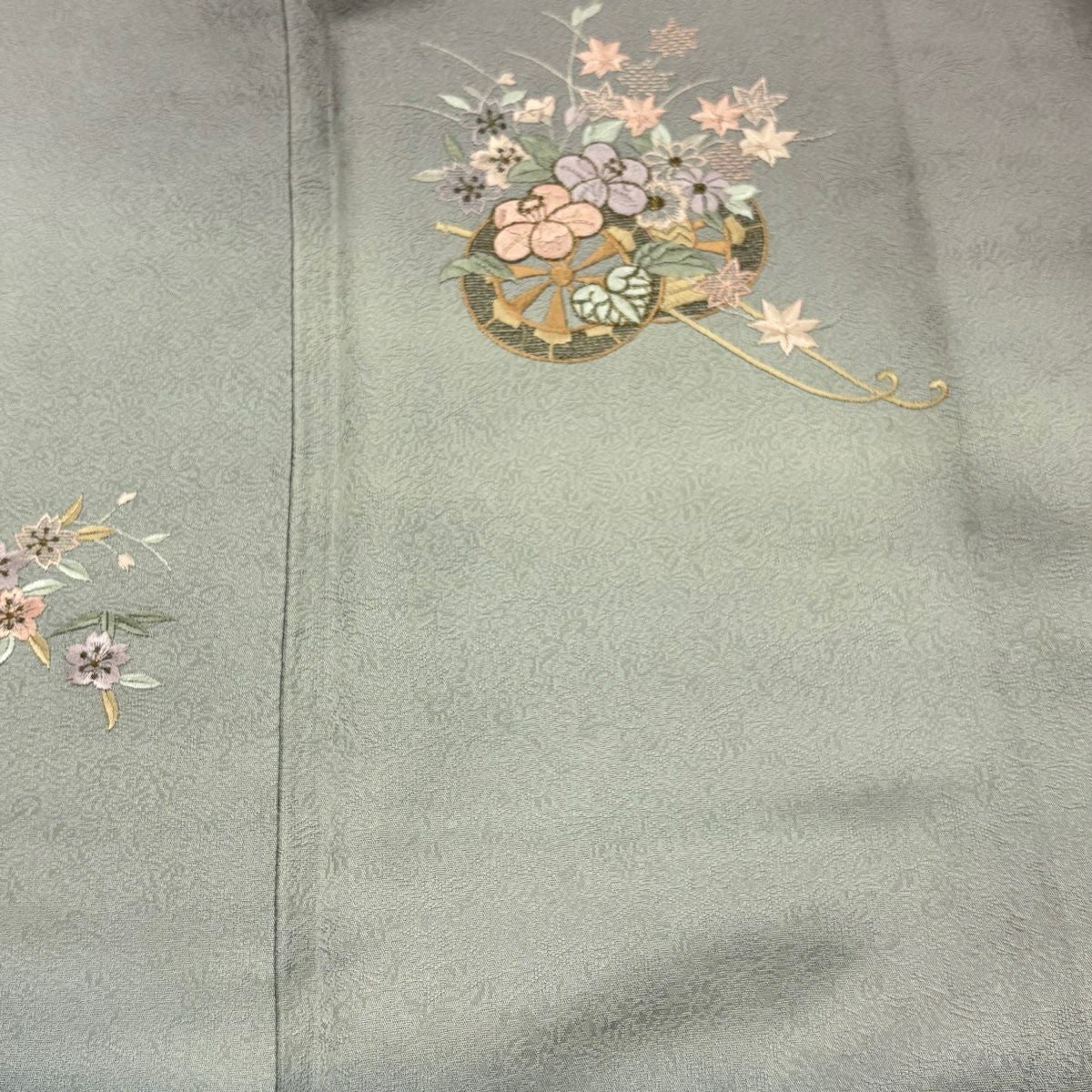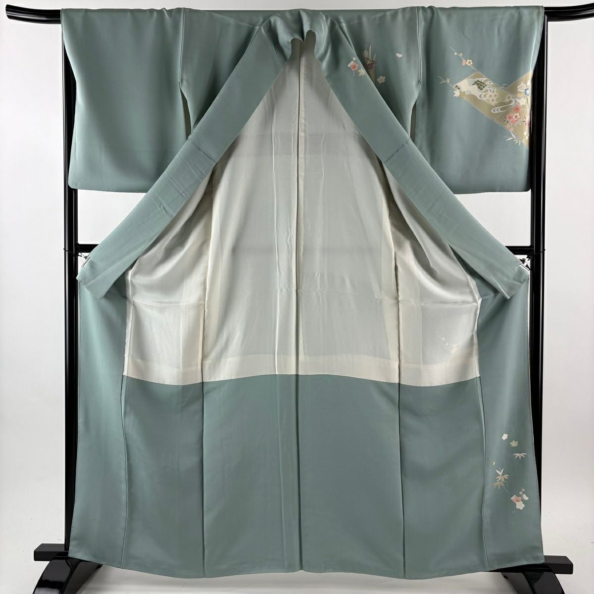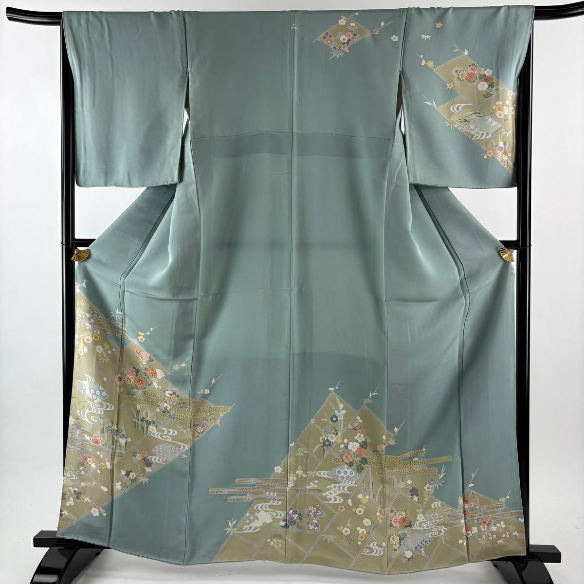 70%OFF 付下げ 身丈159cm 裄丈65cm M 袷 花籠 破れ色紙 刺繍 金彩 灰緑 正絹 秀品 K70