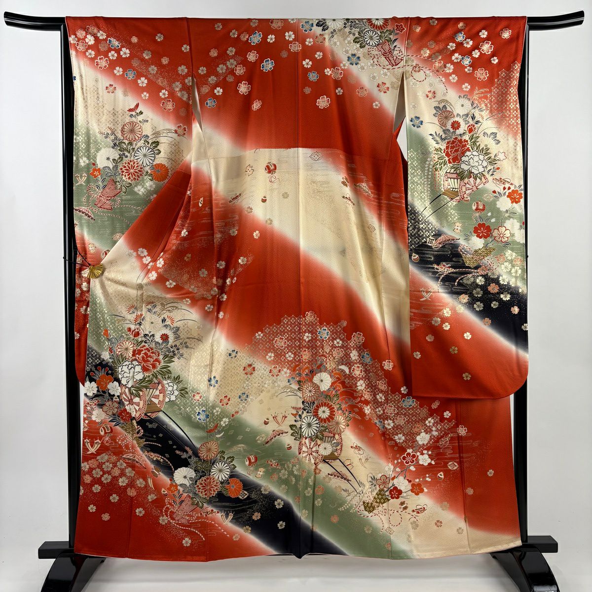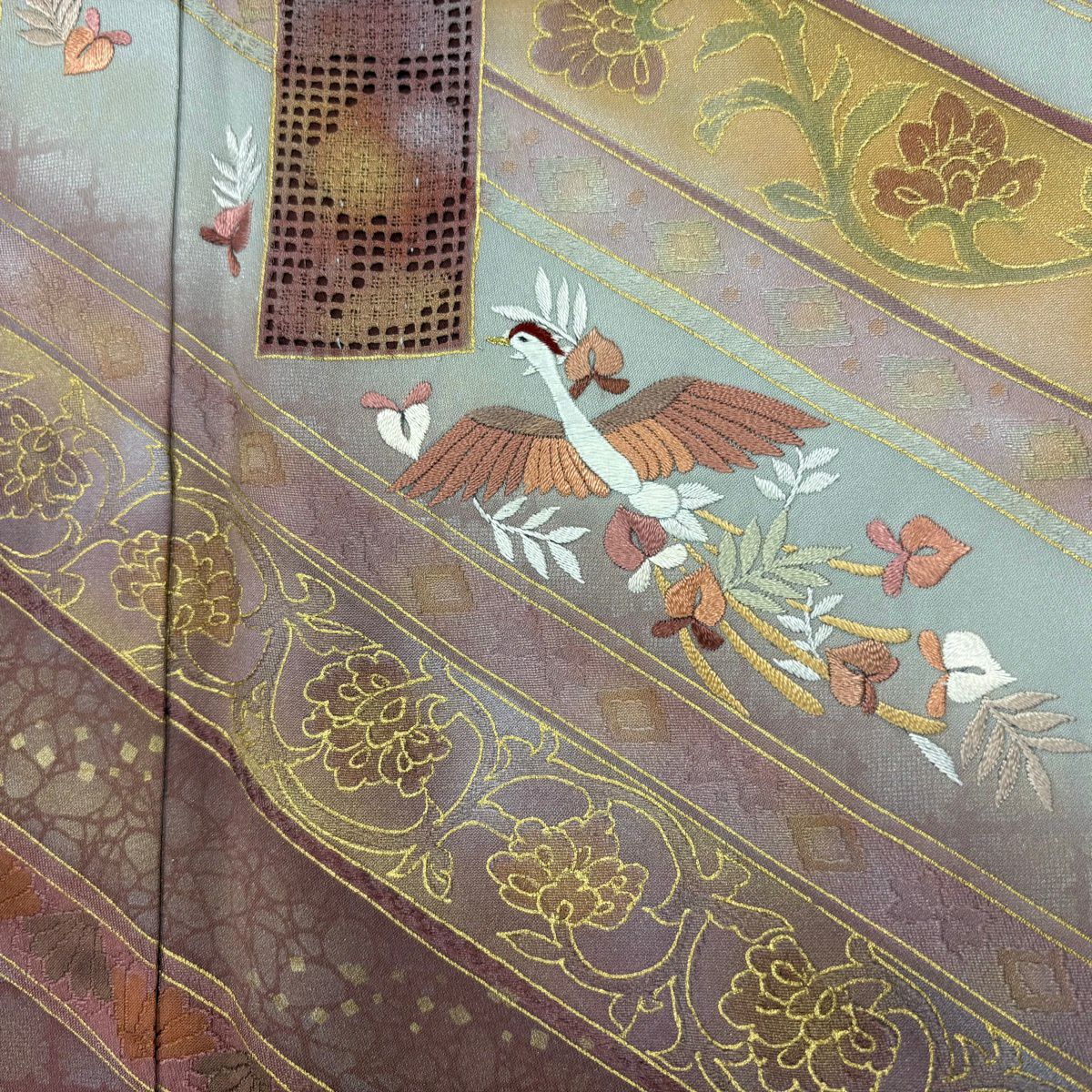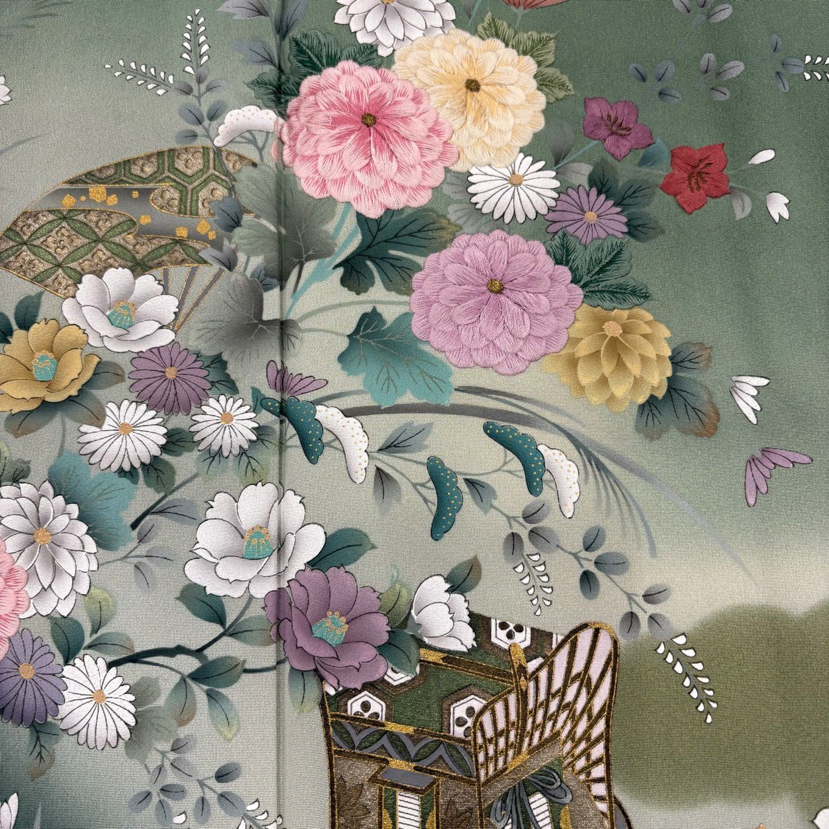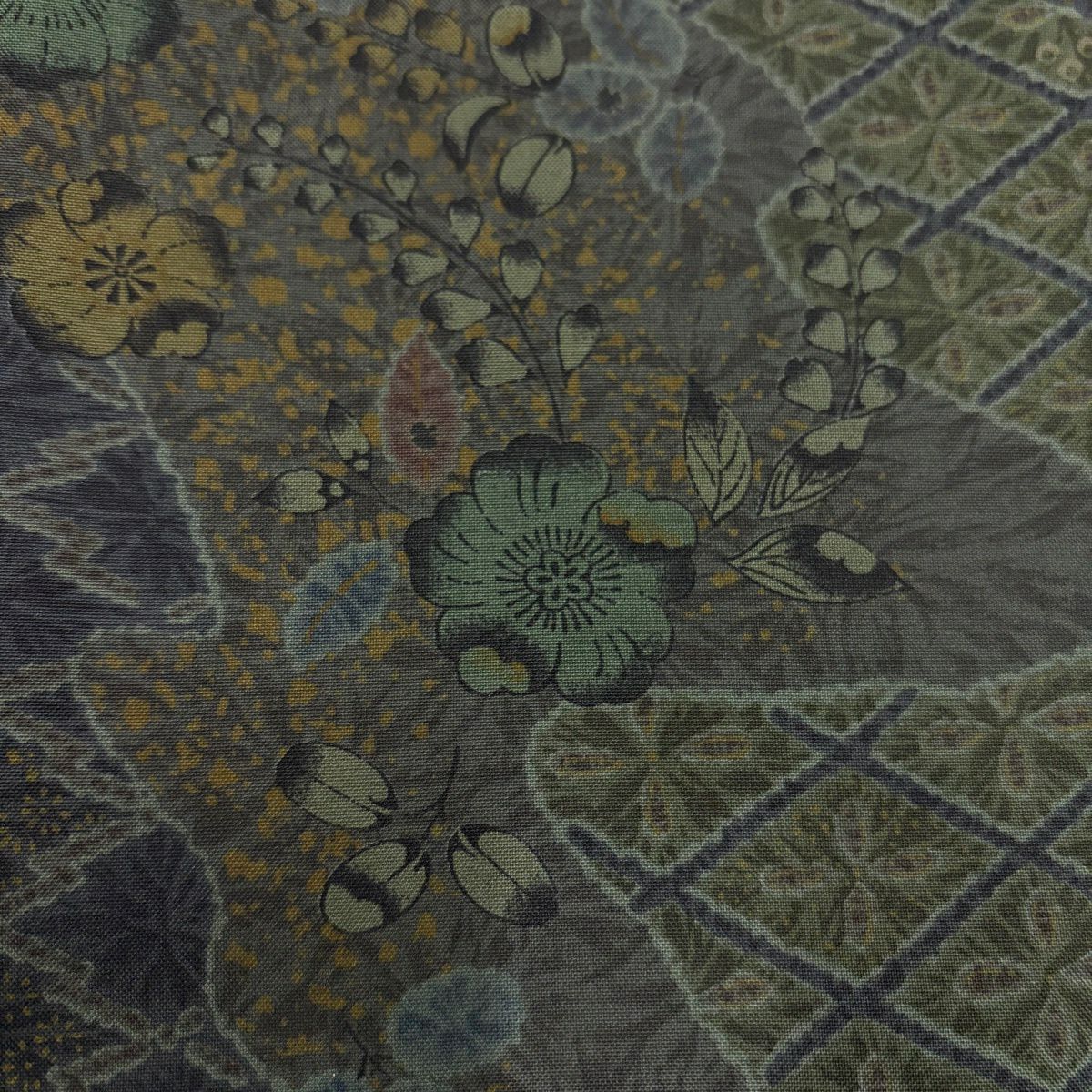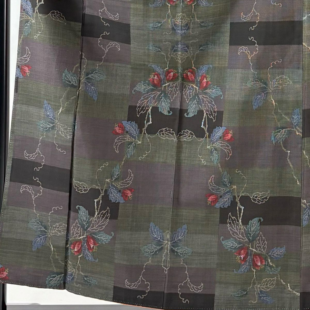 70%OFF 付下げ 身丈159cm 裄丈65cm M 袷 花籠 破れ色紙 刺繍 金彩 灰緑 正絹 秀品 K70