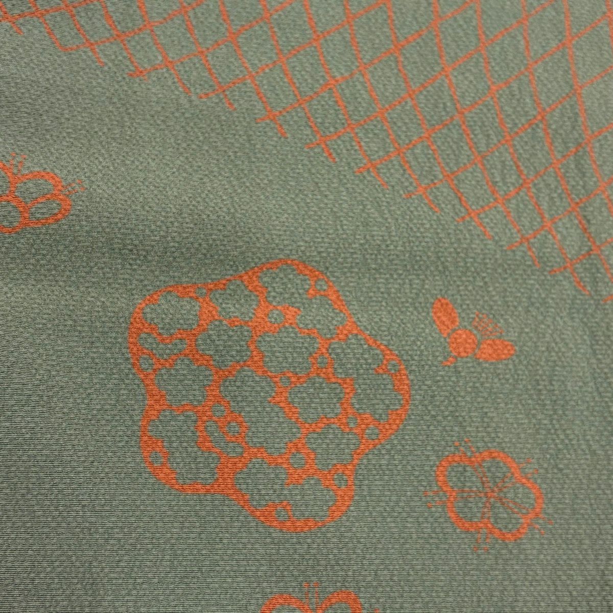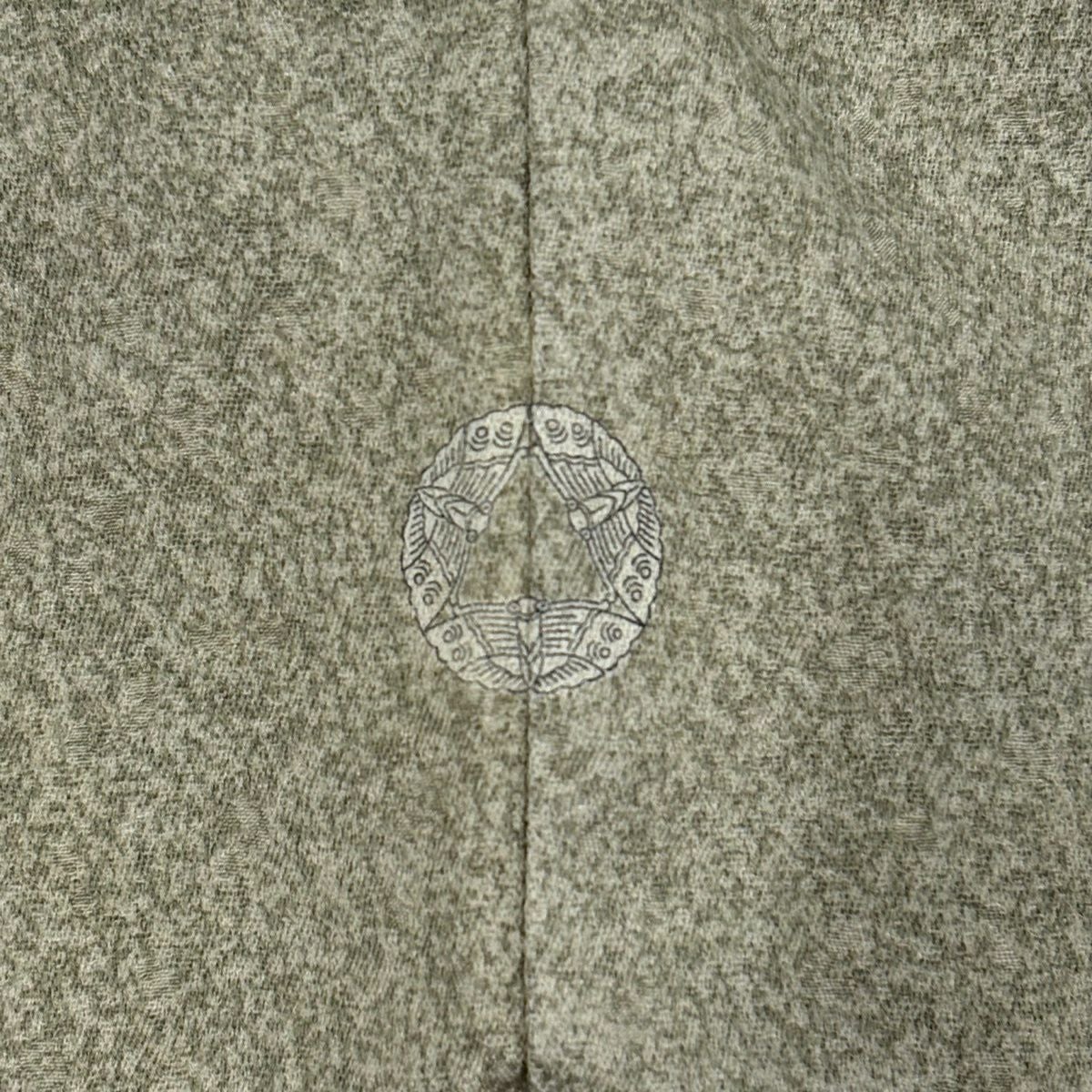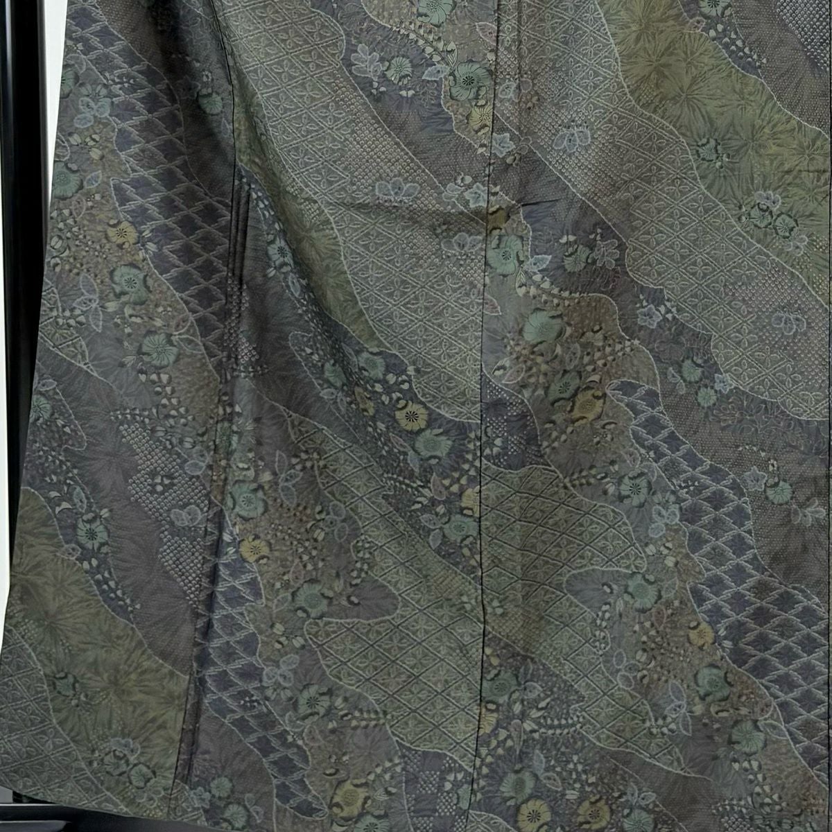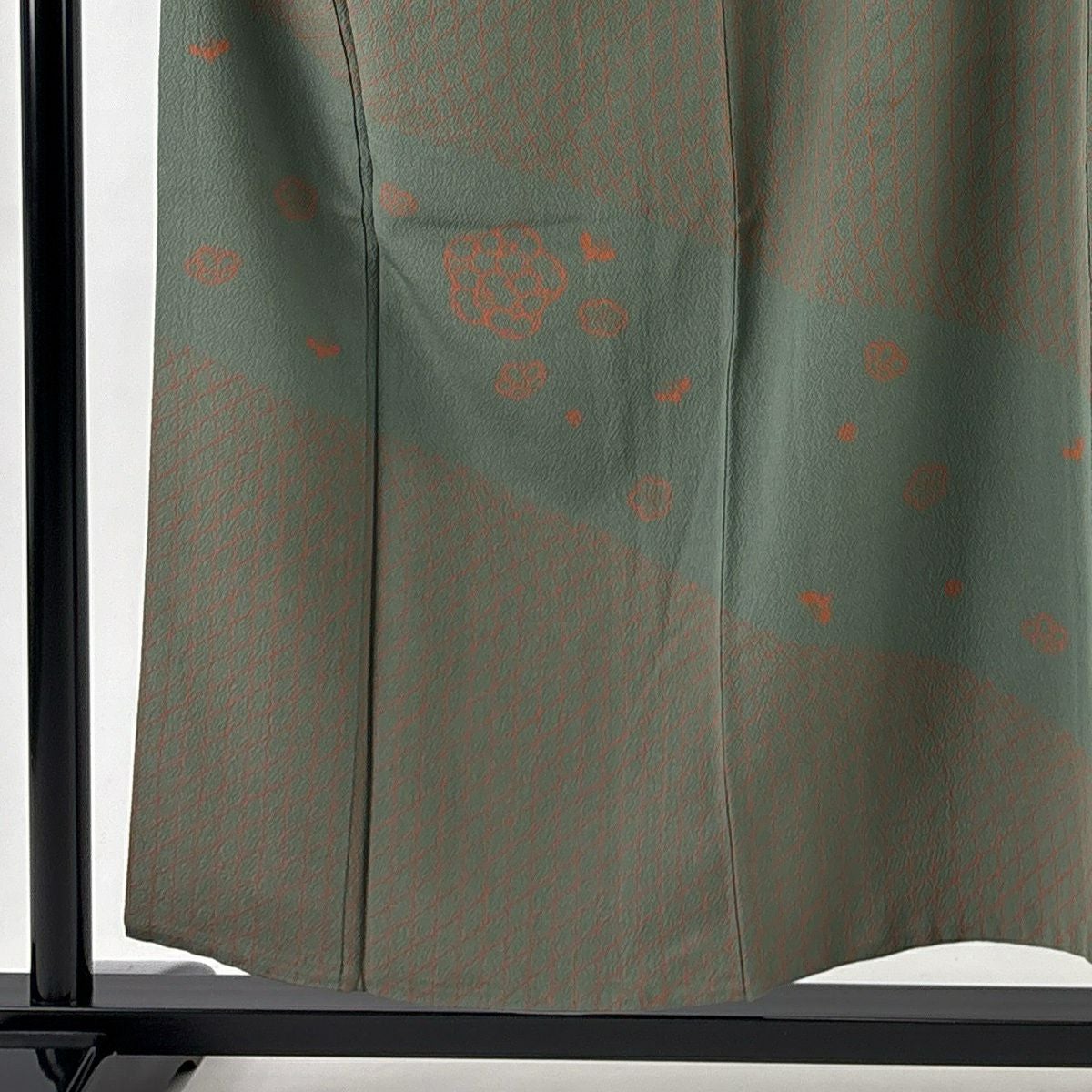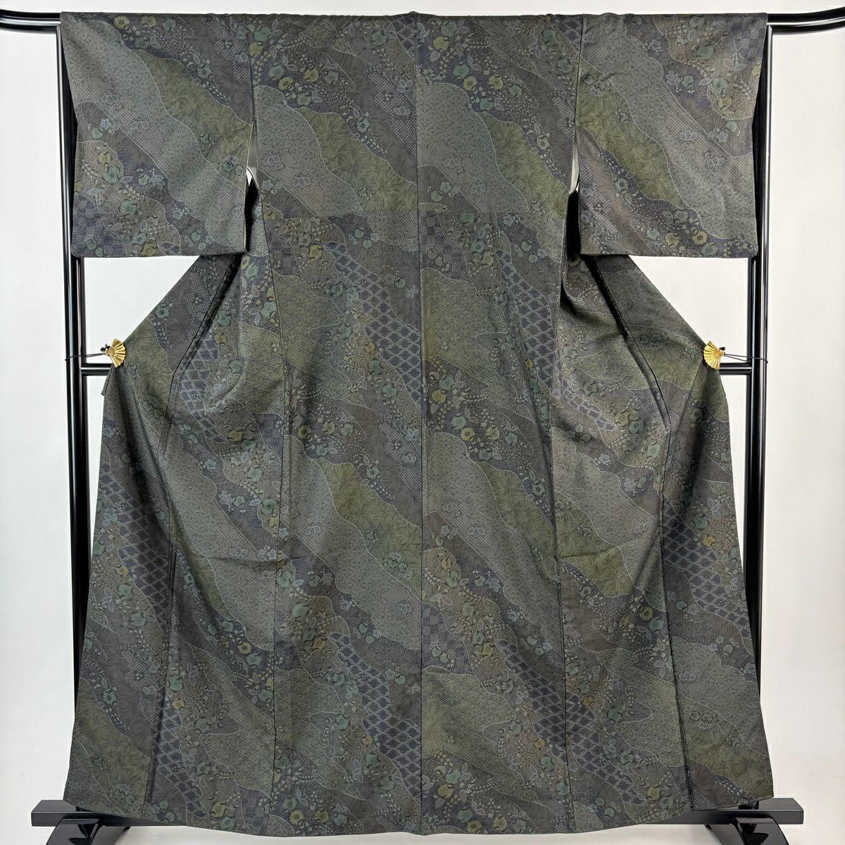 70%OFF 【美品】 小紋 身丈151cm 裄丈65.5cm M 袷 紬地 霞 草花 灰緑 正絹 秀品 K70