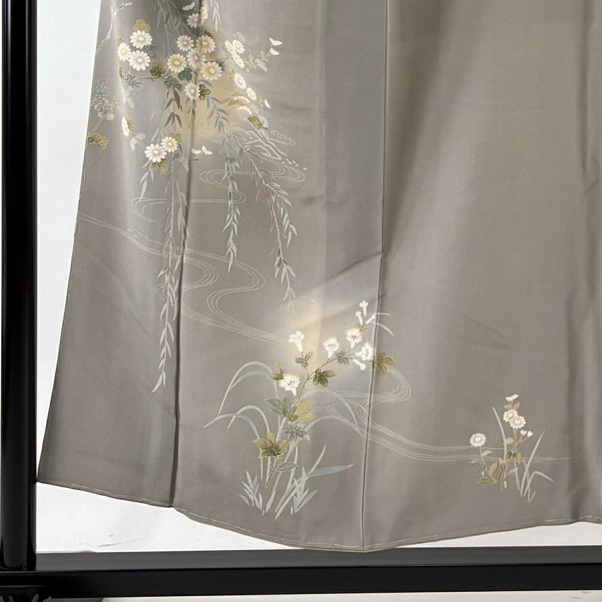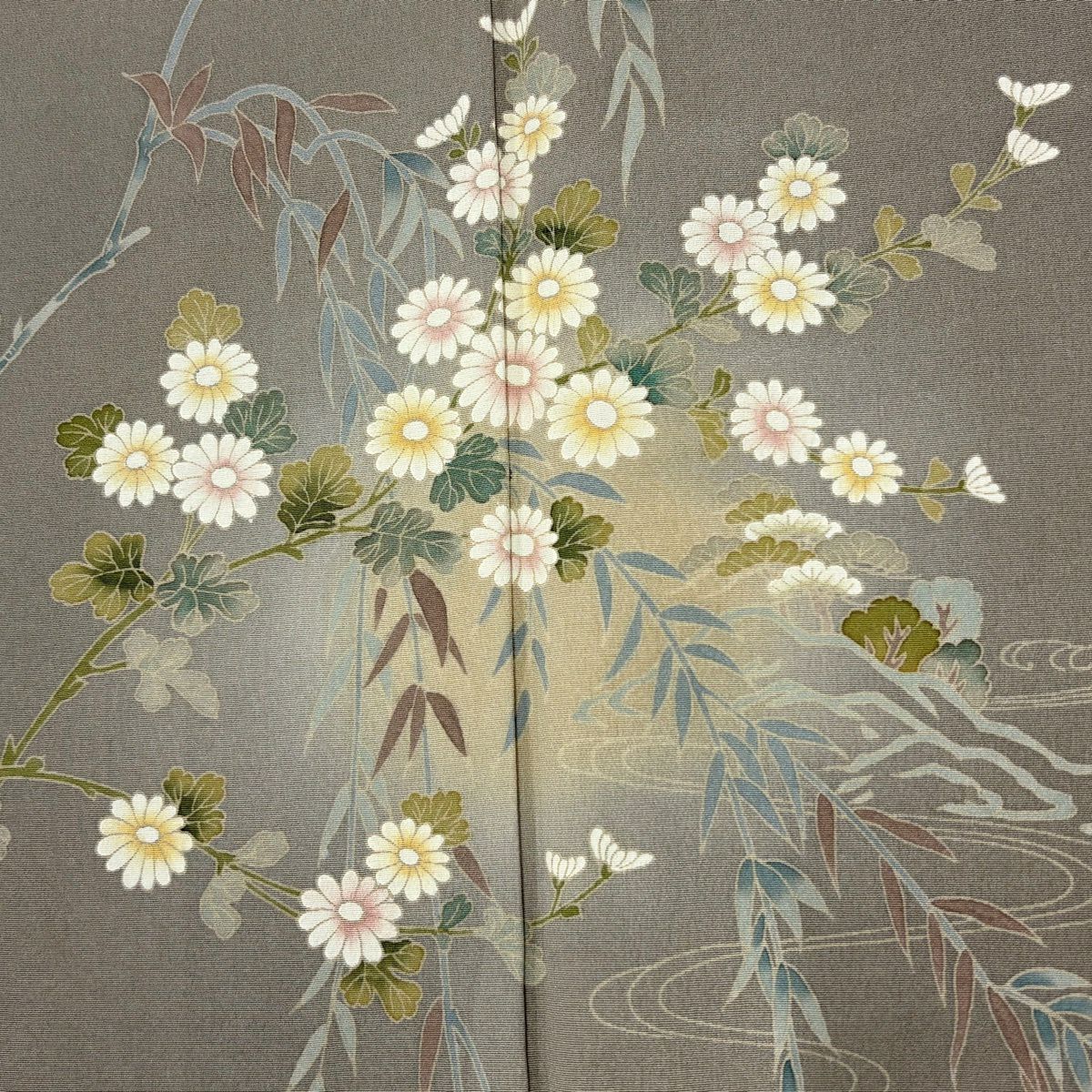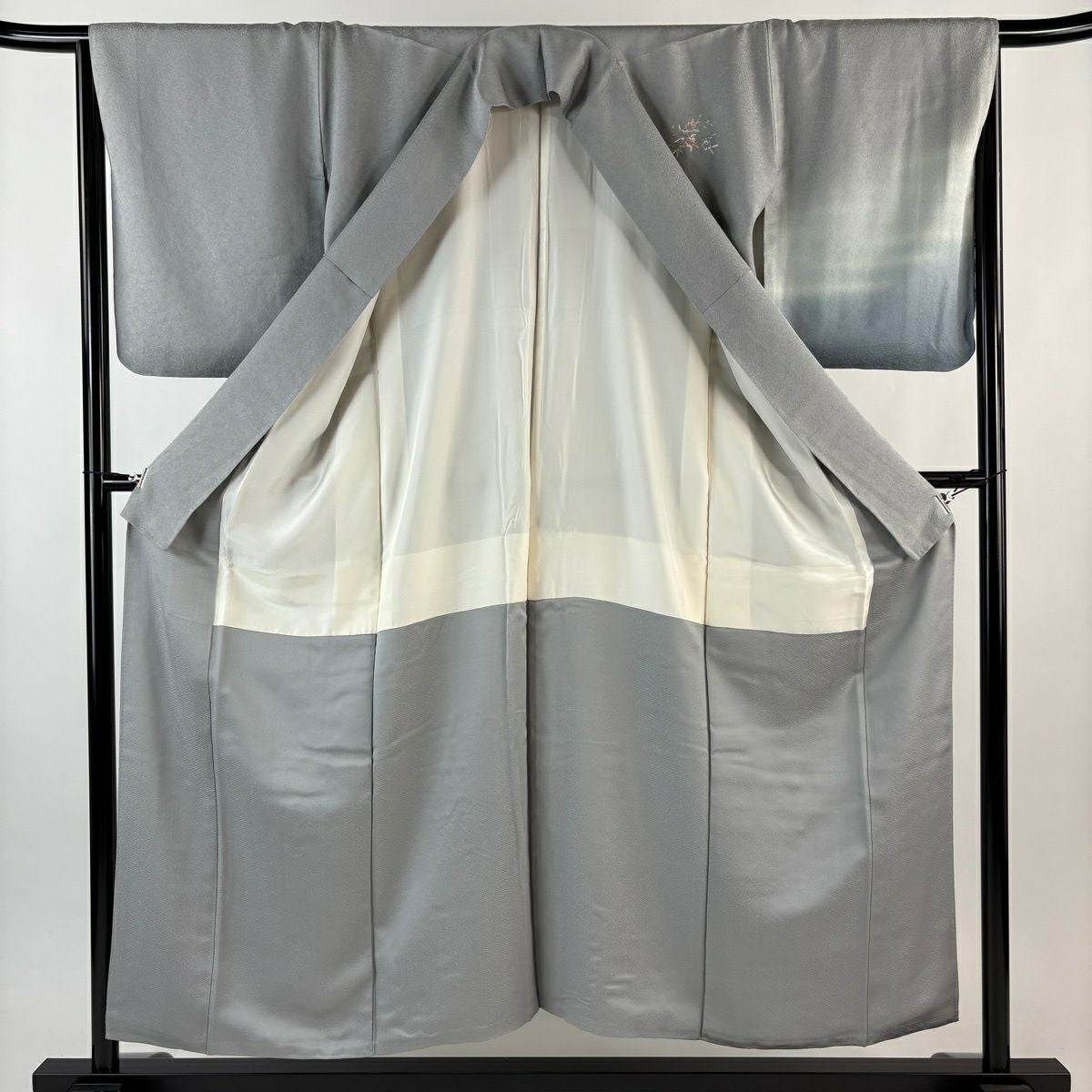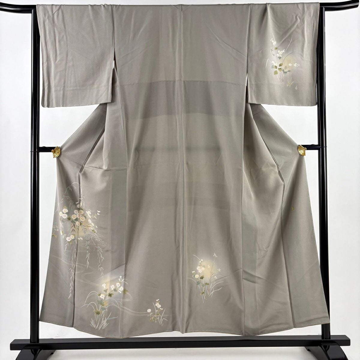 70%OFF 付下げ 身丈154cm 裄丈66cm M 袷 落款あり 菊 流水 ぼかし 灰色 正絹 秀品 K70