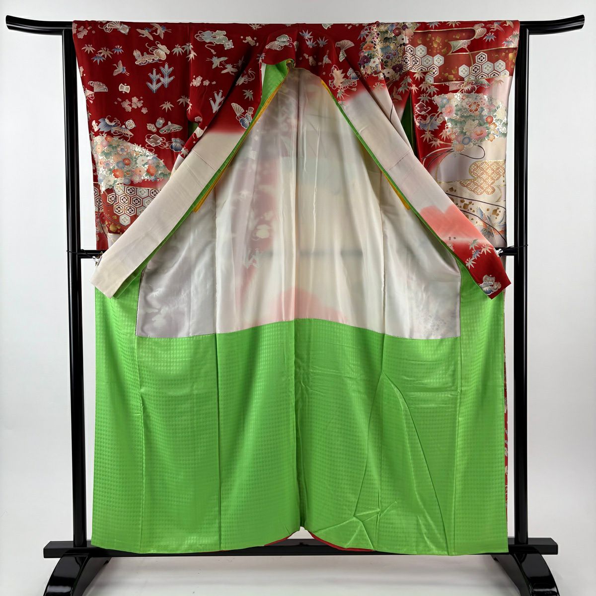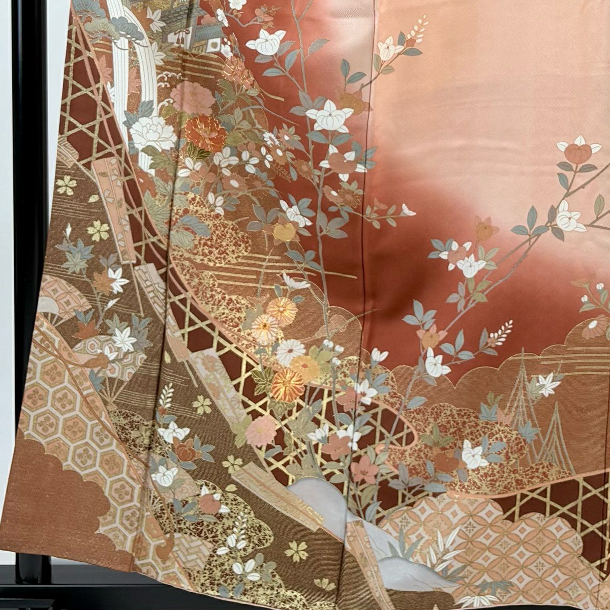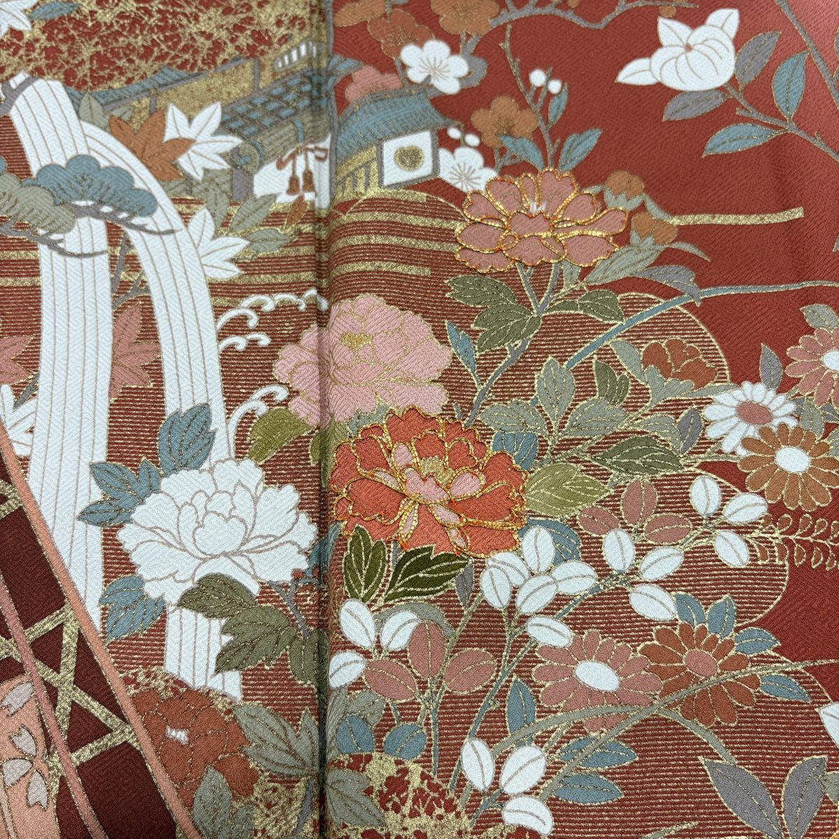 70%OFF 訪問着 身丈158.5cm 裄丈64.5cm M 袷 松竹梅 建物 金糸 金彩 赤茶 正絹 秀品 K70