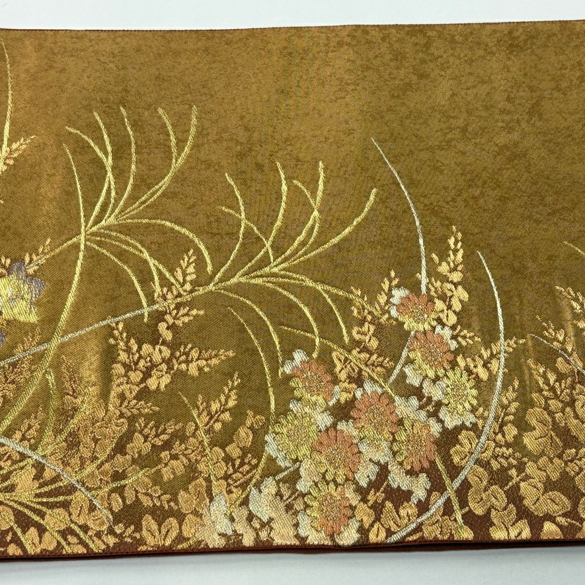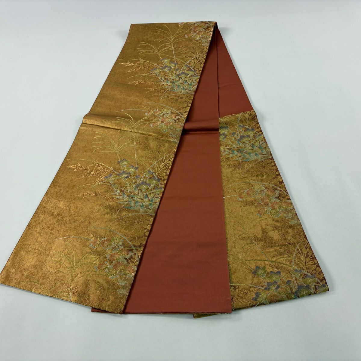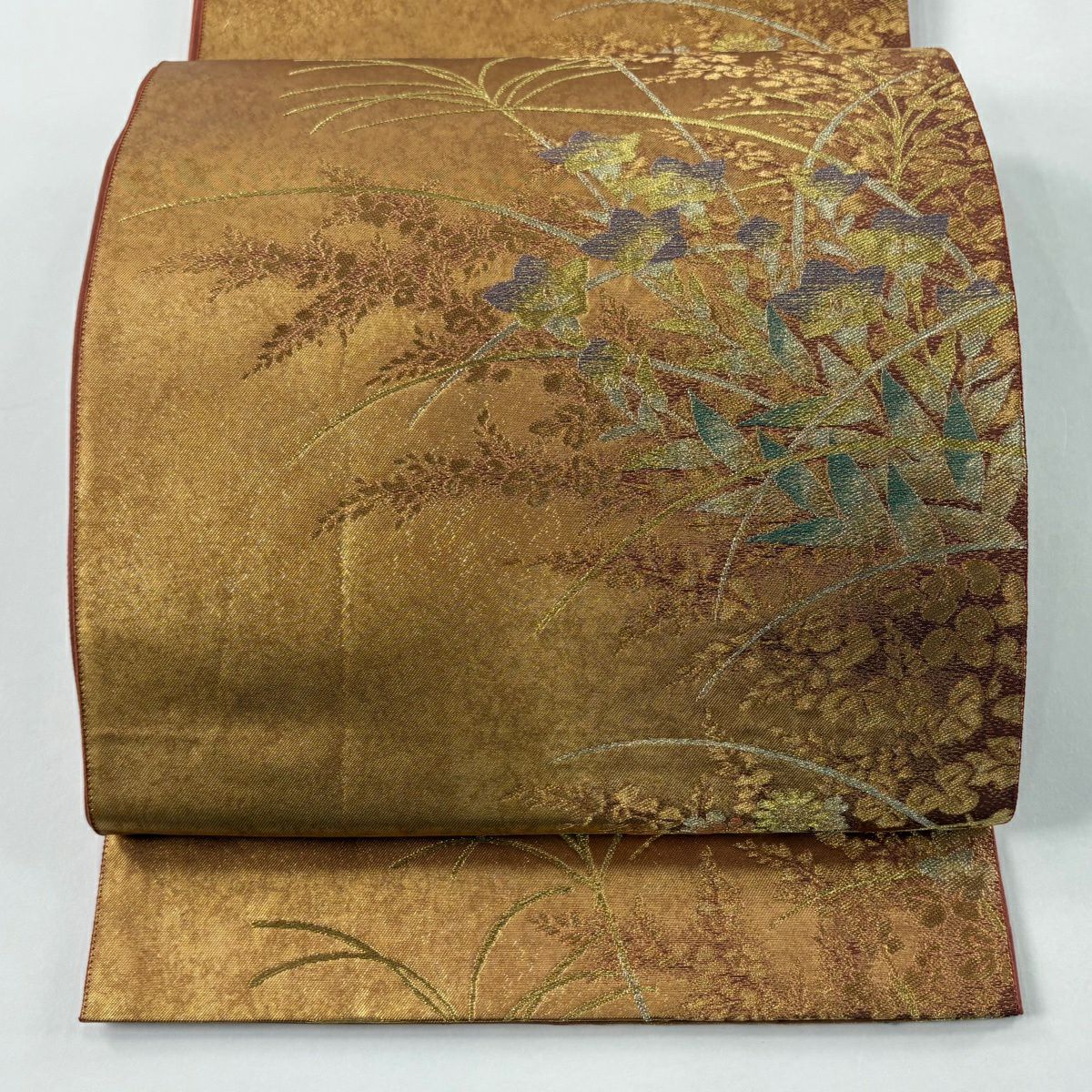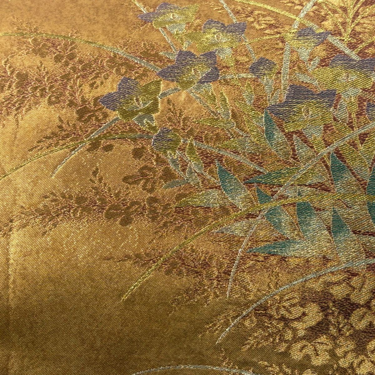 【最終値引き】 77%OFF 【美品】 袋帯 秀品 関西仕立て 草花 斜め格子 箔 金糸 金色 六通 正絹 K70