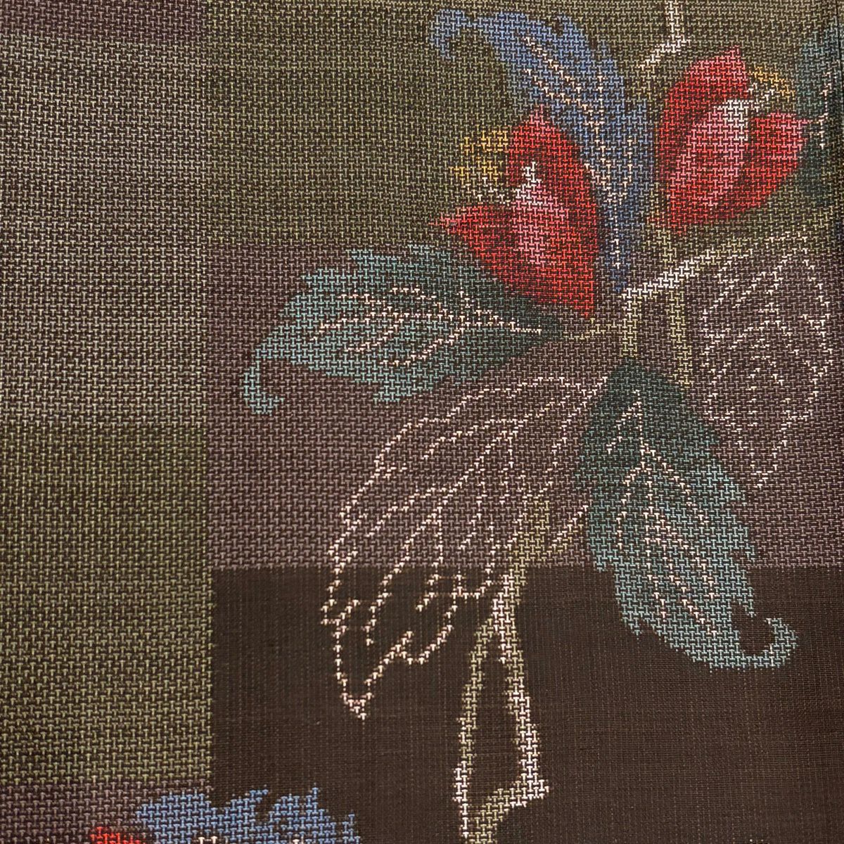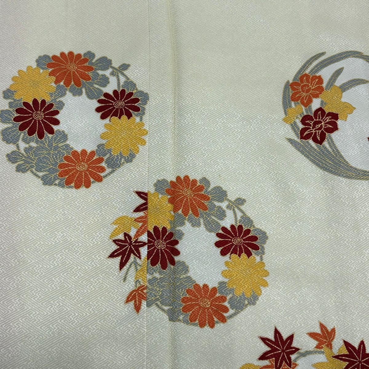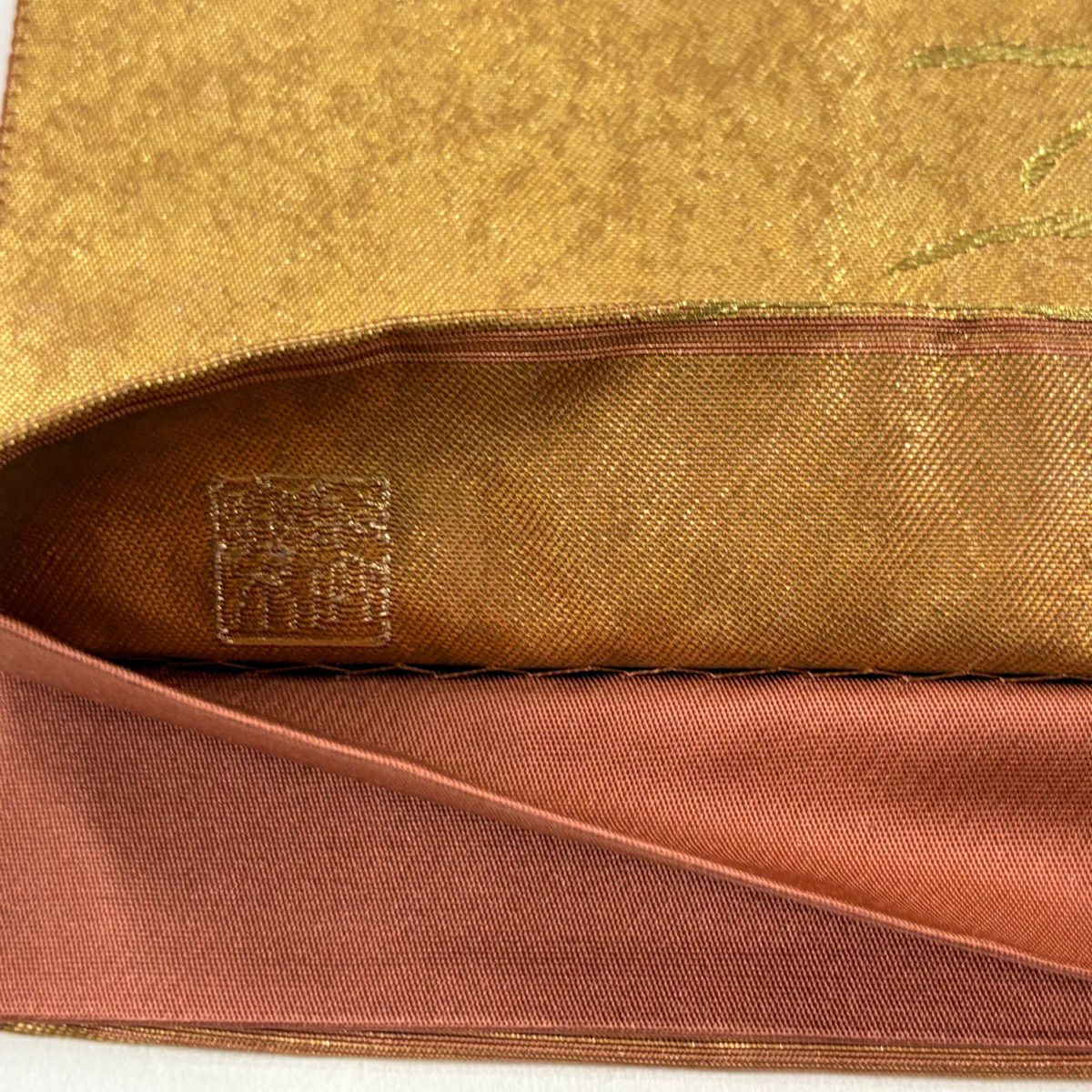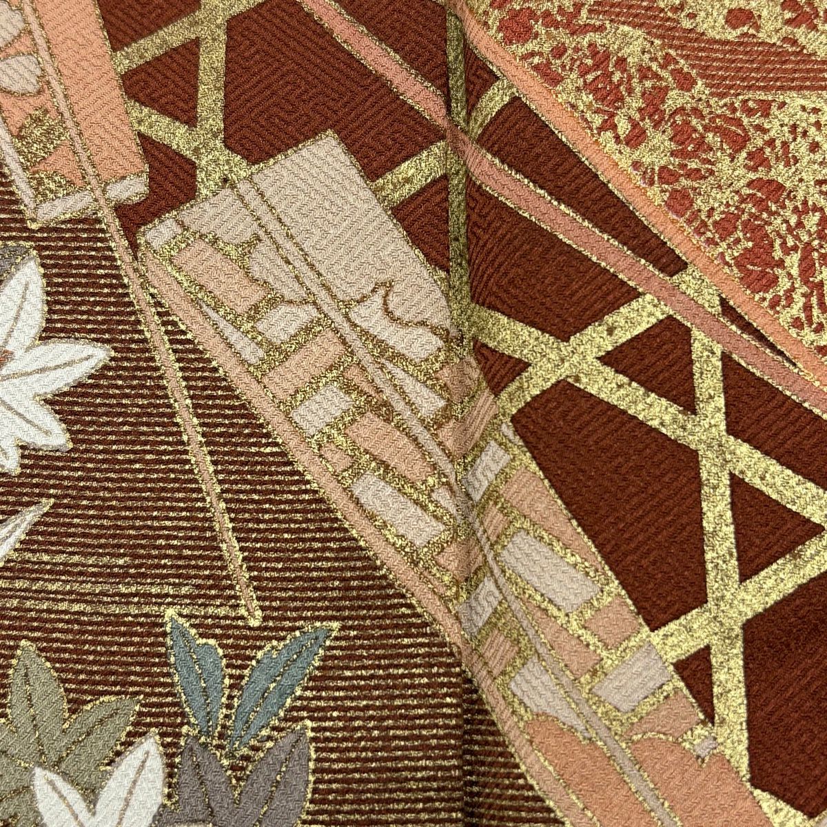 【最終値引き】 77%OFF 【美品】 袋帯 秀品 関西仕立て 草花 斜め格子 箔 金糸 金色 六通 正絹 K70