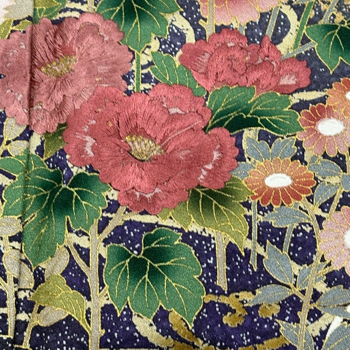 【最終値引き】 77%OFF 【美品】 袋帯 秀品 証紙あり 色紙 花鳥 金糸 箔 赤紫 お太鼓柄 正絹 K70