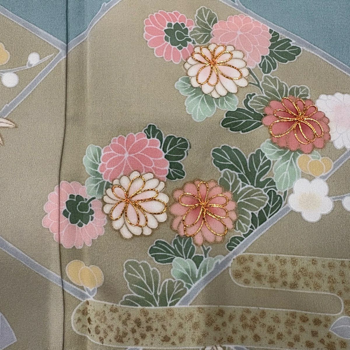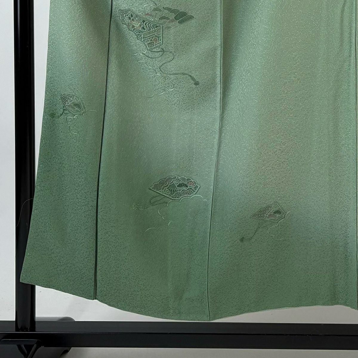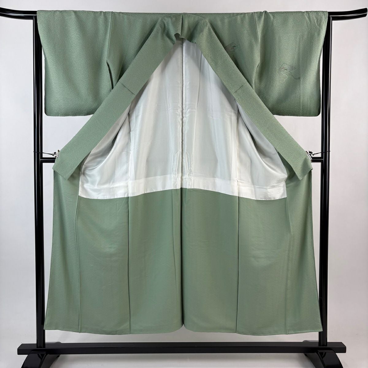 70%OFF 訪問着 身丈161.5cm 裄丈66.5cm M 袷 菊 御所車 刺繍 金糸 薄緑 正絹 秀品 K70