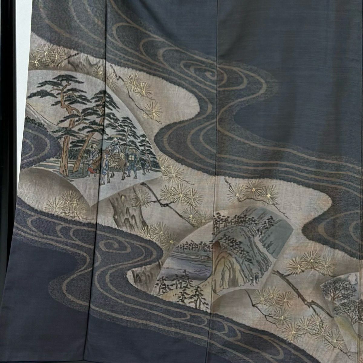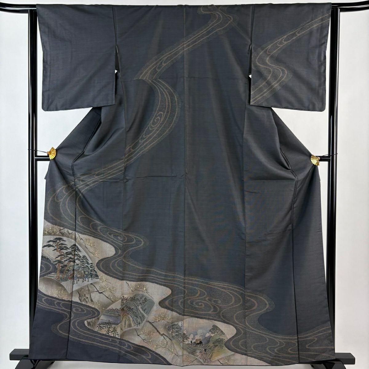 70%OFF 付下げ 身丈151cm 裄丈64cm M 袷 樹木 山並み 金彩 ぼかし 灰緑 正絹 秀品 K70