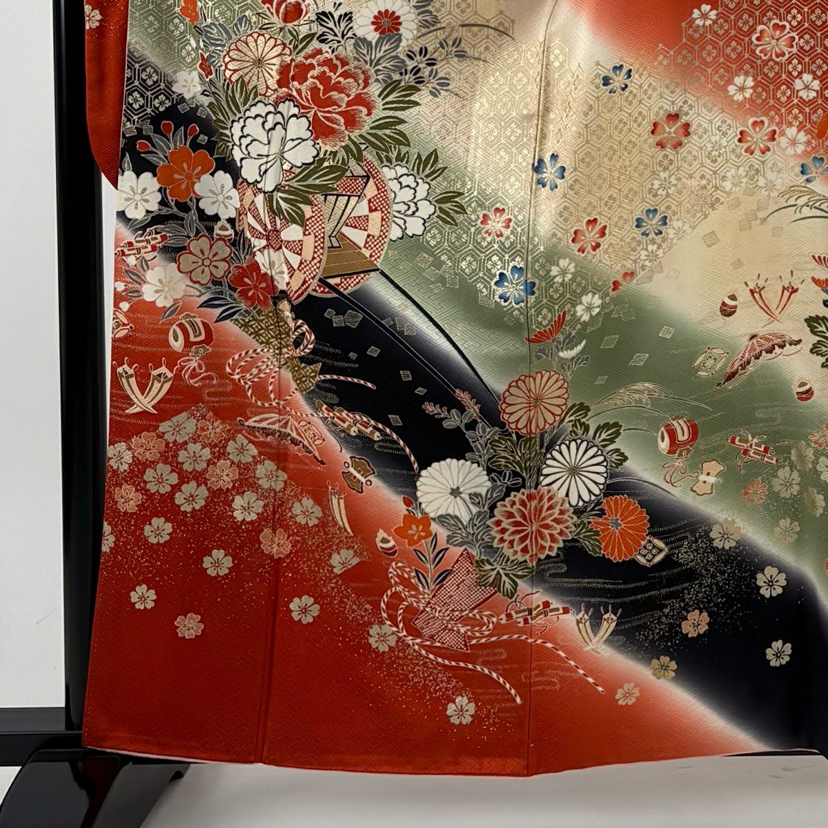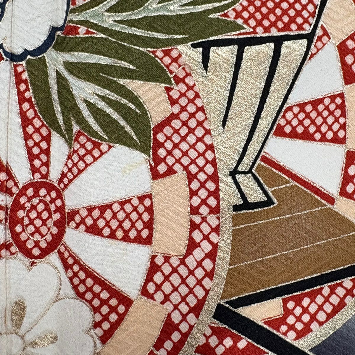 【最終値引き】 77%OFF 【美品】 袋帯 秀品 振袖向き 手鞠 扇 金糸 箔 オレンジ 六通 正絹 K70