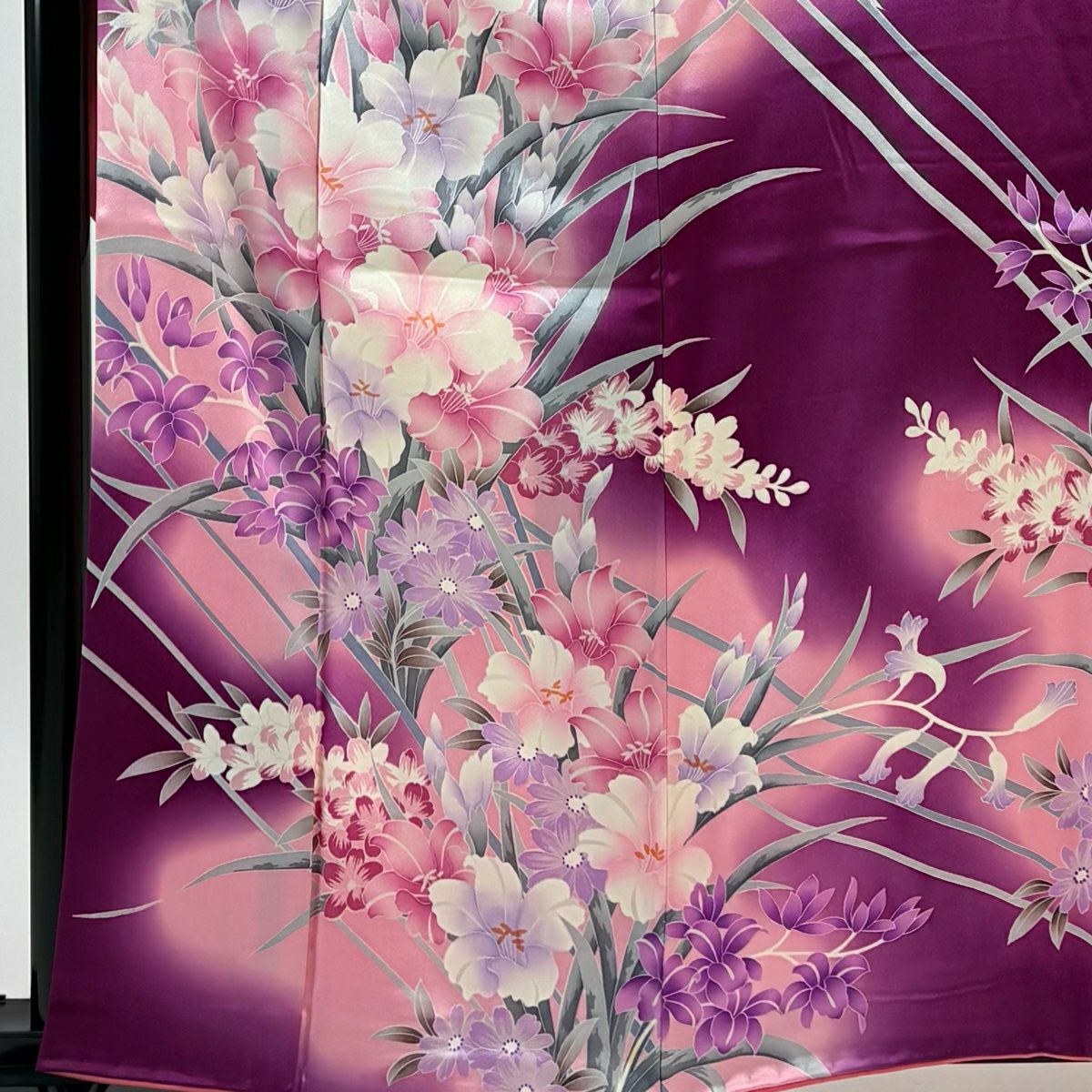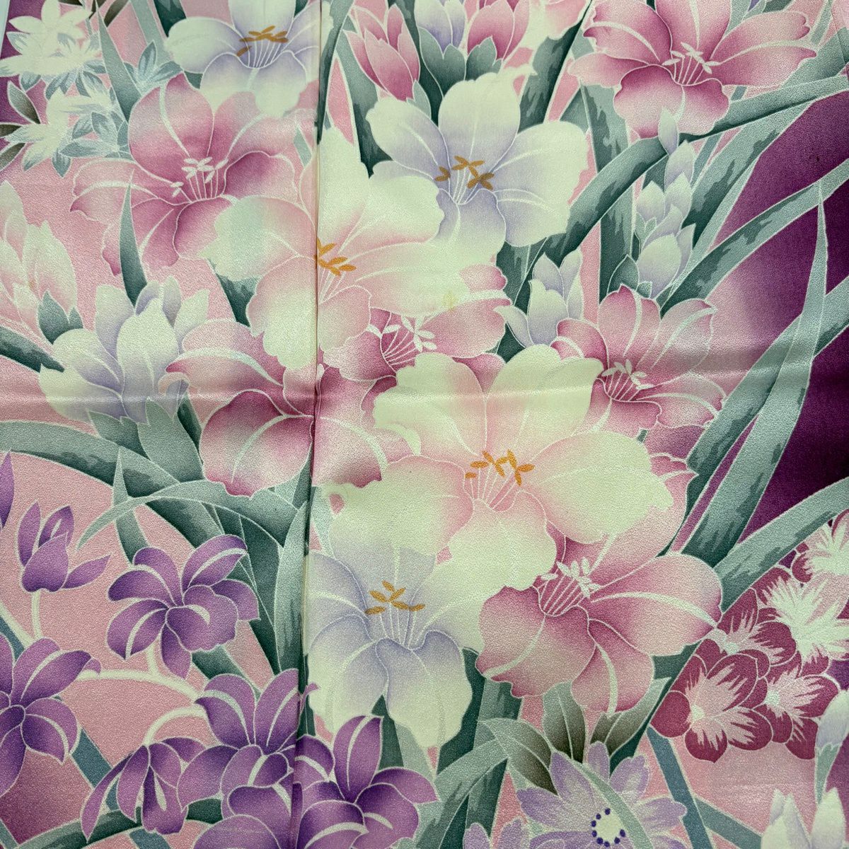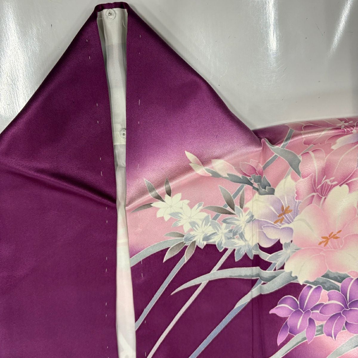 70%OFF 付下げ 身丈169.5cm 裄丈65.5cm M 袷 椿 葉柄 絞り ぼかし 灰紫 正絹 秀品 K70