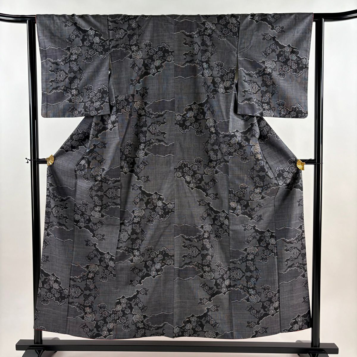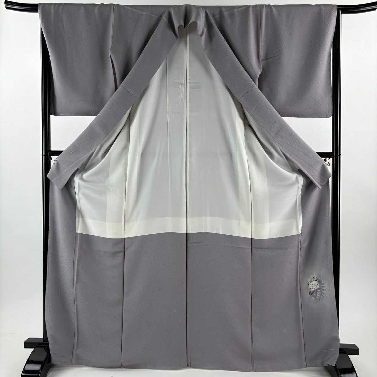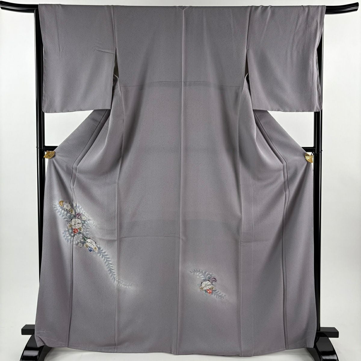 付下げ 身丈157cm 裄丈64.5cm M 袷 袋帯セット 草花 縦縞模様 絞り 刺繍 灰色 正絹 秀品 一つ紋