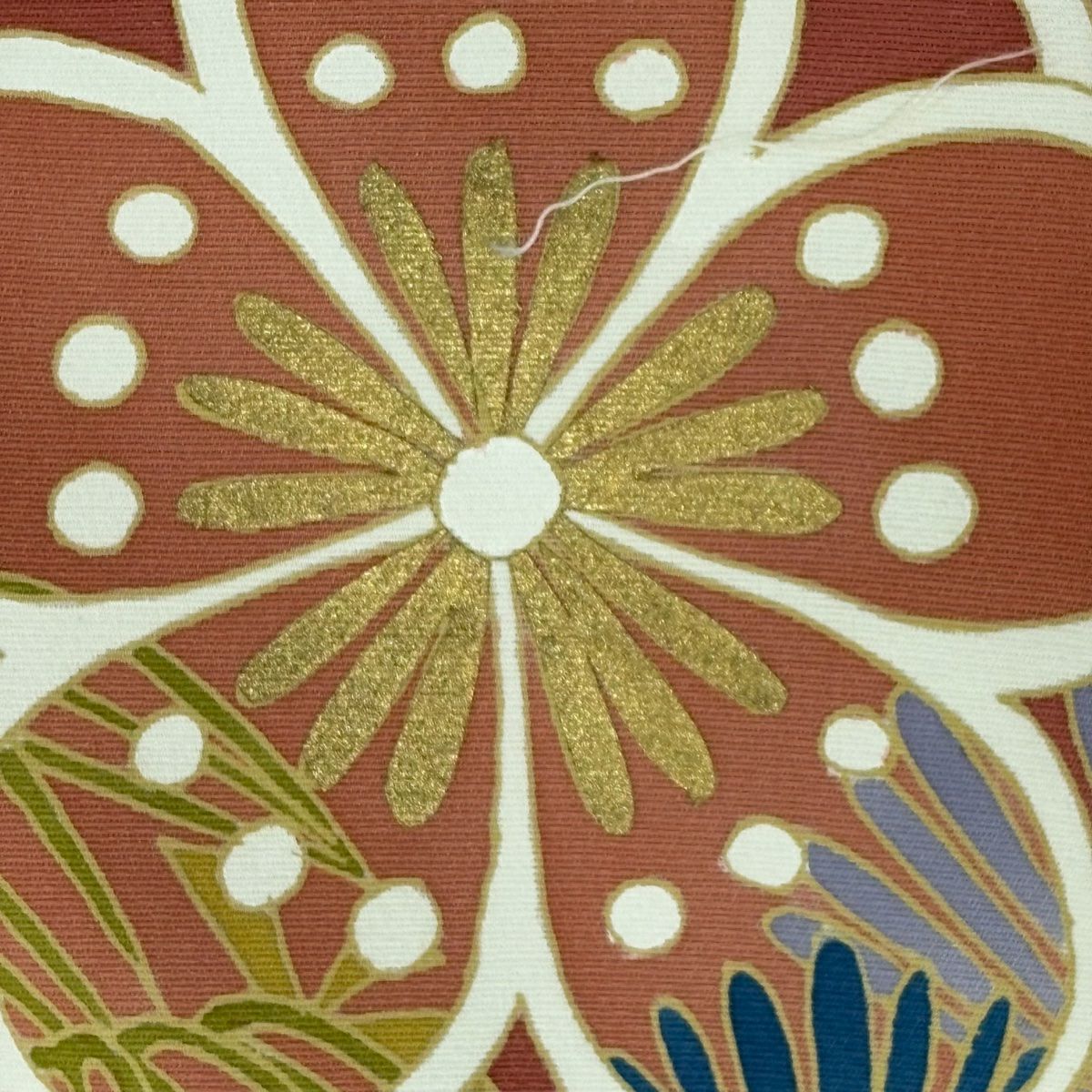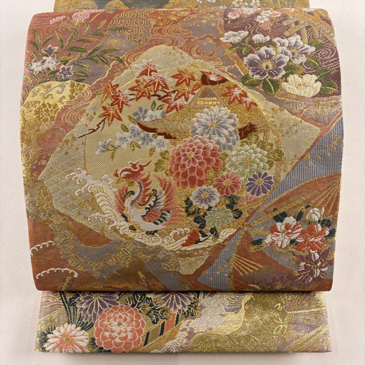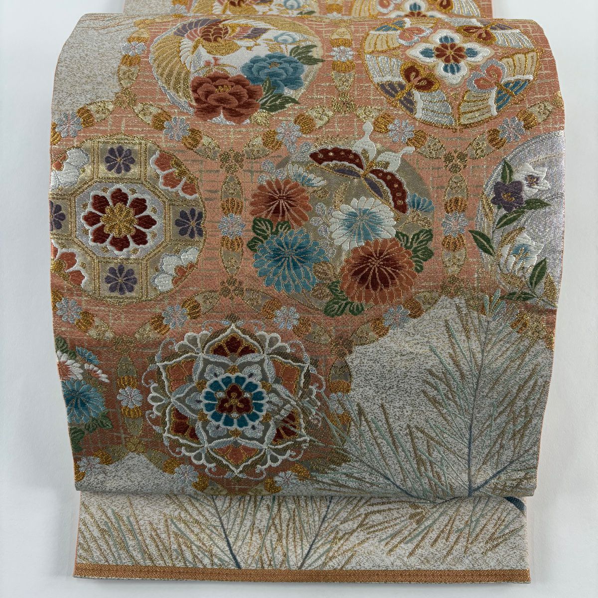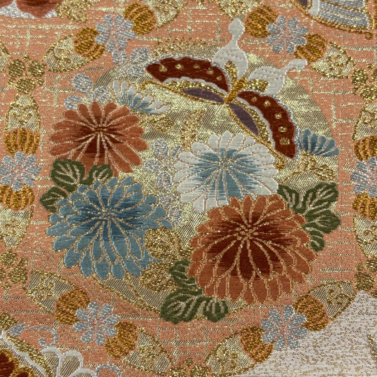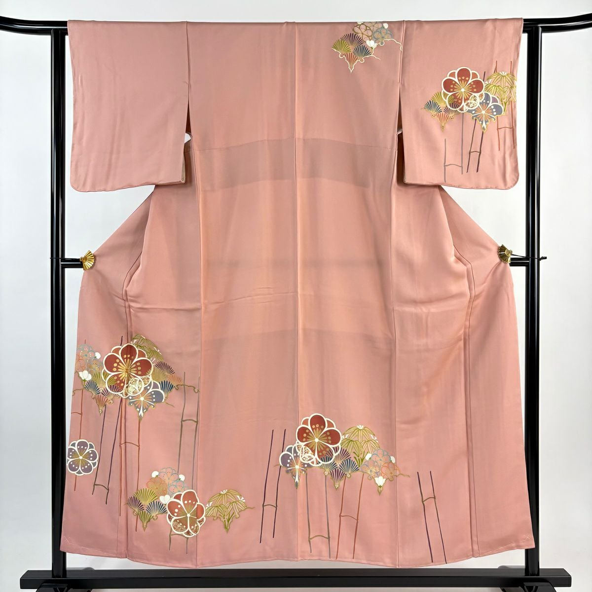 【在庫一掃】 訪問着 身丈161.5cm 裄丈66.5cm M 袷 扇 花筏 金糸 金彩 サーモンピンク 正絹 秀品