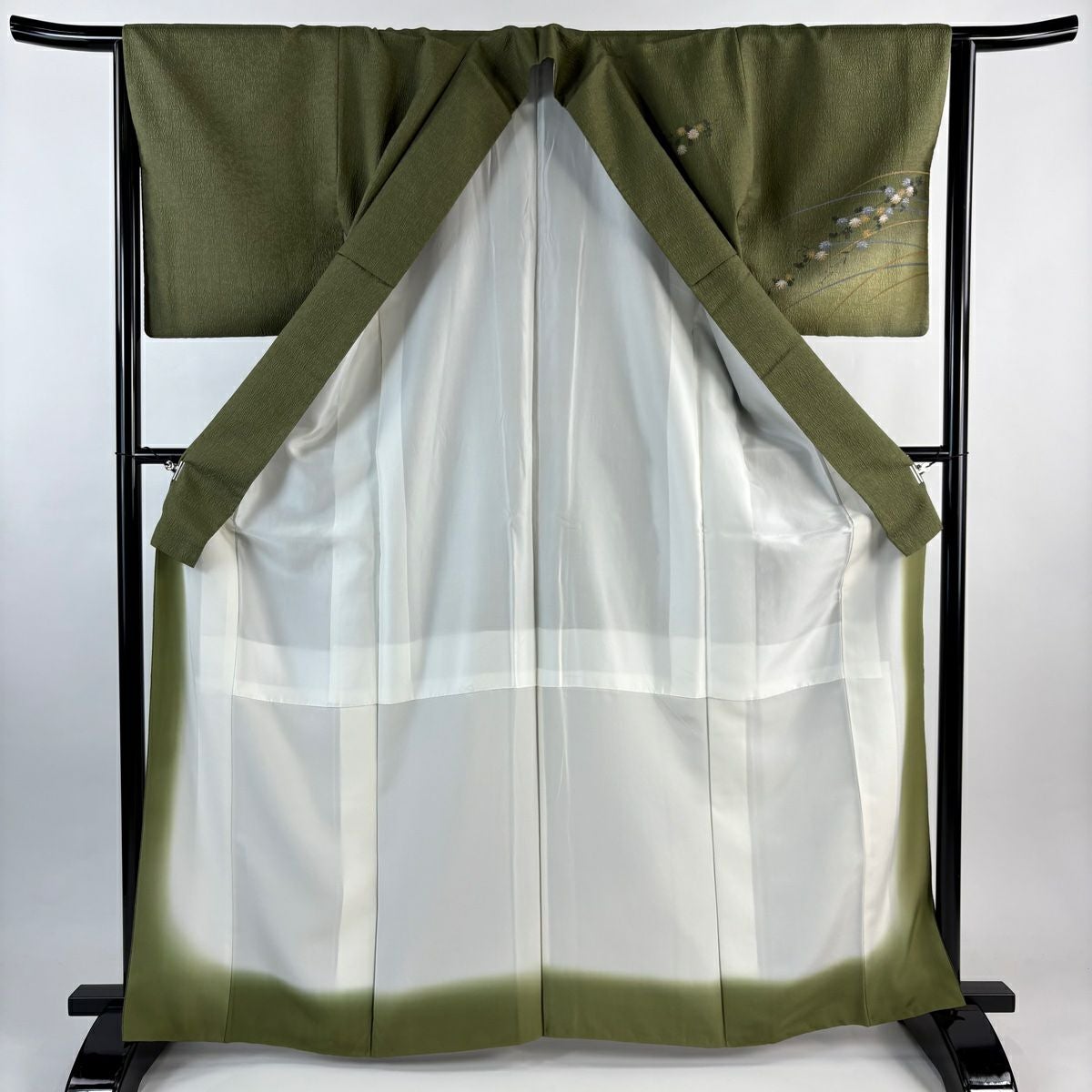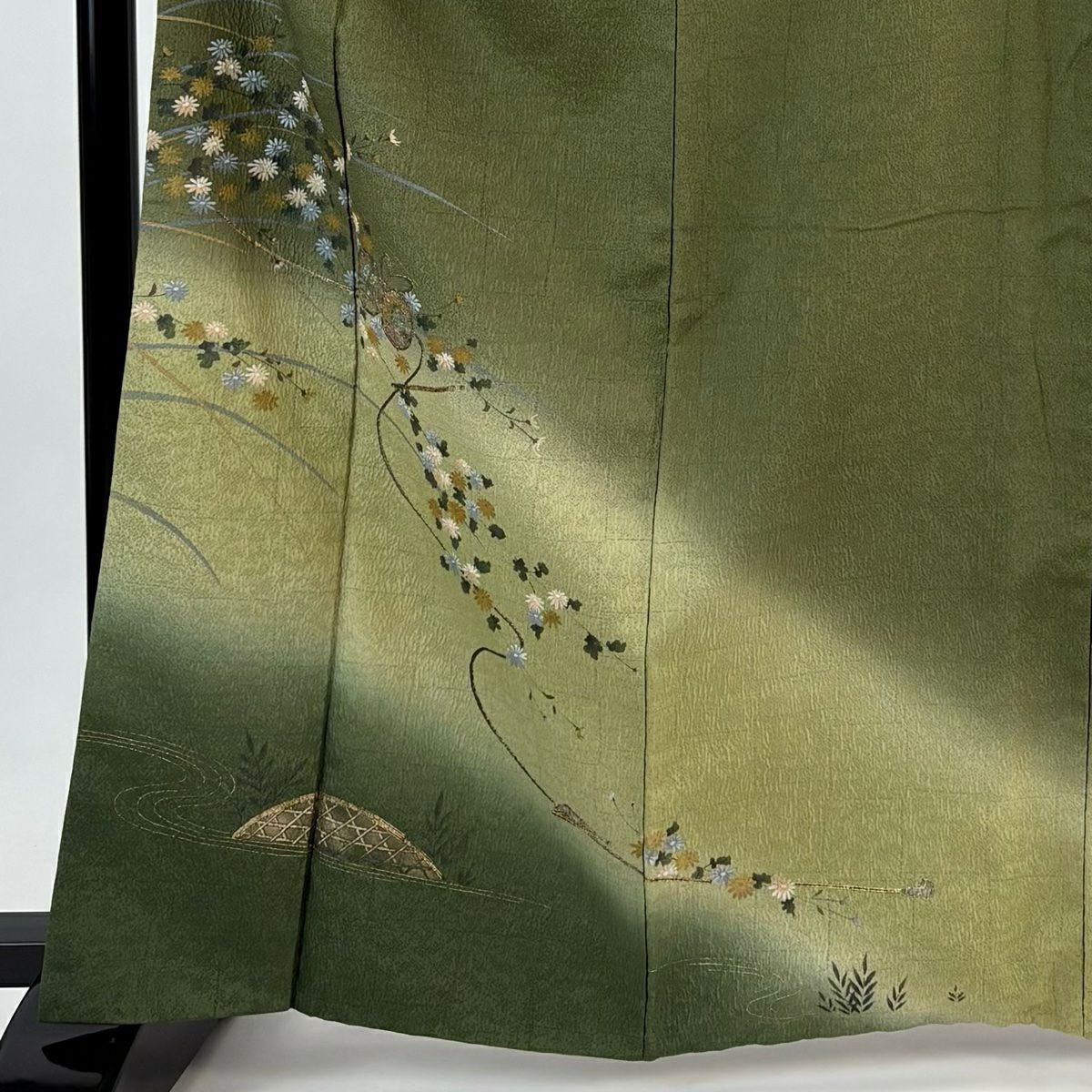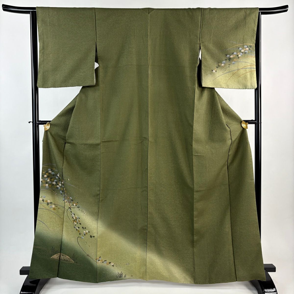 【在庫一掃】 訪問着 身丈155.5cm 裄丈65.5cm M 袷 秋草 流水 金銀彩 染め分け よもぎ色 正絹 秀品