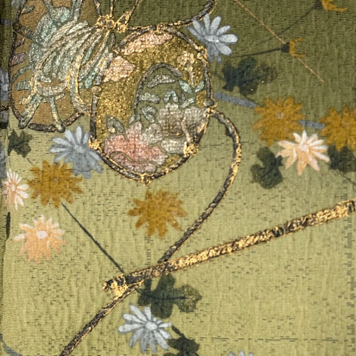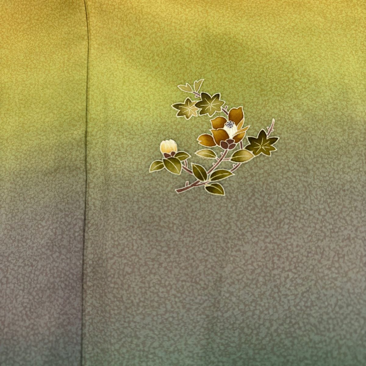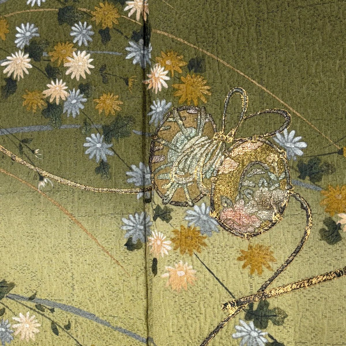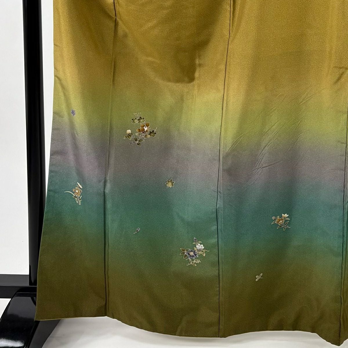【在庫一掃】 訪問着 身丈155.5cm 裄丈65.5cm M 袷 秋草 流水 金銀彩 染め分け よもぎ色 正絹 秀品